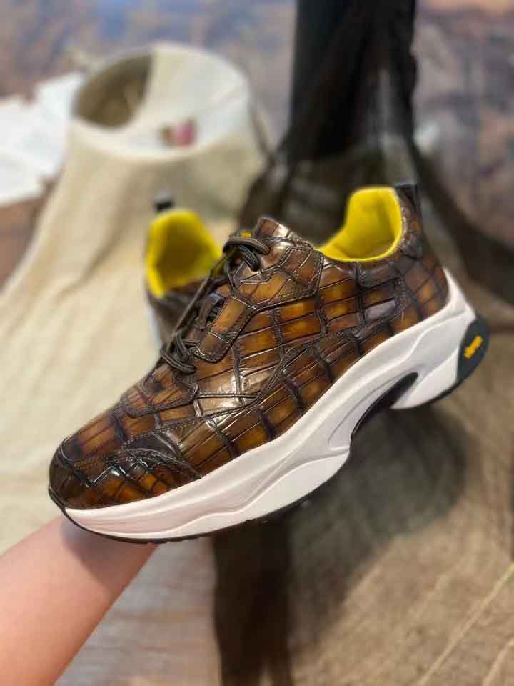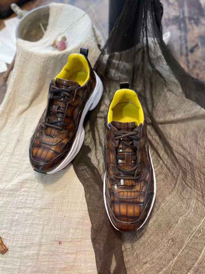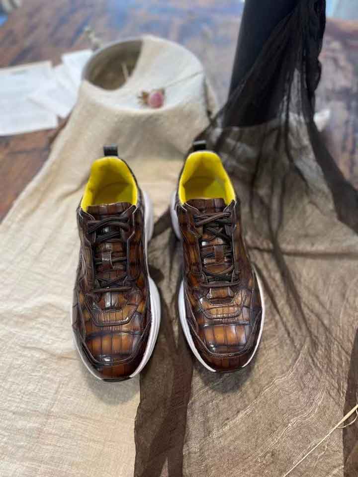 尼罗鳄鱼皮休闲运动鞋,采用羊皮内里,意大利vibram大底,patina擦色工艺,琥珀黄色鞋我是这条街上最潮的人。
