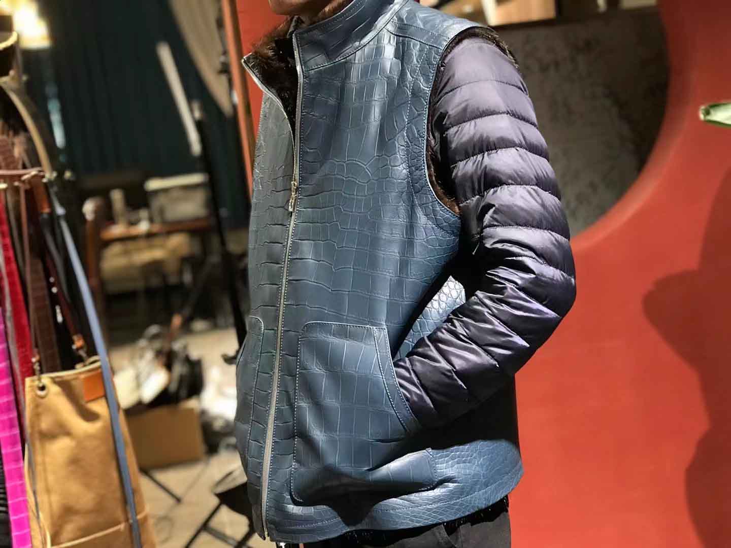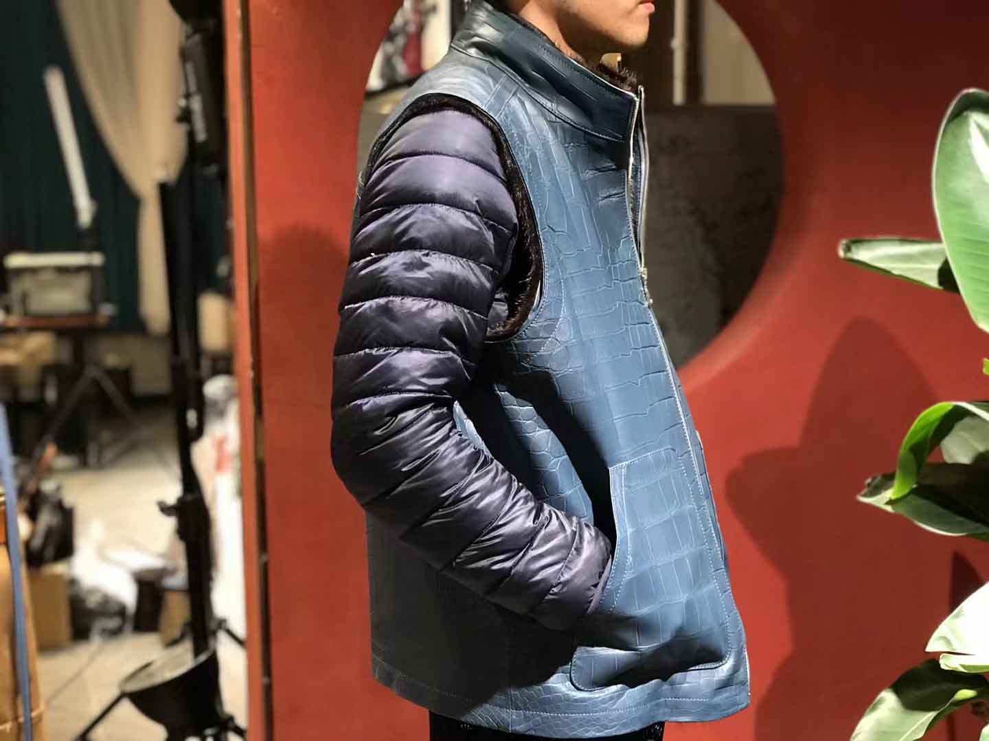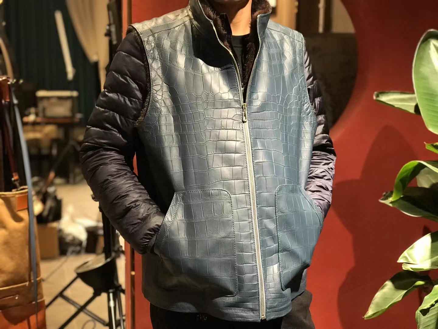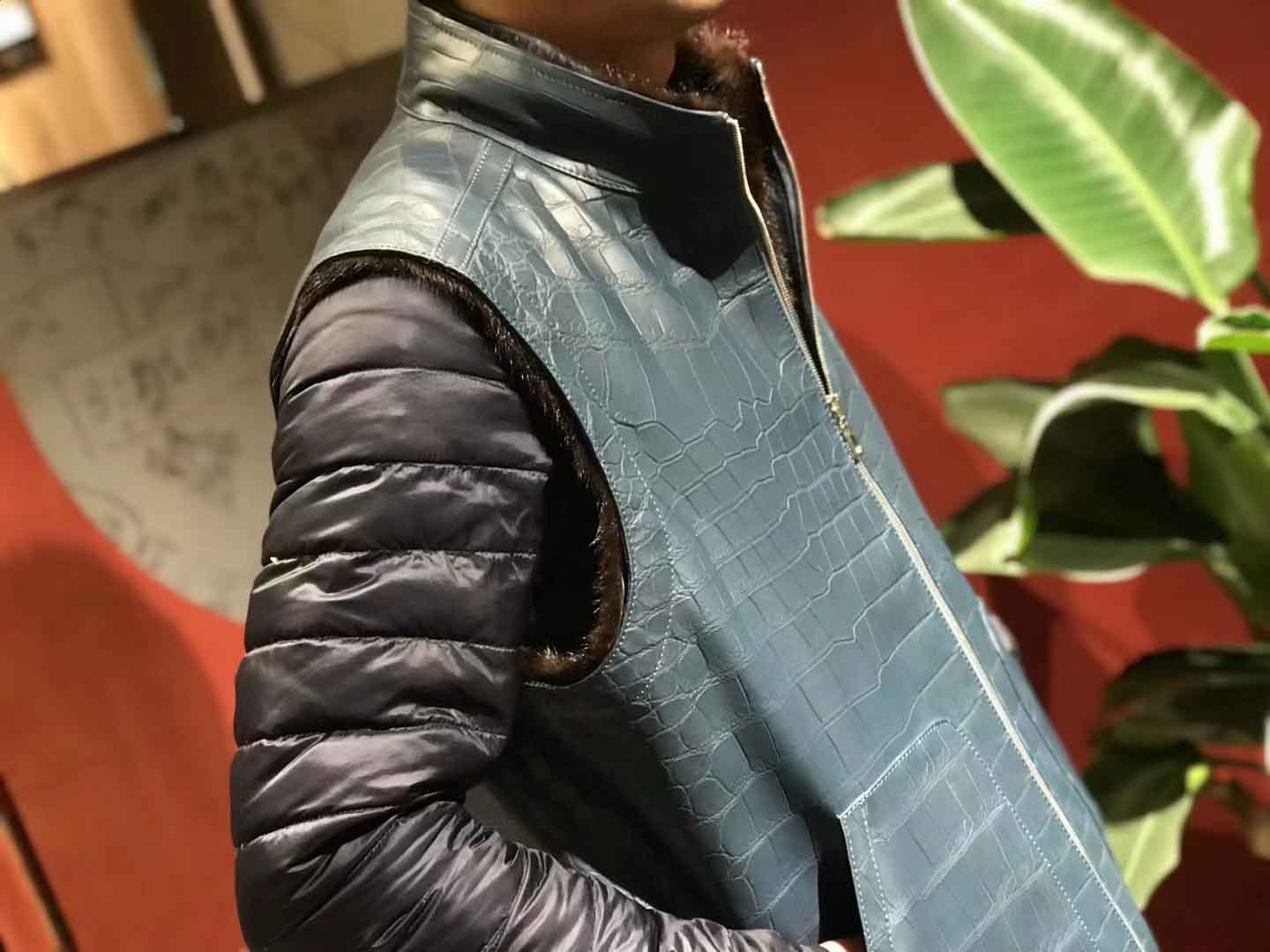 蓝色鳄鱼皮马甲和水貂衣服订做厂家