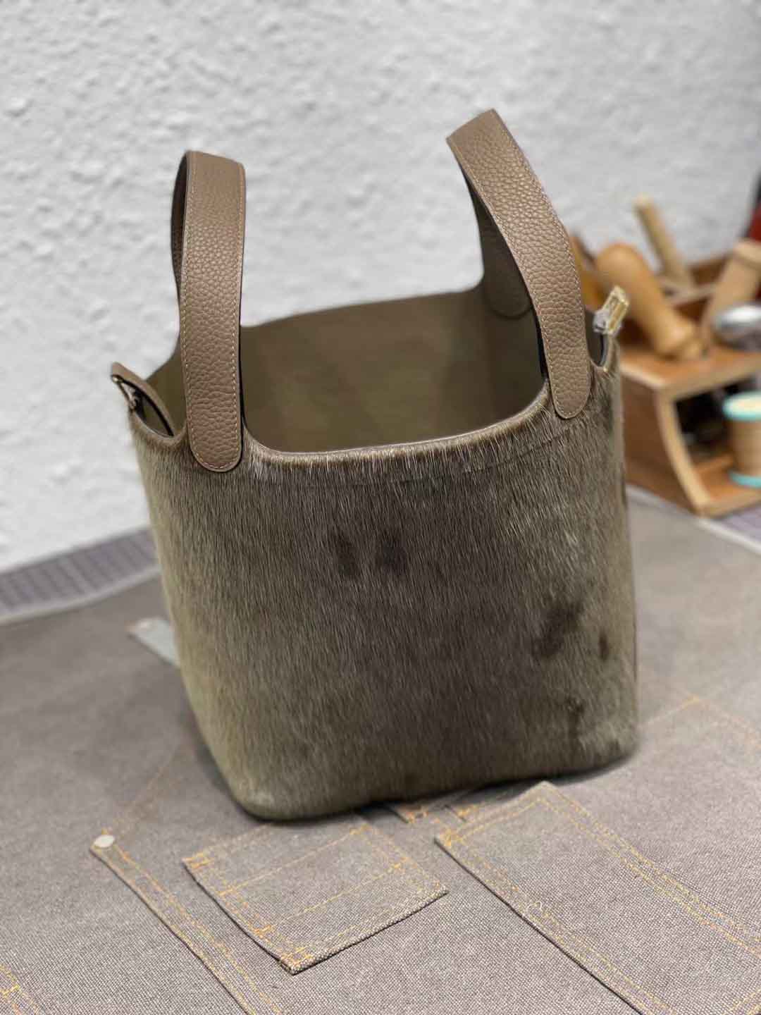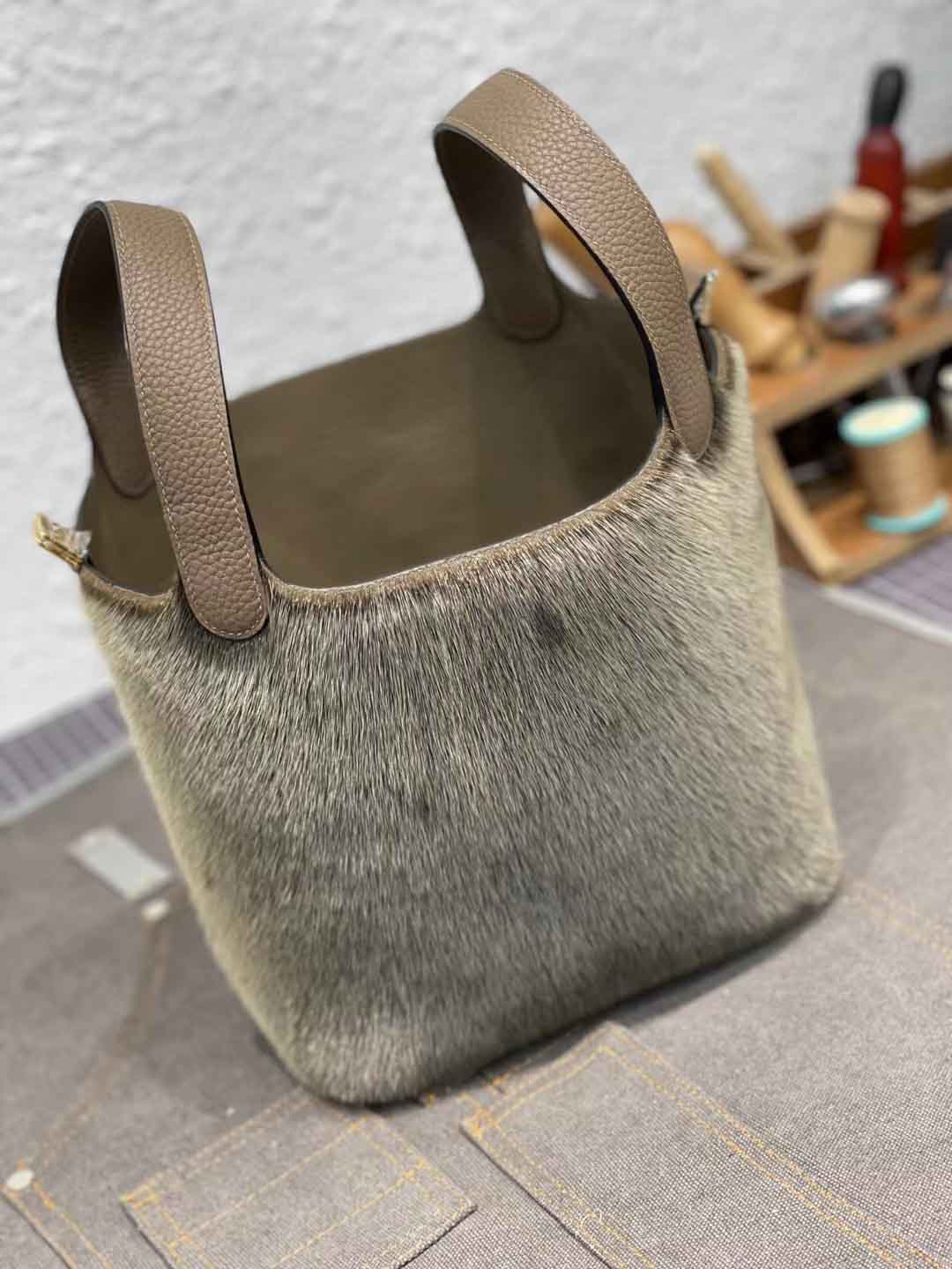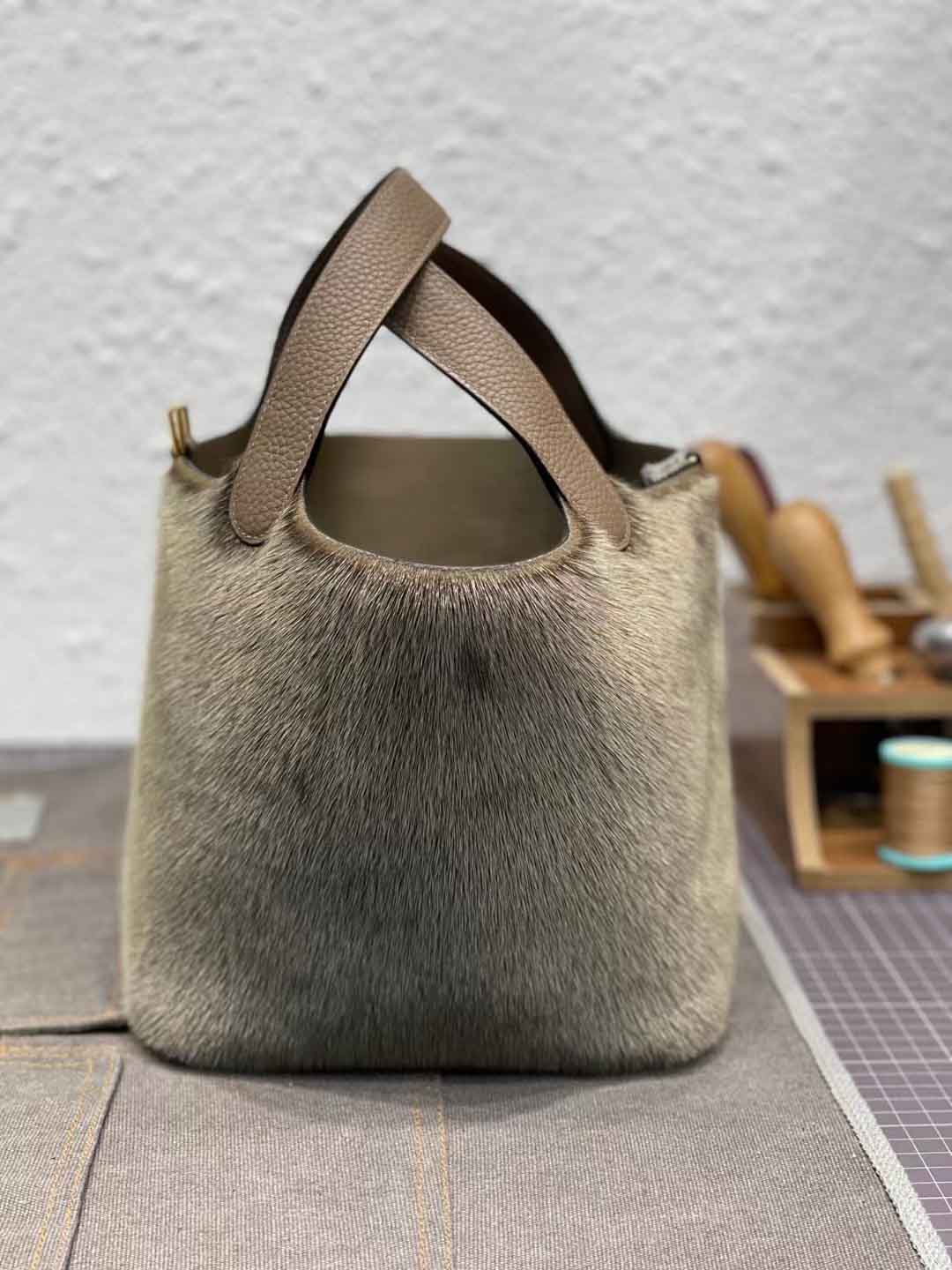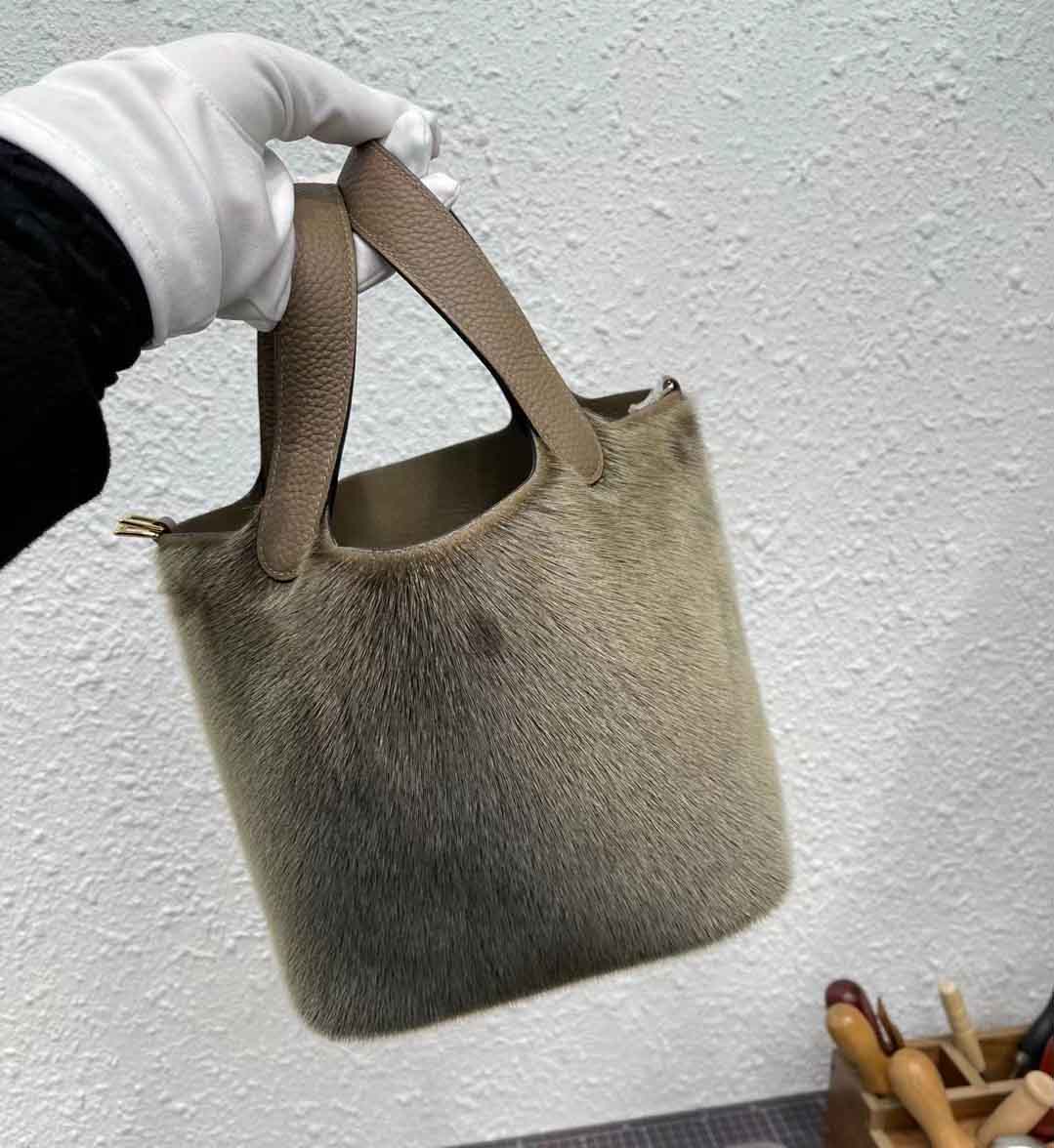 王炸 气质拿捏的稳稳的 冬季毛绒菜蓝包18cm 超软绵细腻的海豹皮毛拼大象灰togo皮 纯手工缝制 金扣 现货一枚
