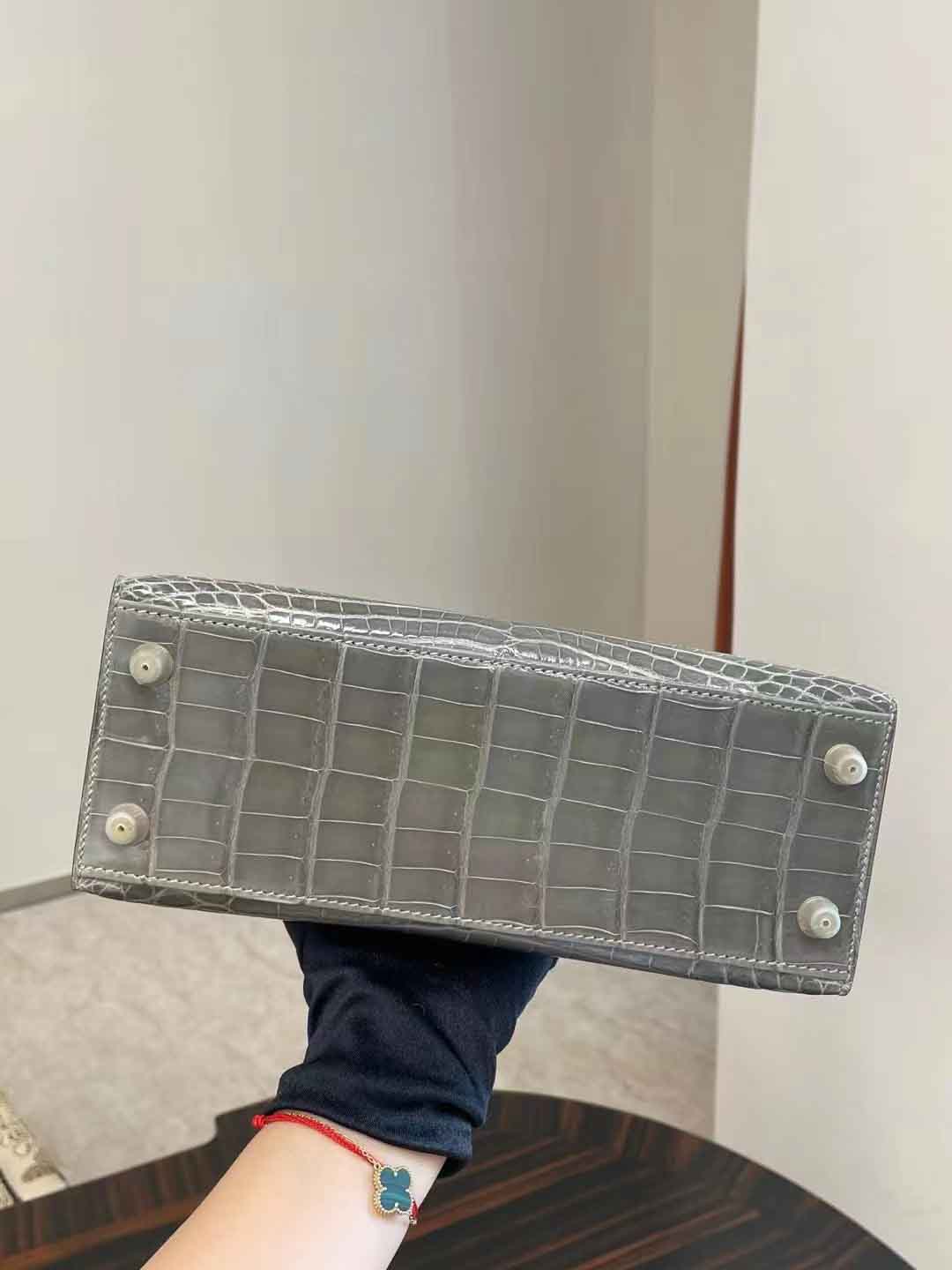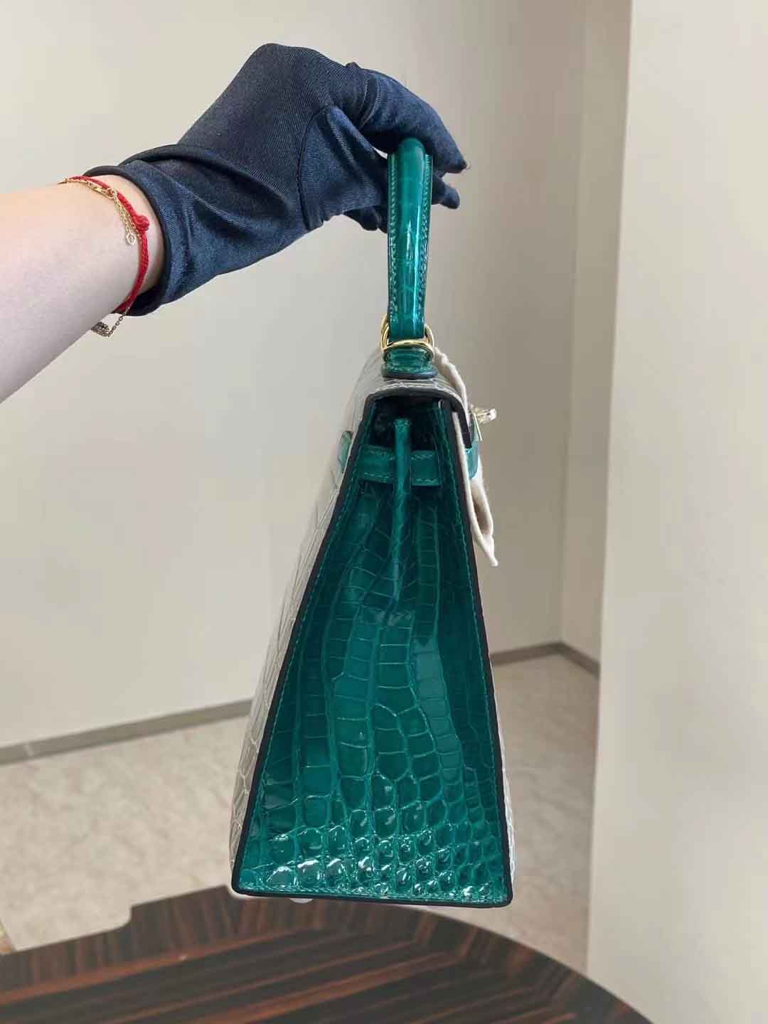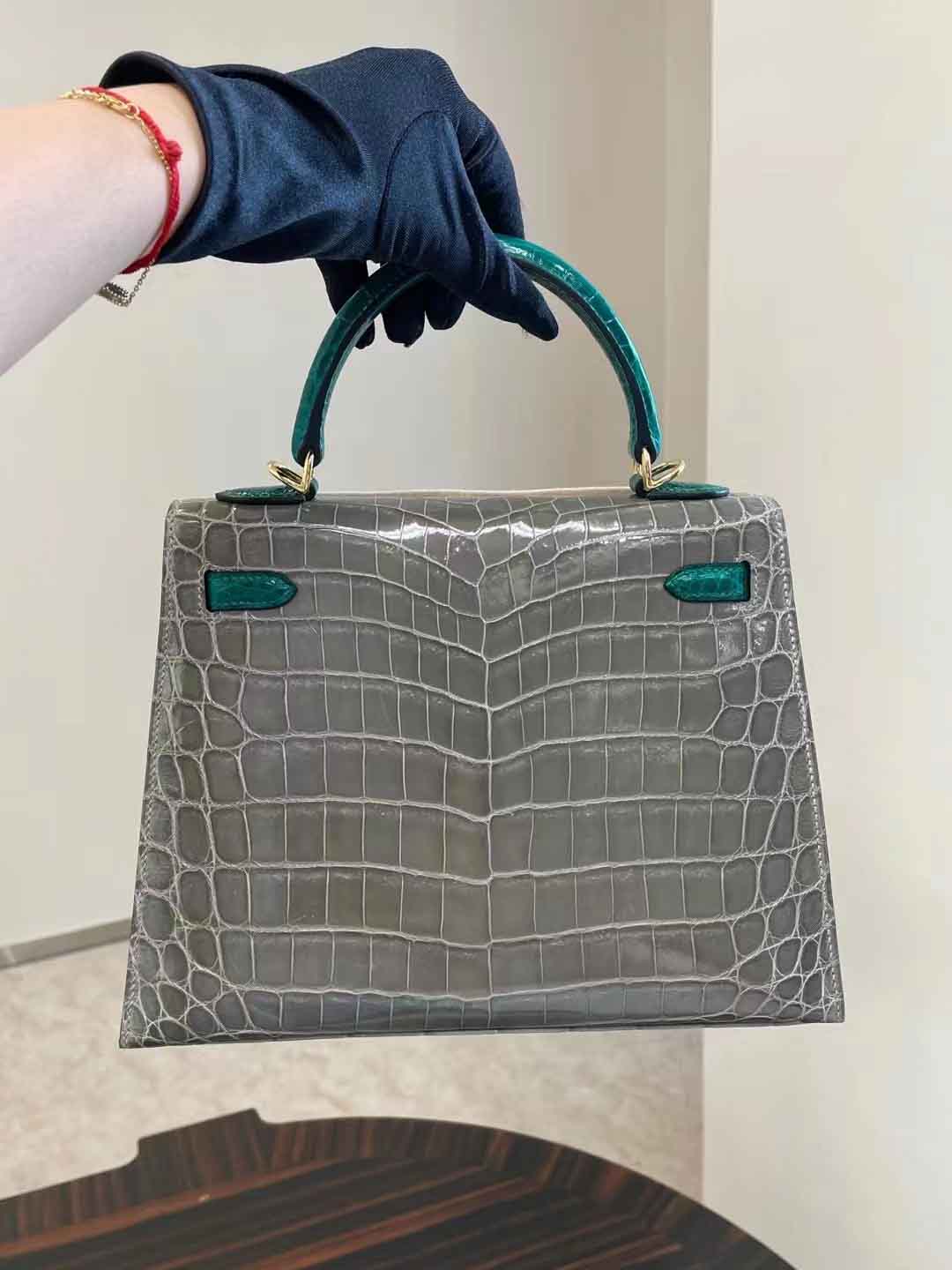 Kelly25 Cro 鳄鱼皮 手工蜡线缝制 斑鸠灰配翡翠绿 金扣 客订 ️ ️