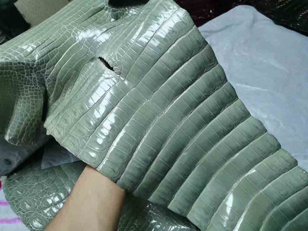 高光尼罗灰绿色鳄鱼皮料订做厂家,定做自己喜欢颜色的鳄鱼皮。也可以订制自己喜欢款式的鳄鱼皮皮具。