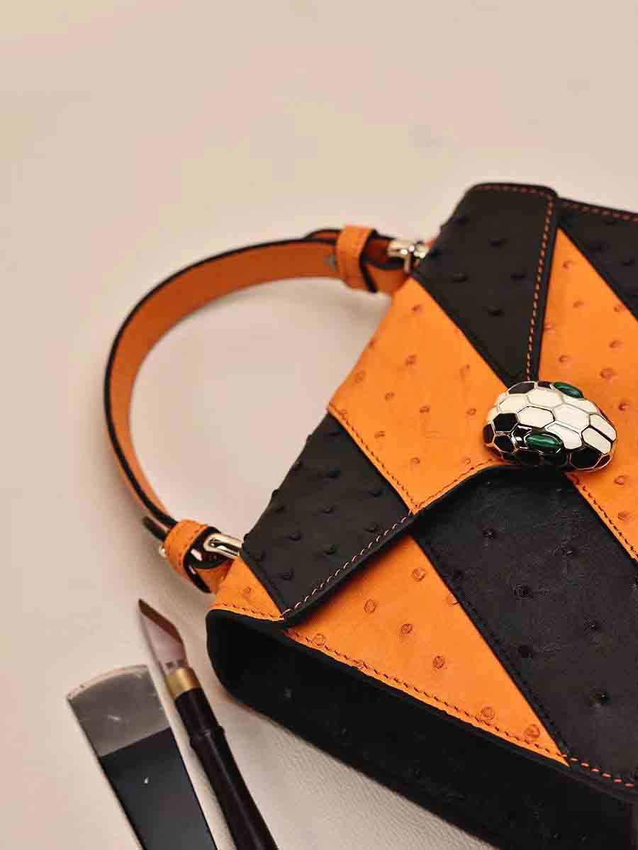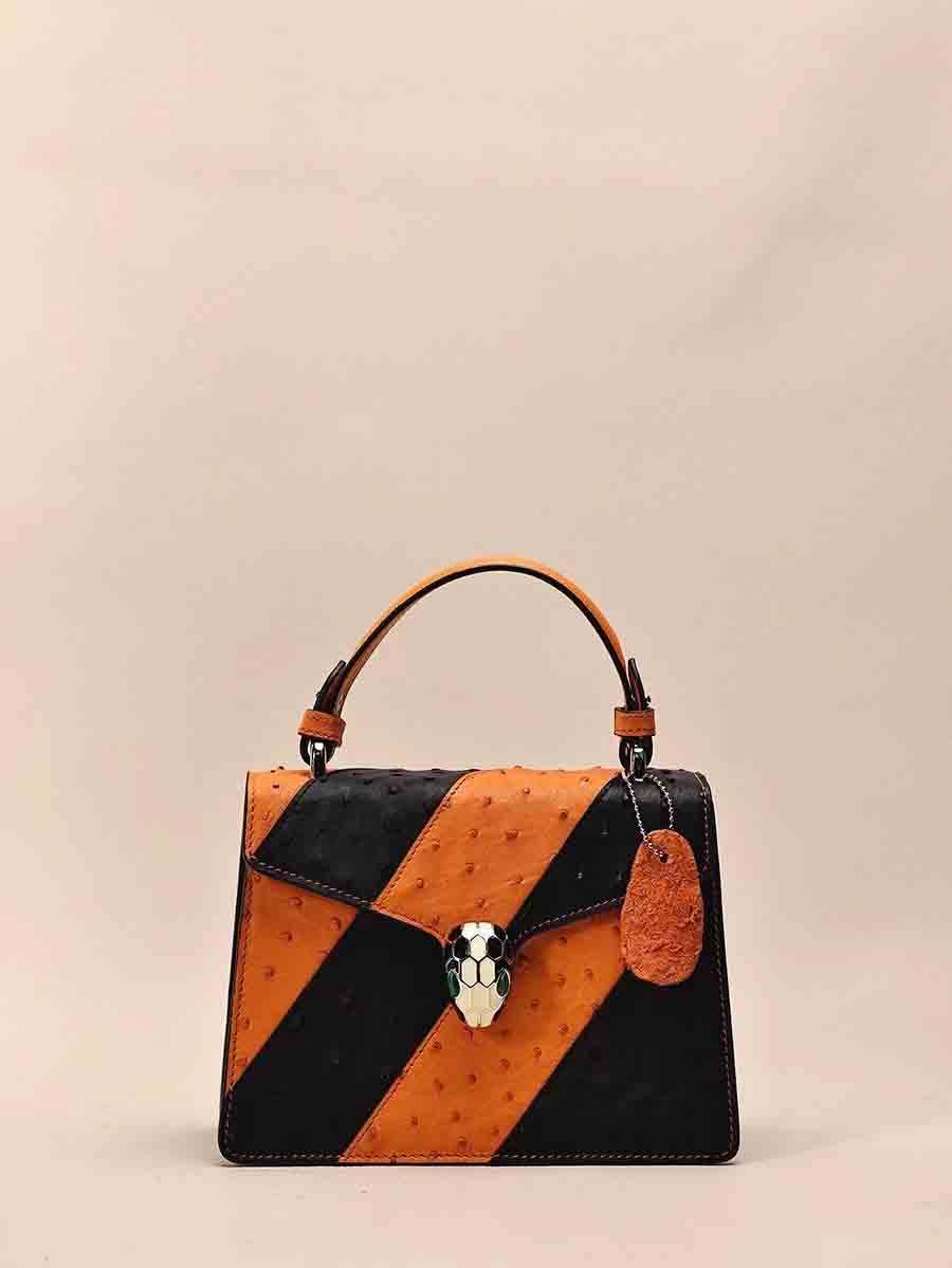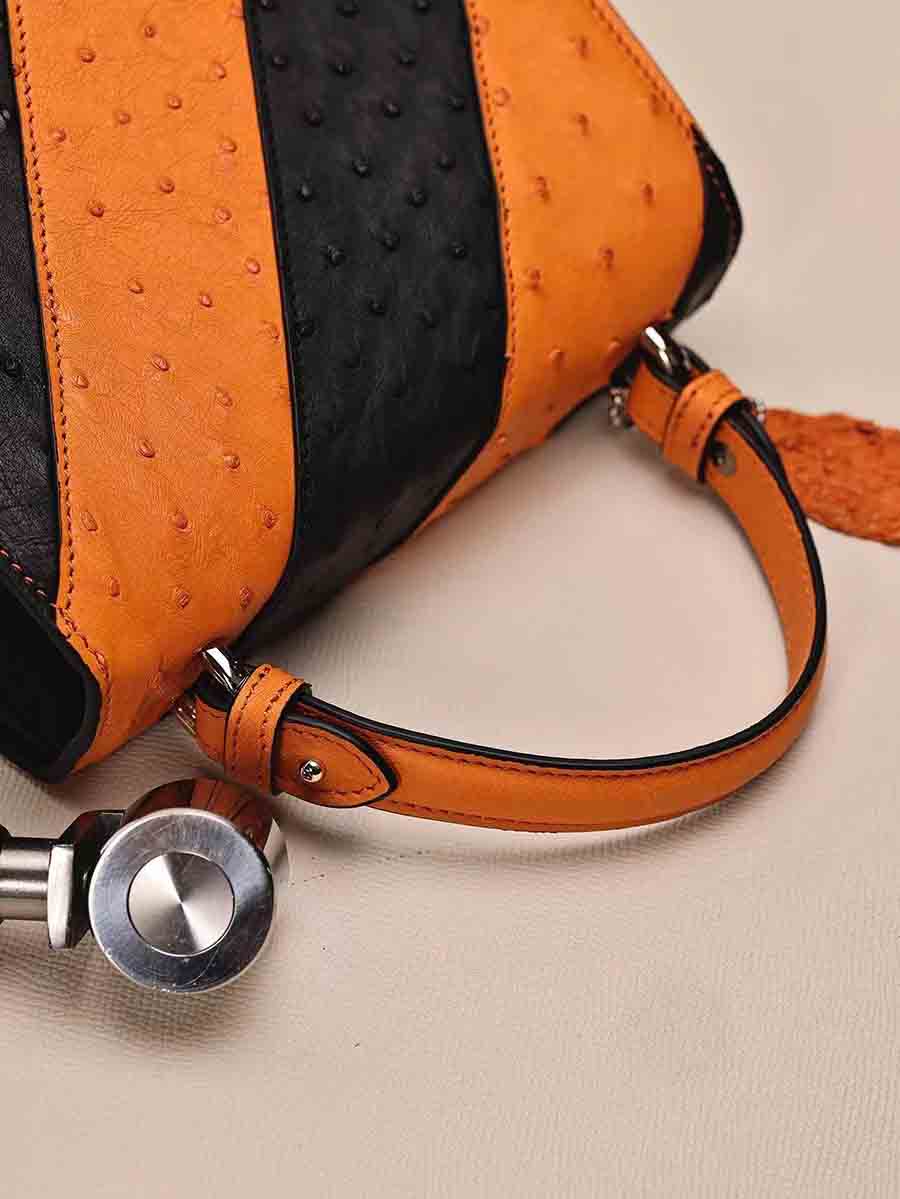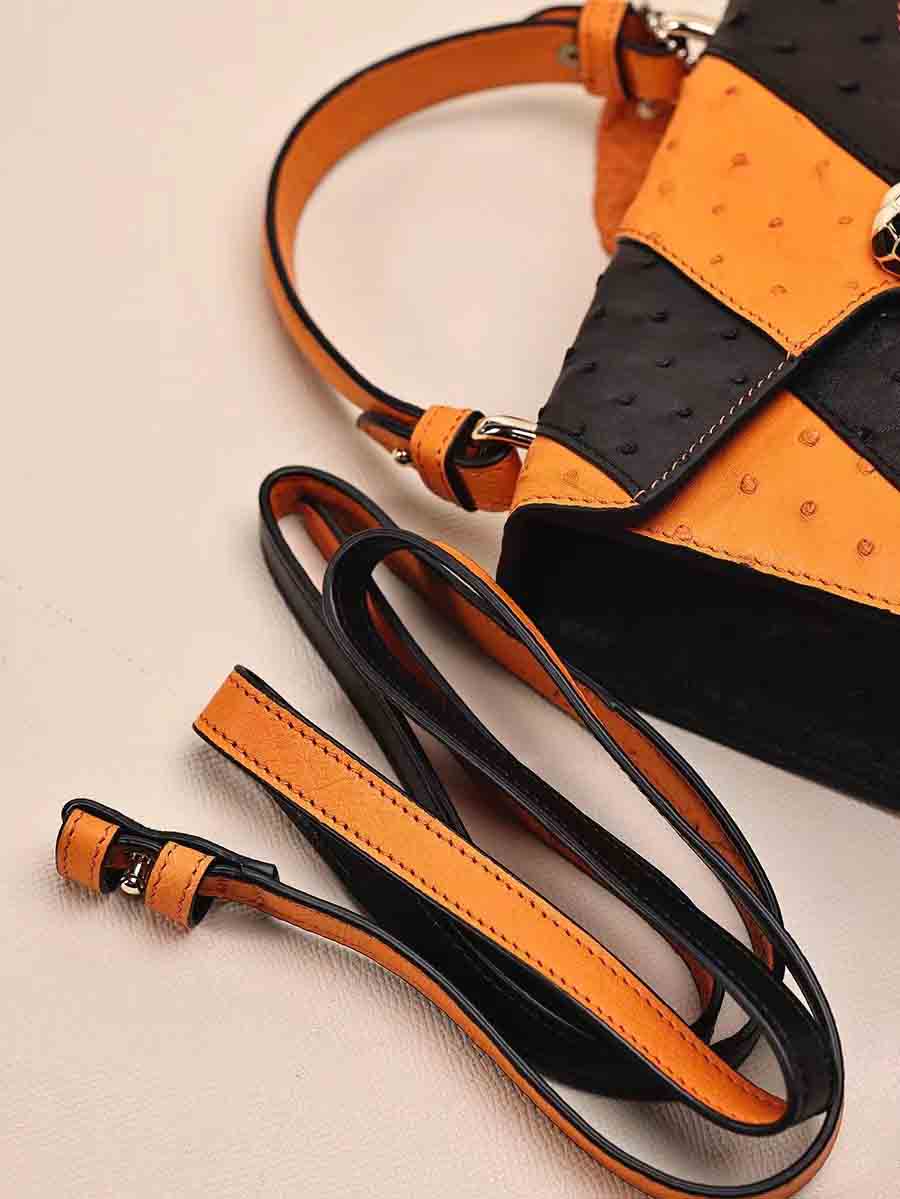 撞色鸵鸟皮 橙色+黑色 女士手提单肩包