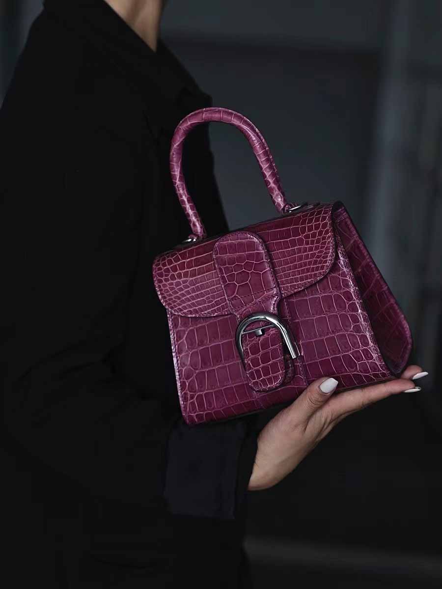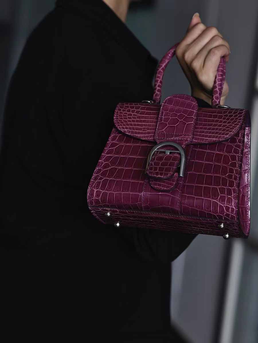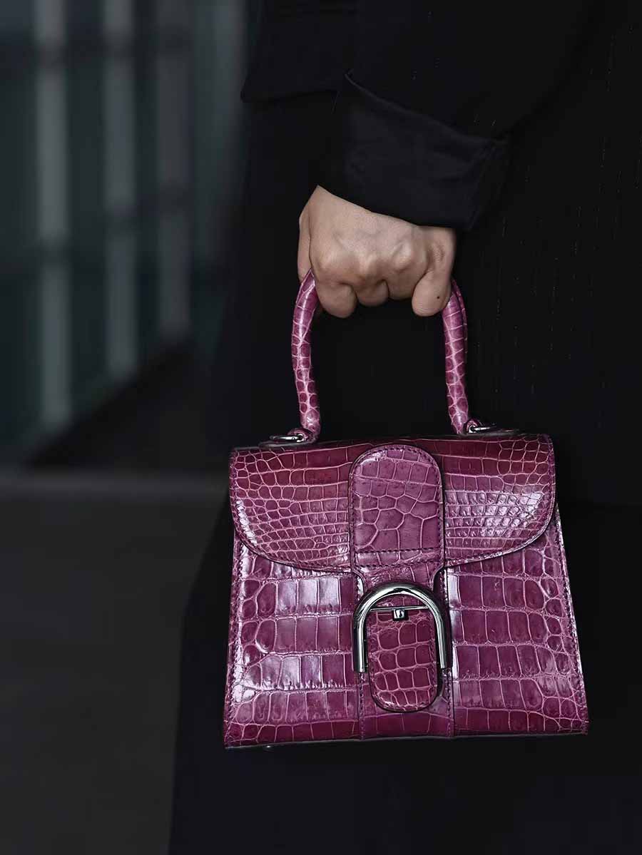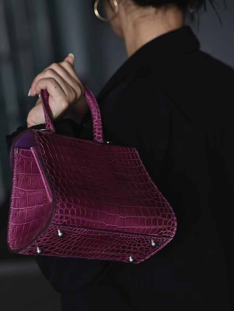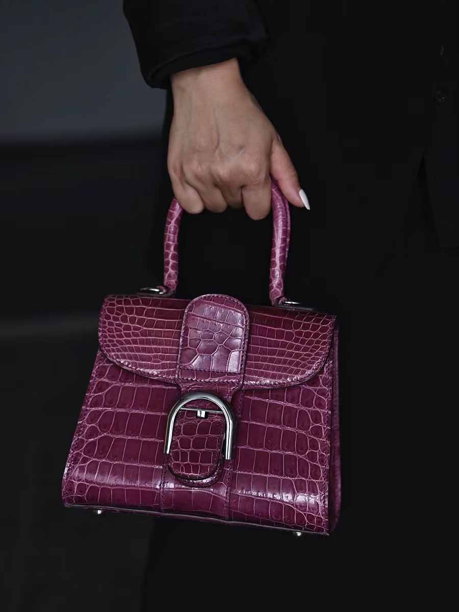 亮面鳄鱼葡萄紫 奇特的是这只包包是雾面拼亮面的鳄鱼皮。包盖和背部是亮面鳄鱼。实物拿到只能赞叹包包的工艺之精湛。mini 银扣。