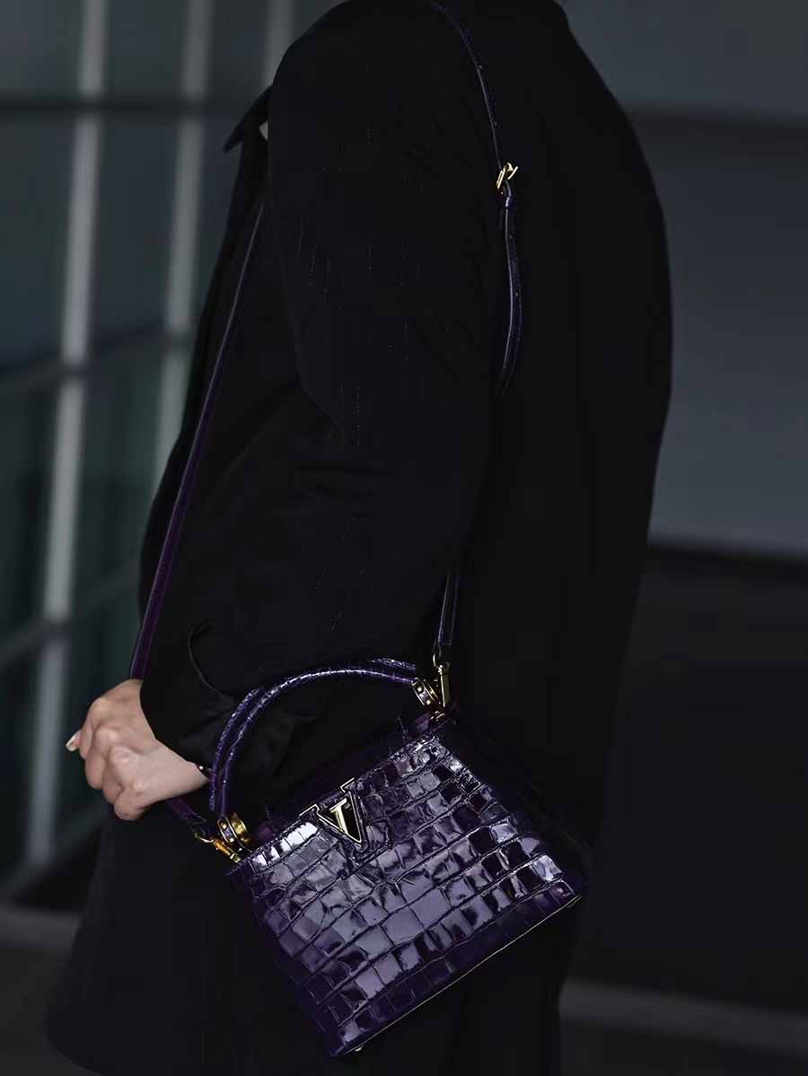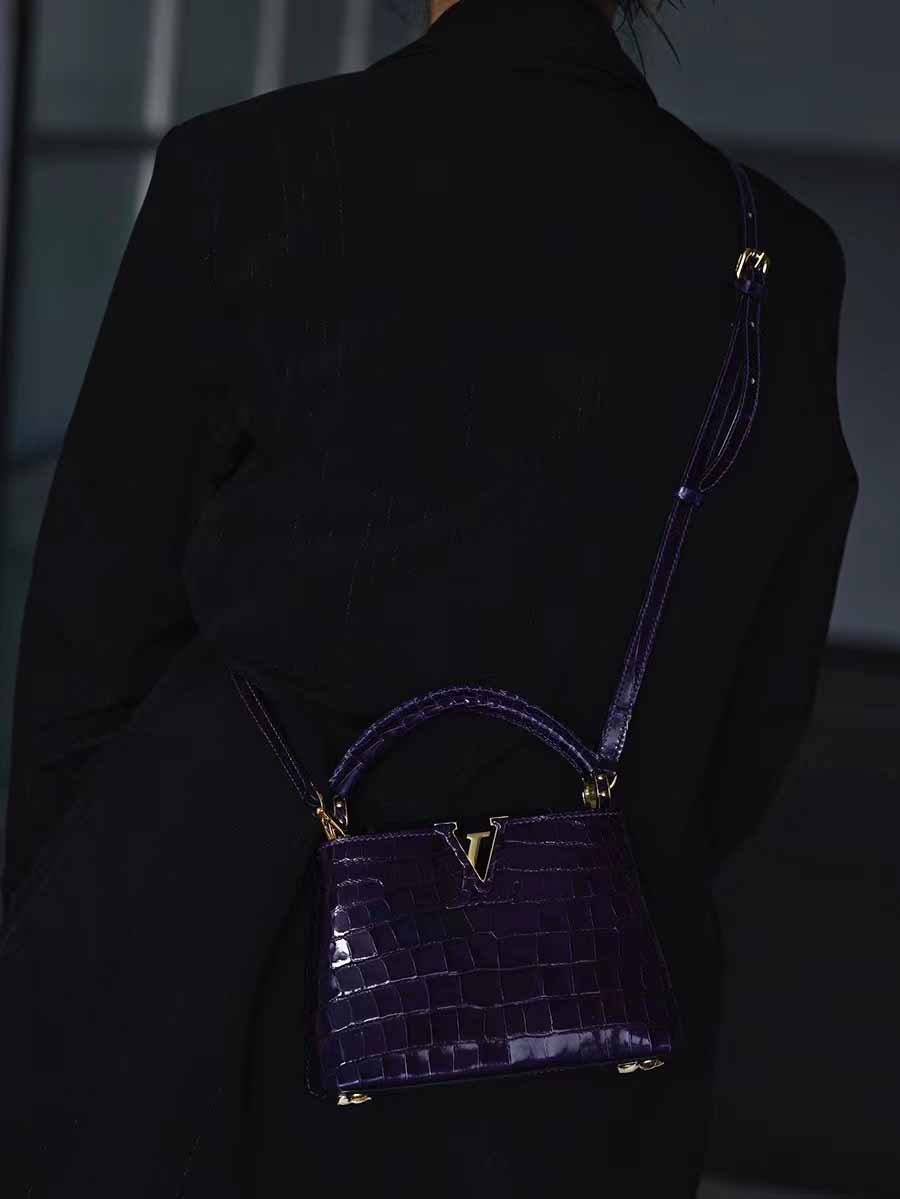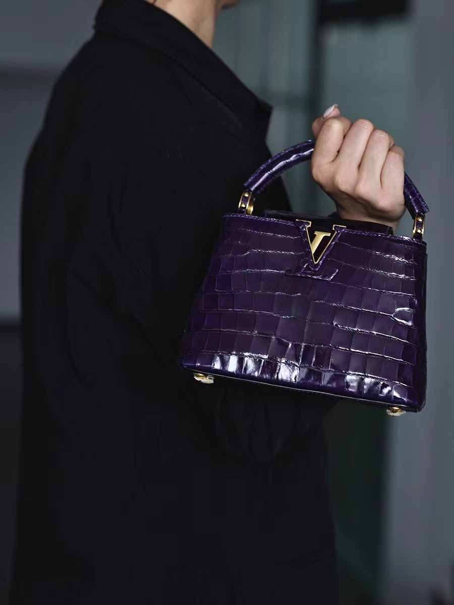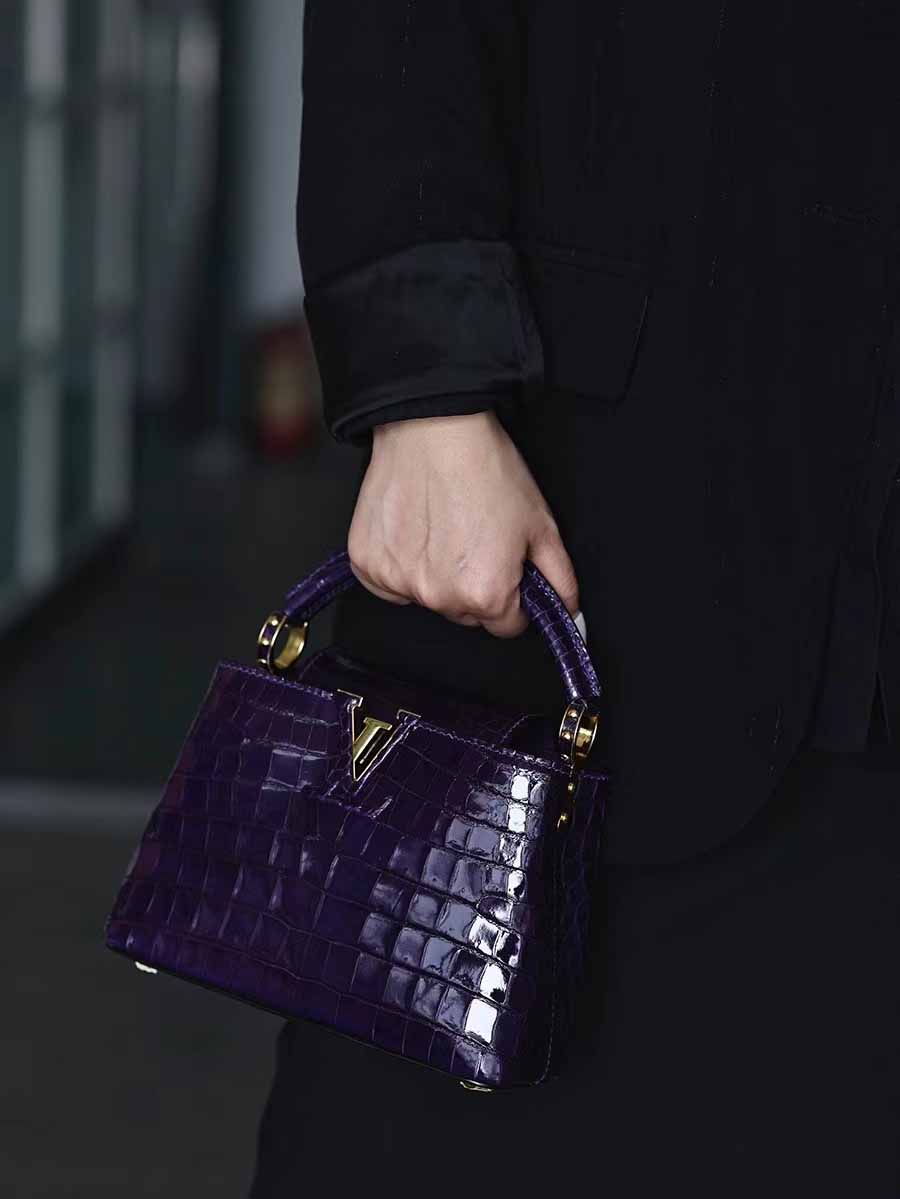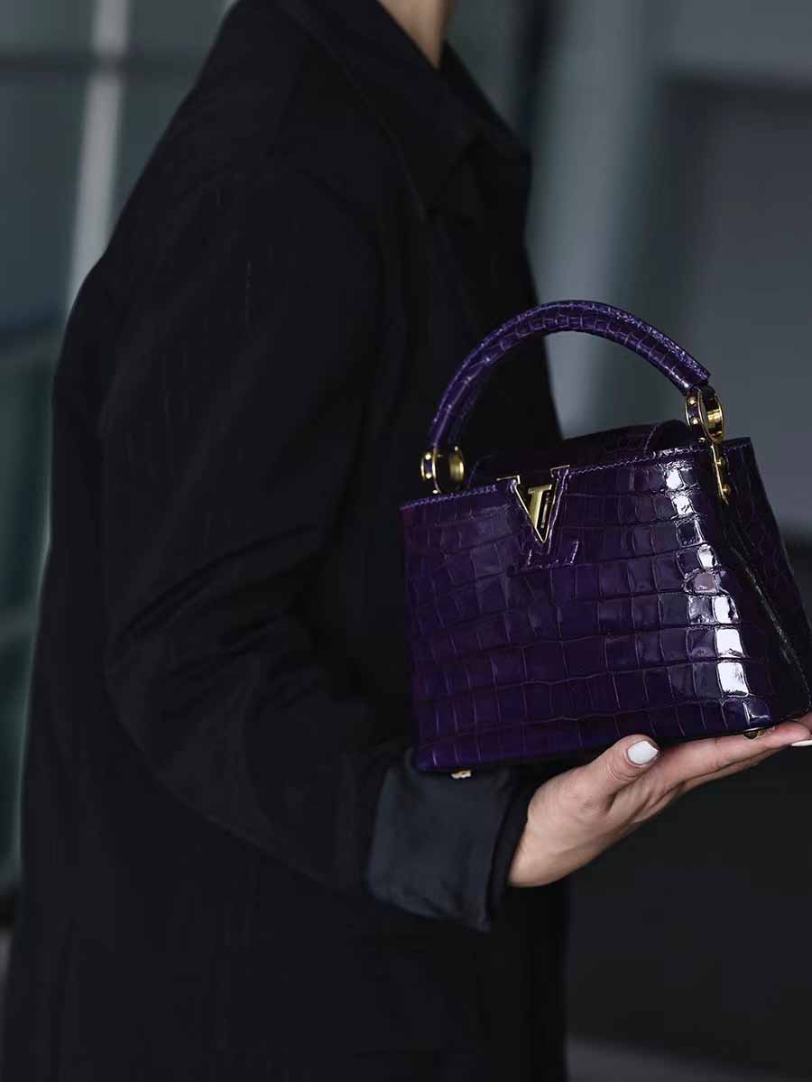 高光鳄鱼皮深紫色capucines mini 金扣