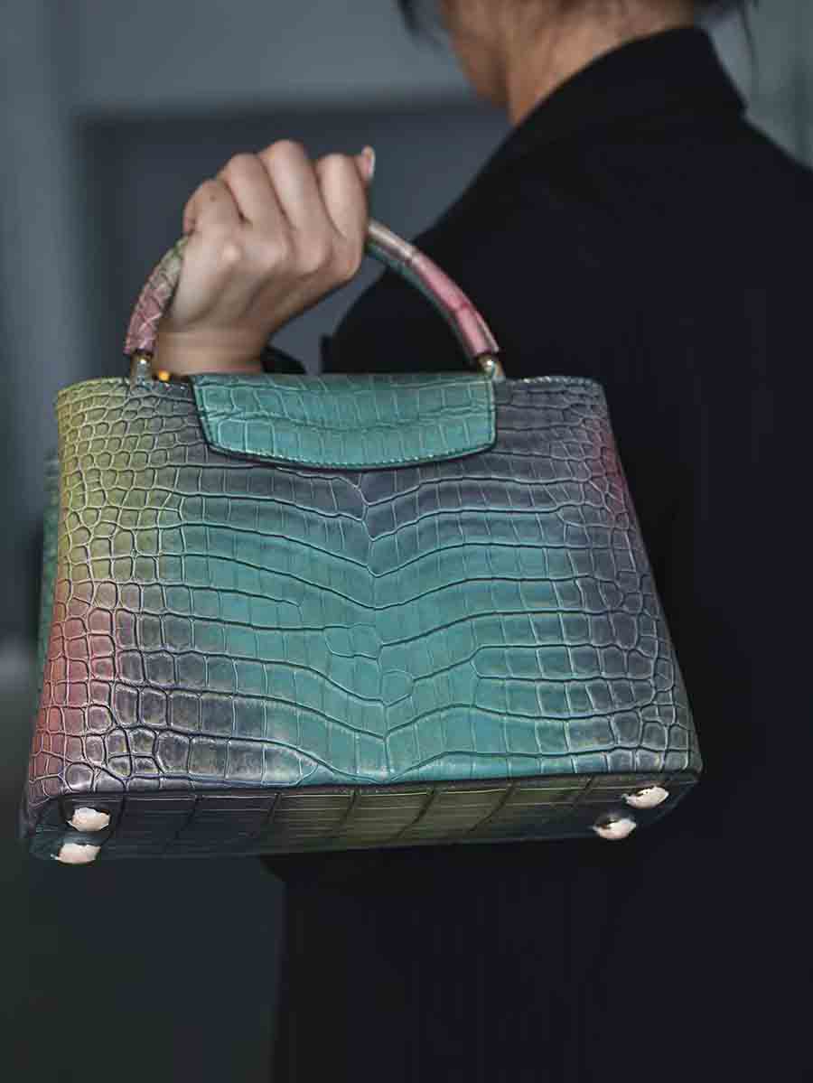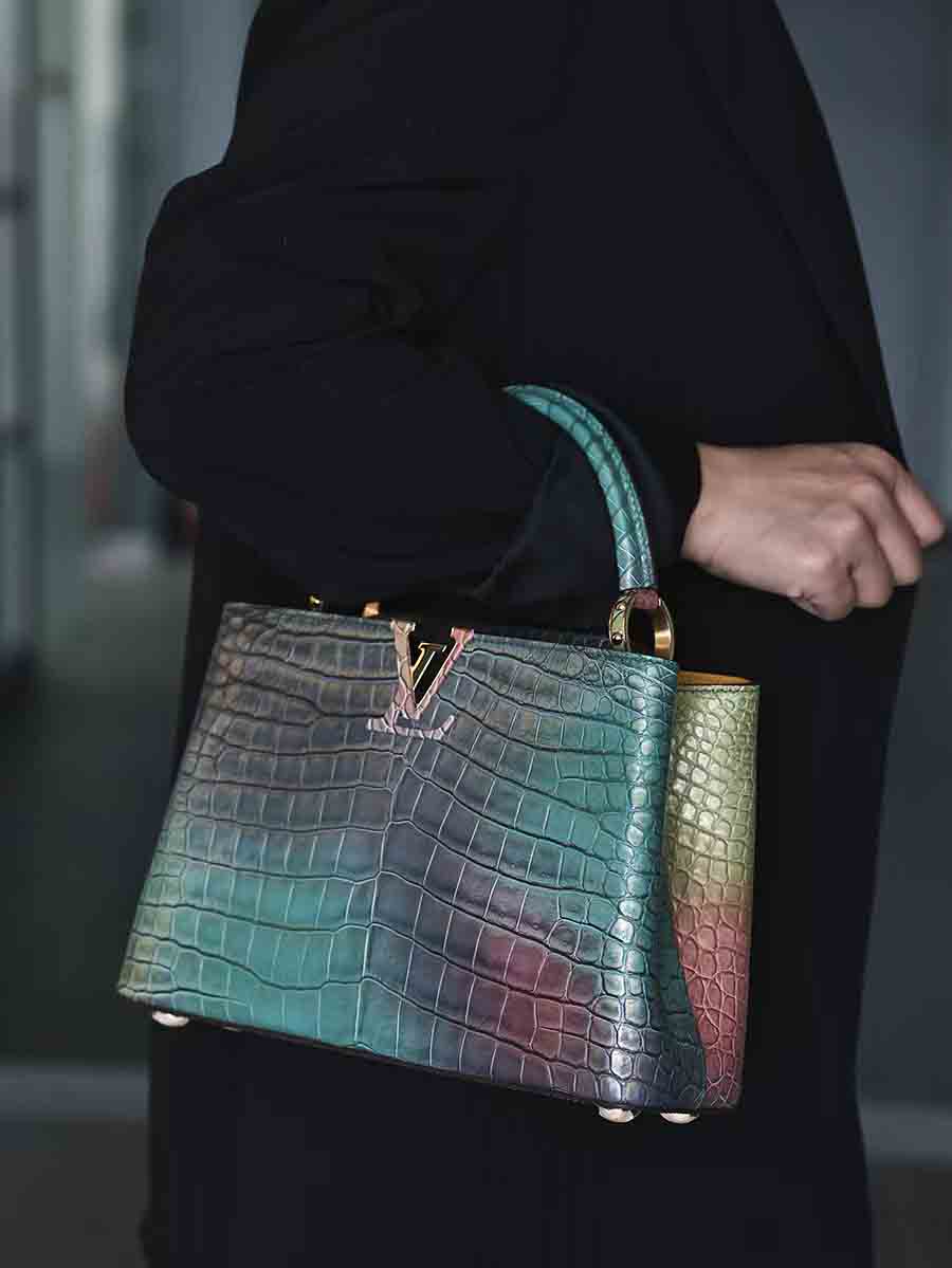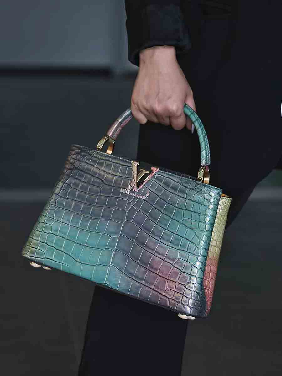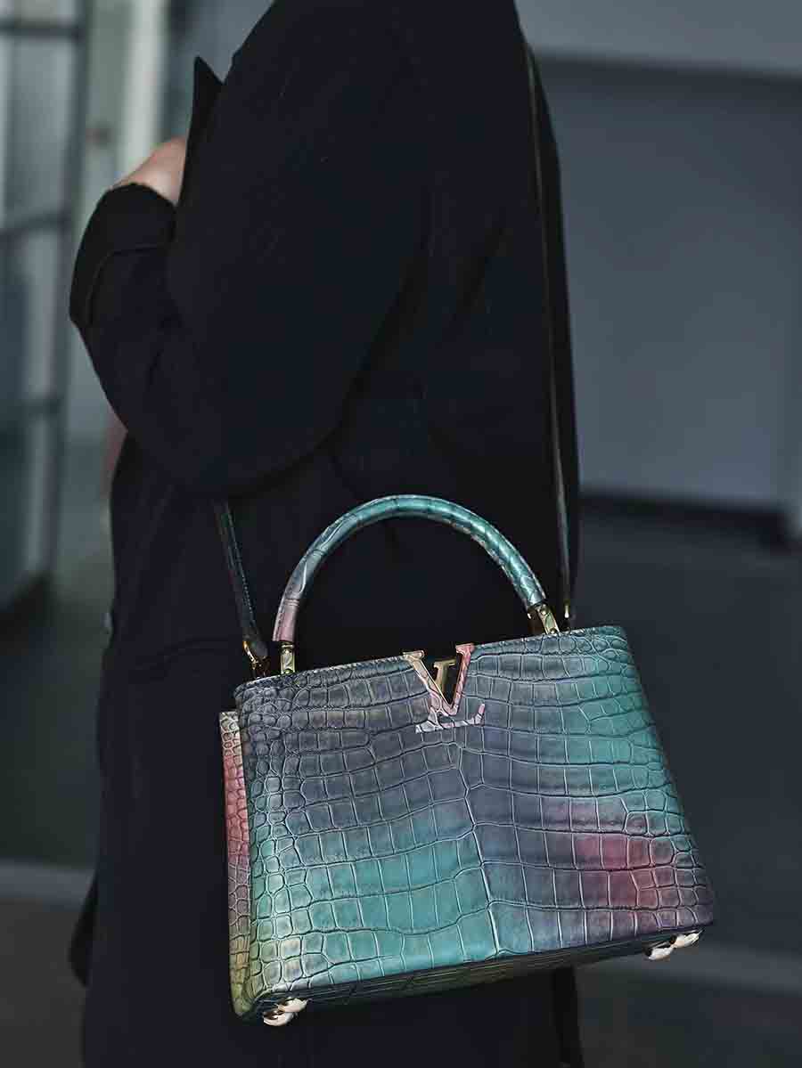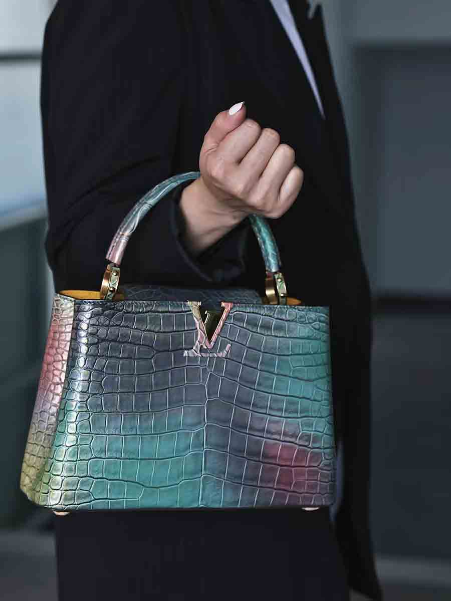 Capucines系列选用最顶级兴隆鳄鱼皮 leather,展现极细致、天然的皮革纹路,再经过250道工序打造而成,长时间使用皮革触感变得柔软,而手袋上的LV Initials金属装饰为最大特色。