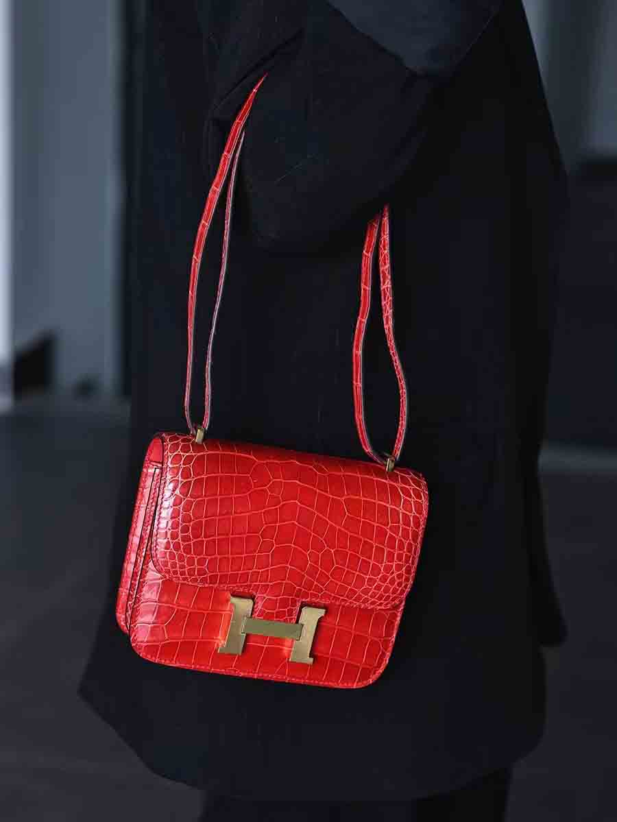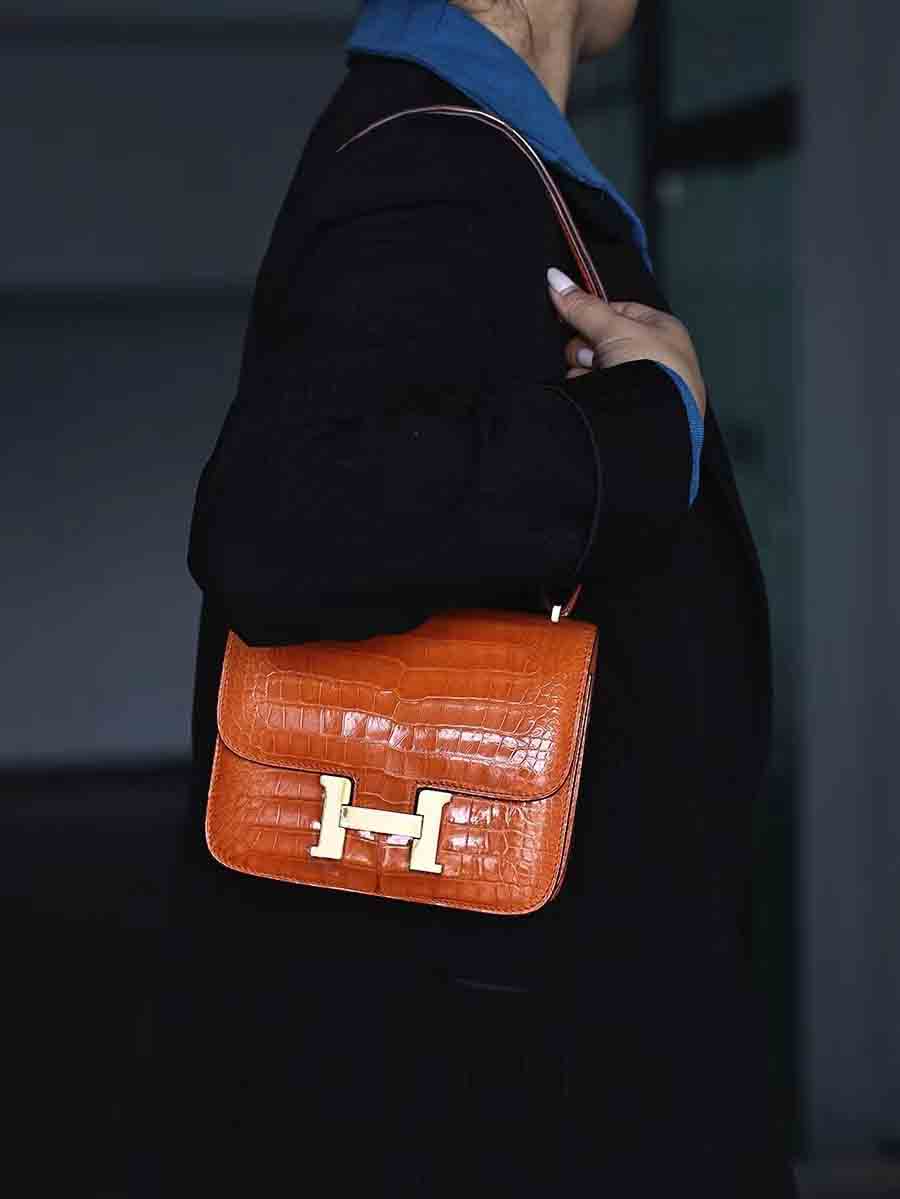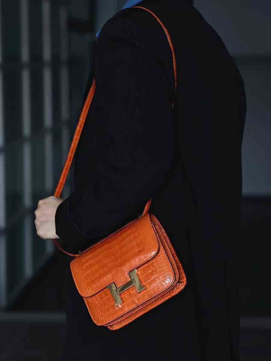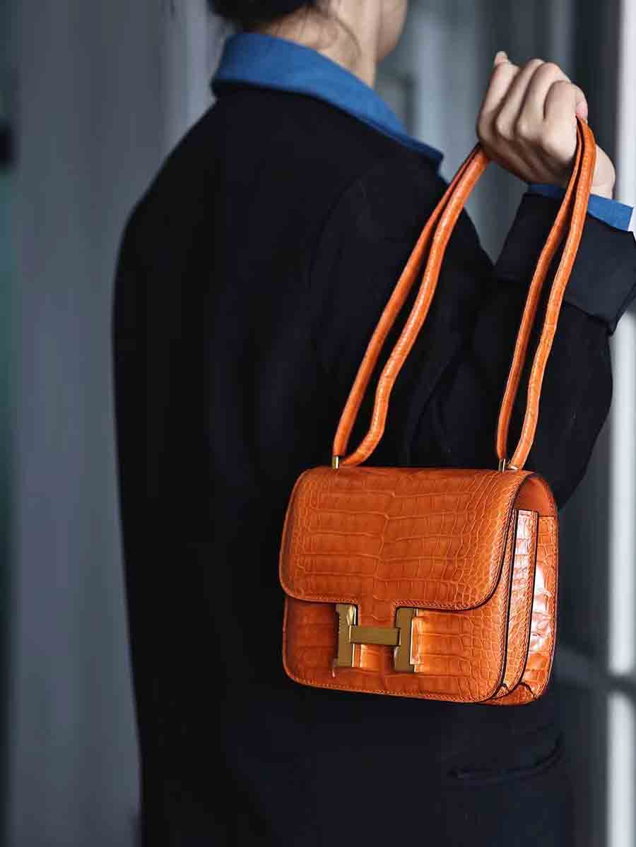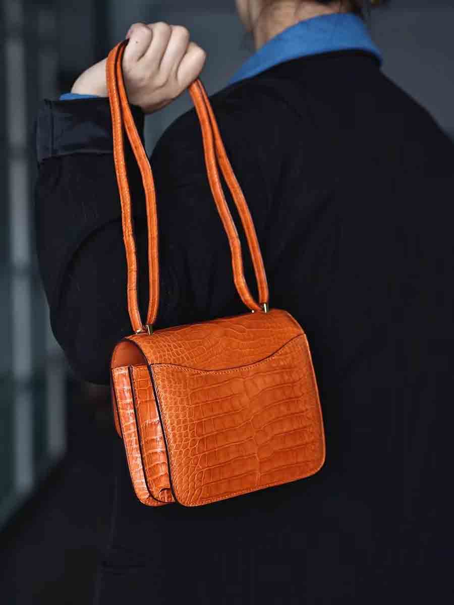 高光爱马仕橙 康康19cm 金扣,空姐康康包19cm鳄鱼皮康斯坦h家女包手工蜡线