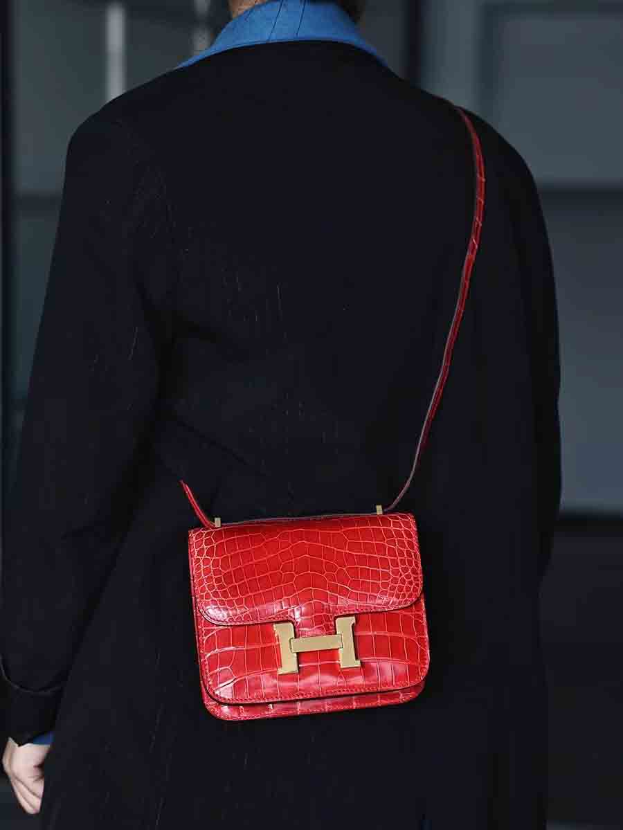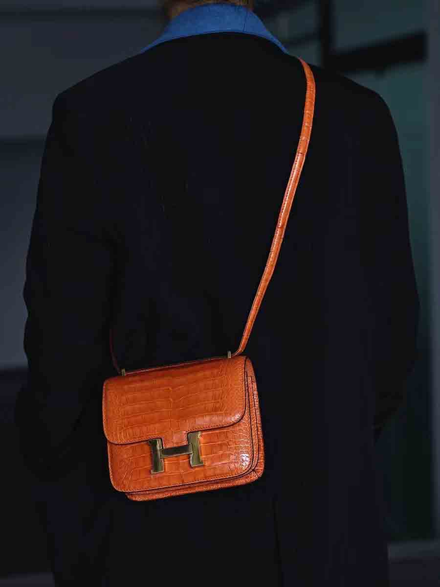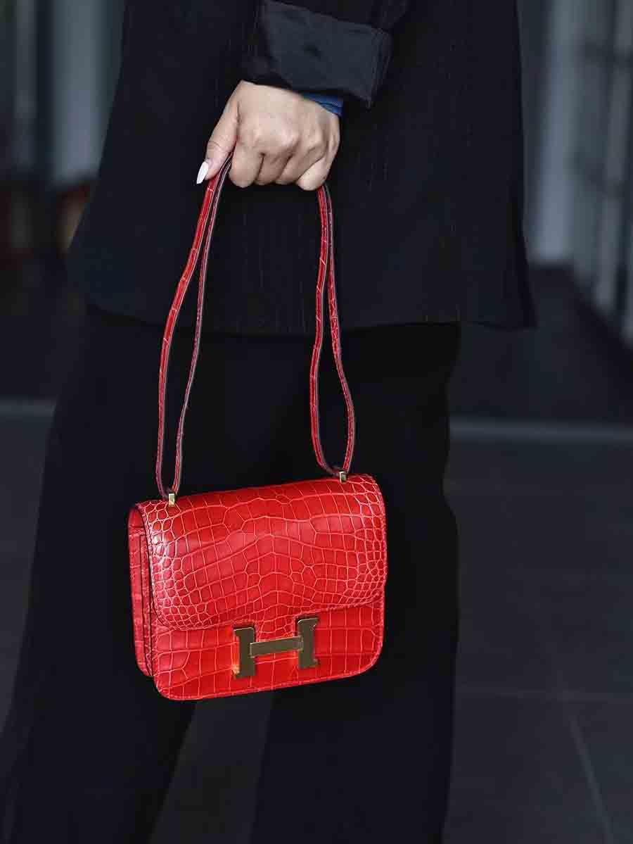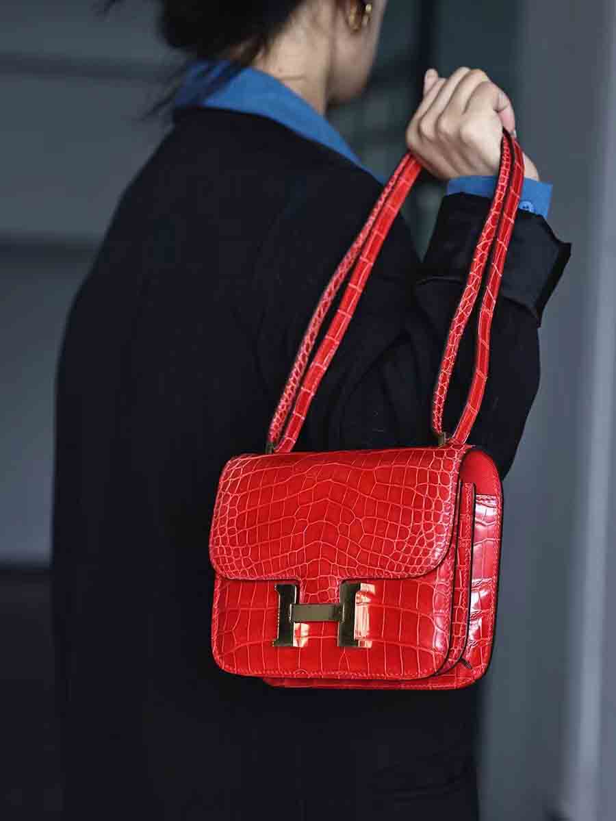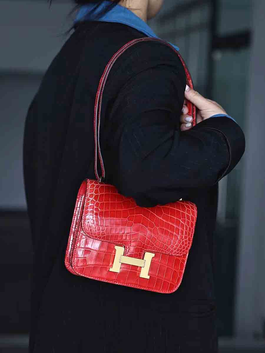 高光爱马仕橙 康康19cm 金扣,空姐康康包19cm鳄鱼皮康斯坦h家女包手工蜡线