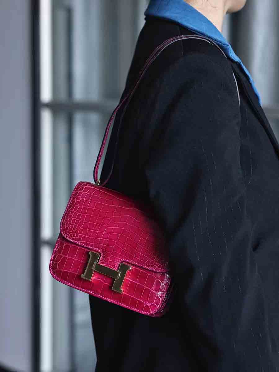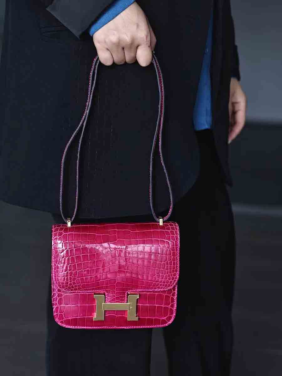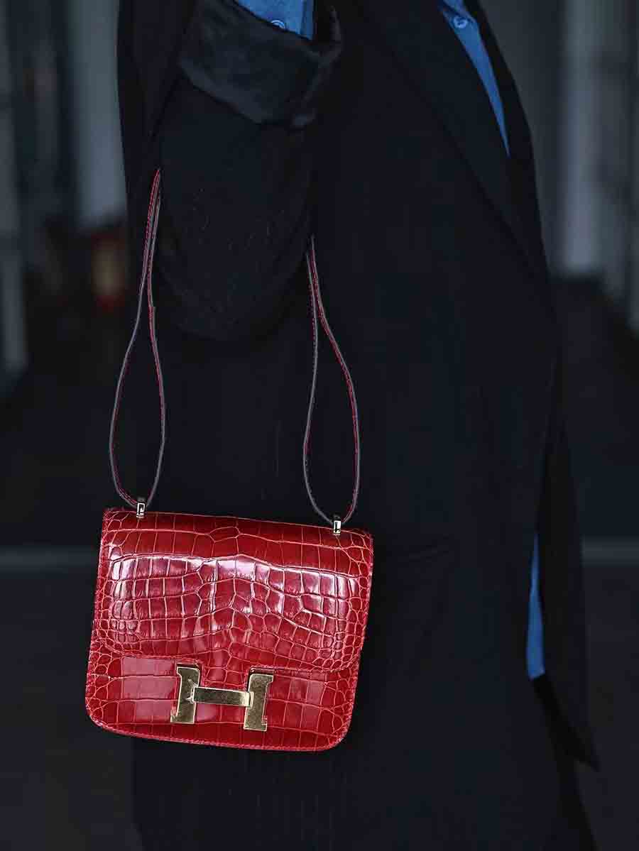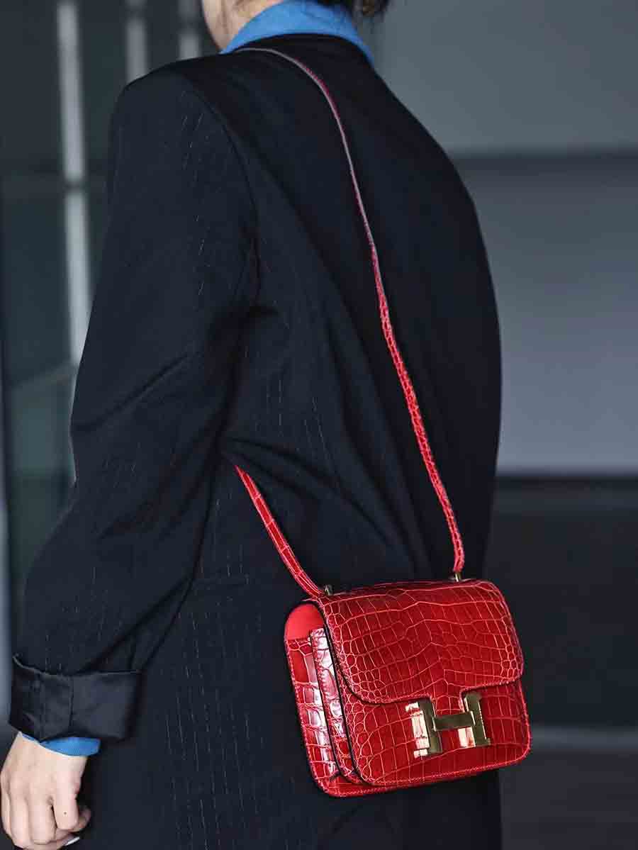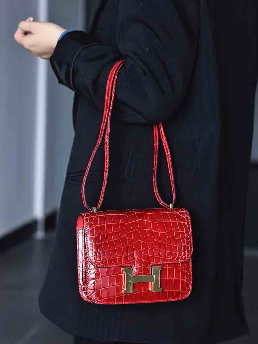 高光爱马仕橙 康康19cm 金扣,空姐康康包19cm鳄鱼皮康斯坦h家女包手工蜡线