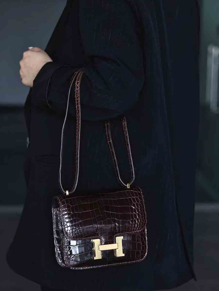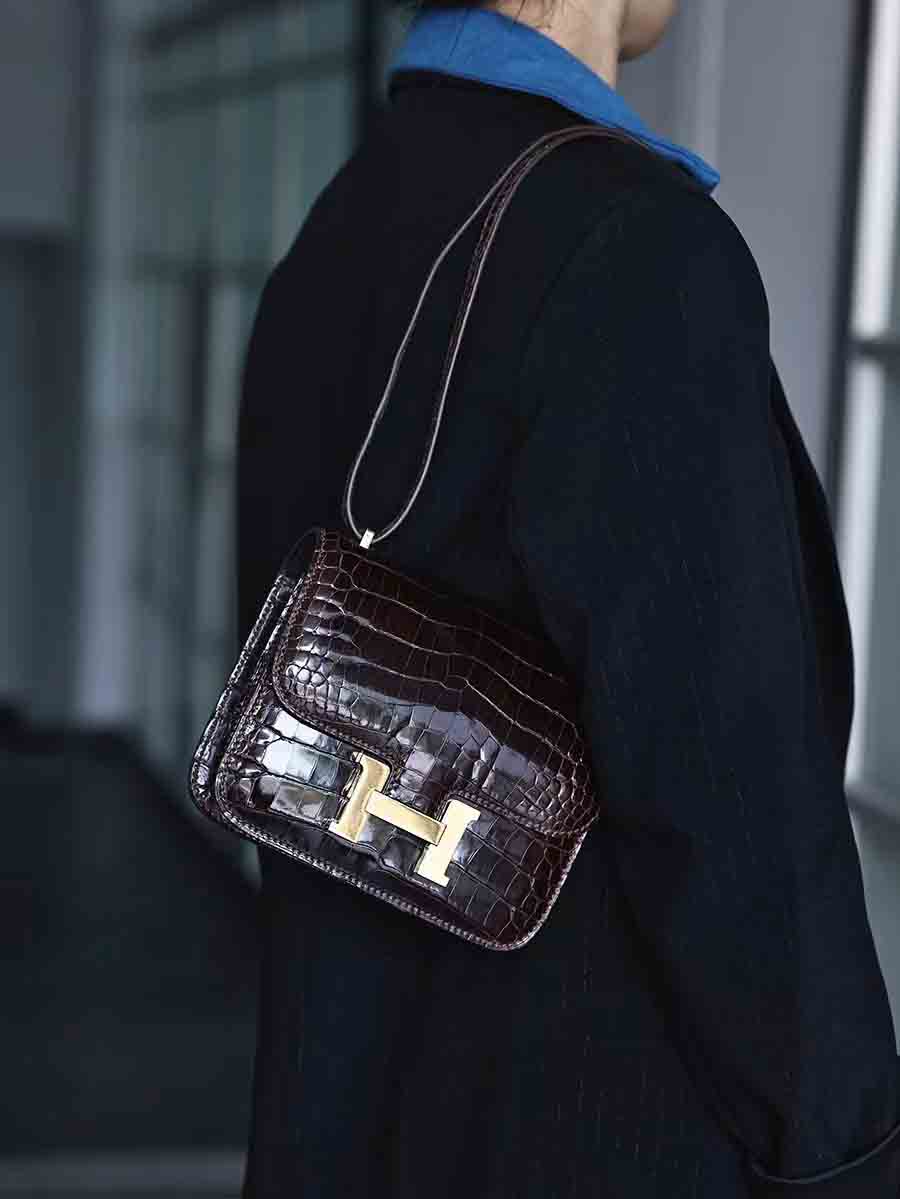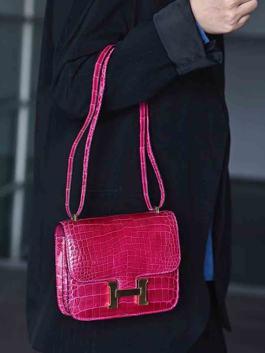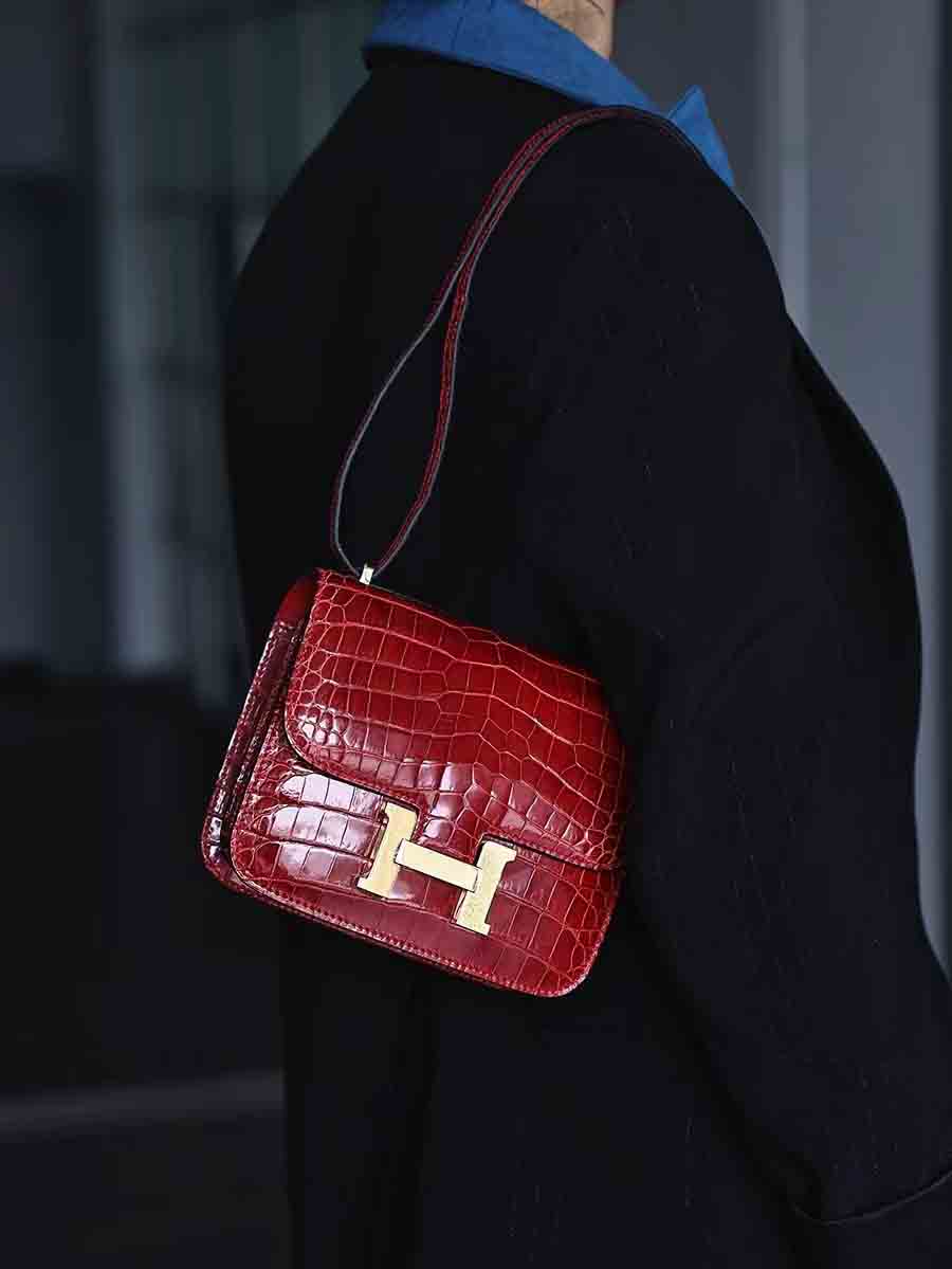 鳄鱼皮尼罗高光亮面鳄鱼皮女包H扣康康包19cm空姐包休闲高货小方包 。