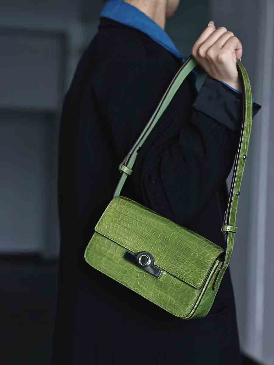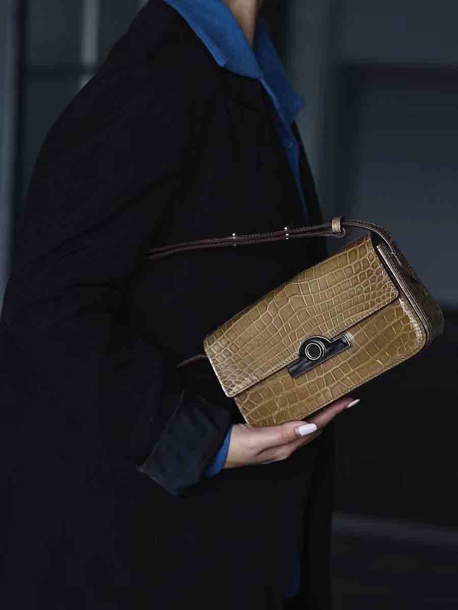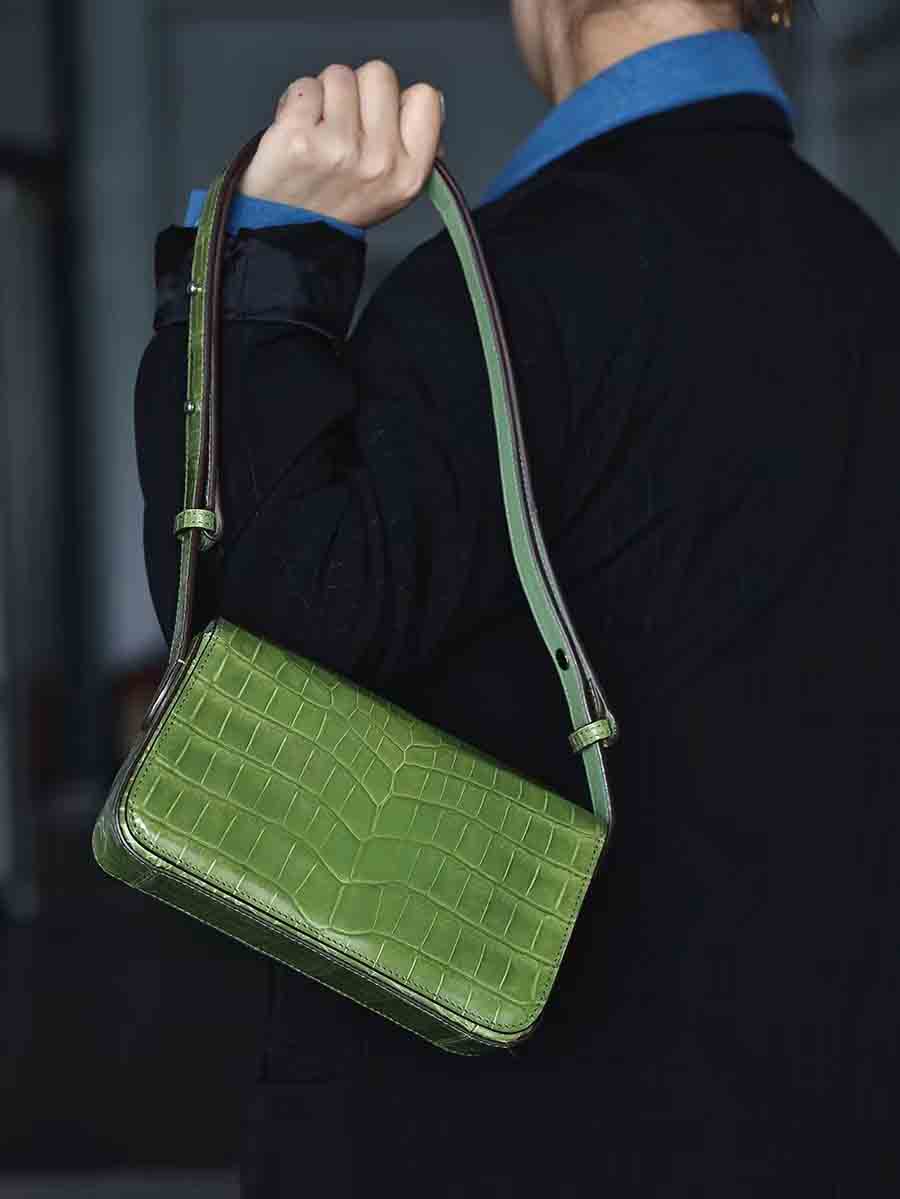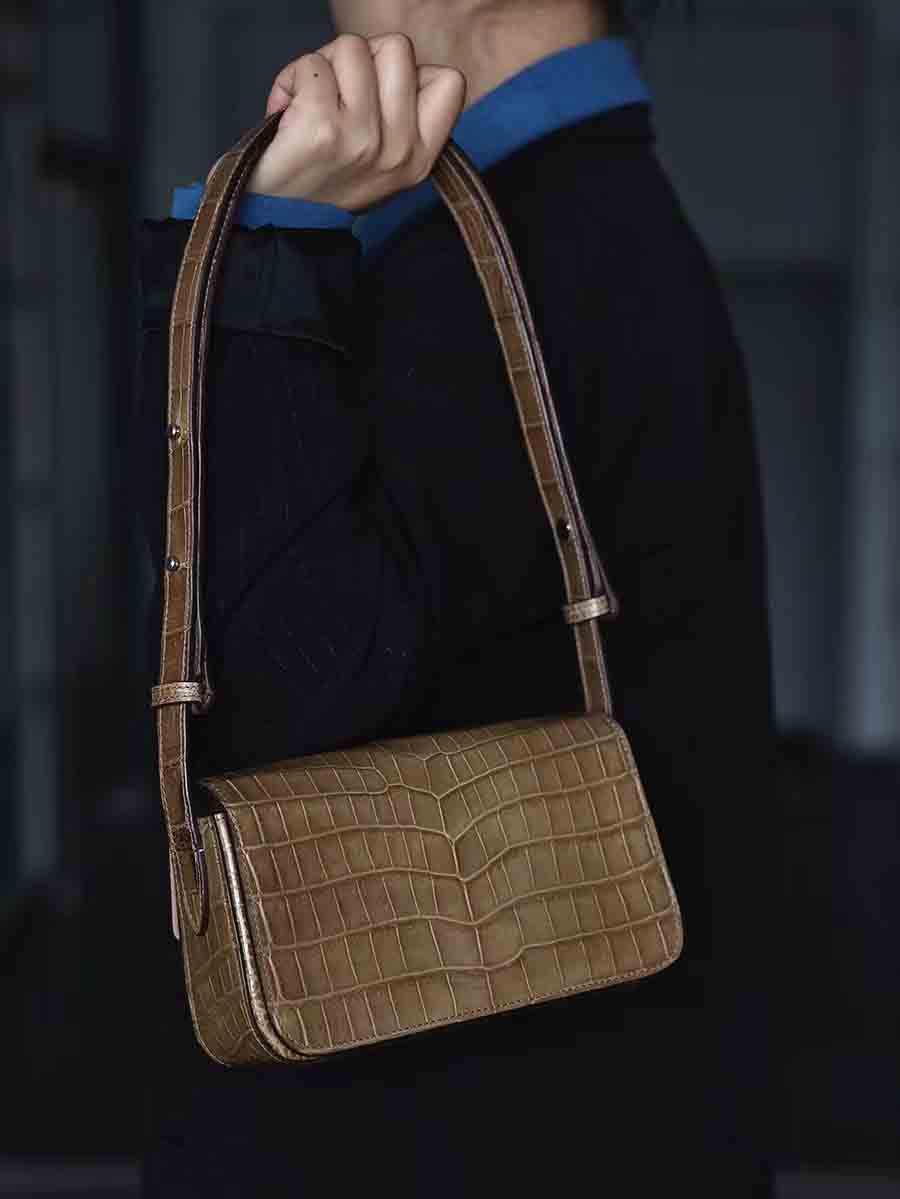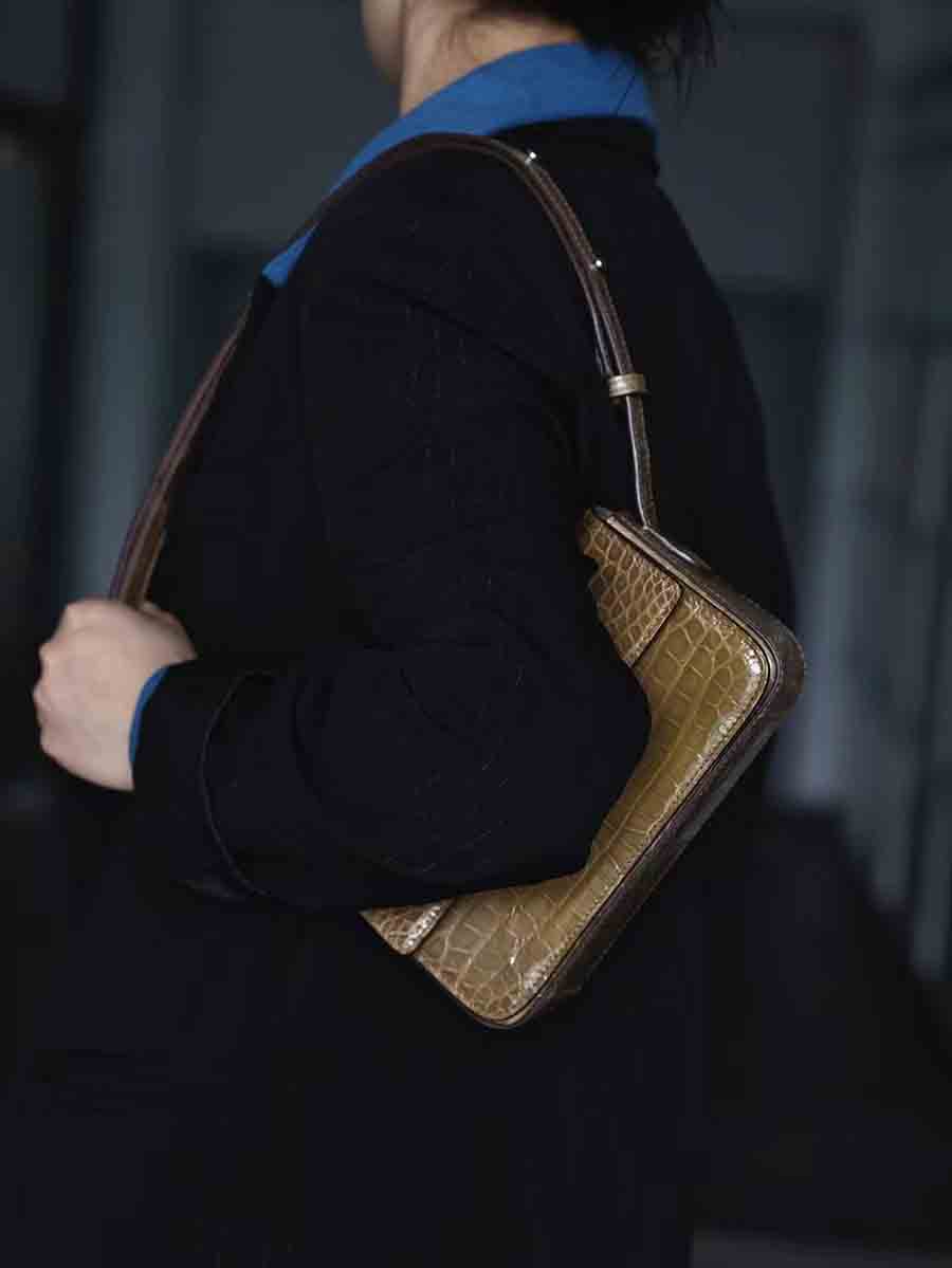 女士腋下包 以精湛的车线工艺融入设计,以车线打造出包包细节,精选鳄鱼皮材质散发着高级的光泽,奢侈高端鳄鱼皮,复古精致。
