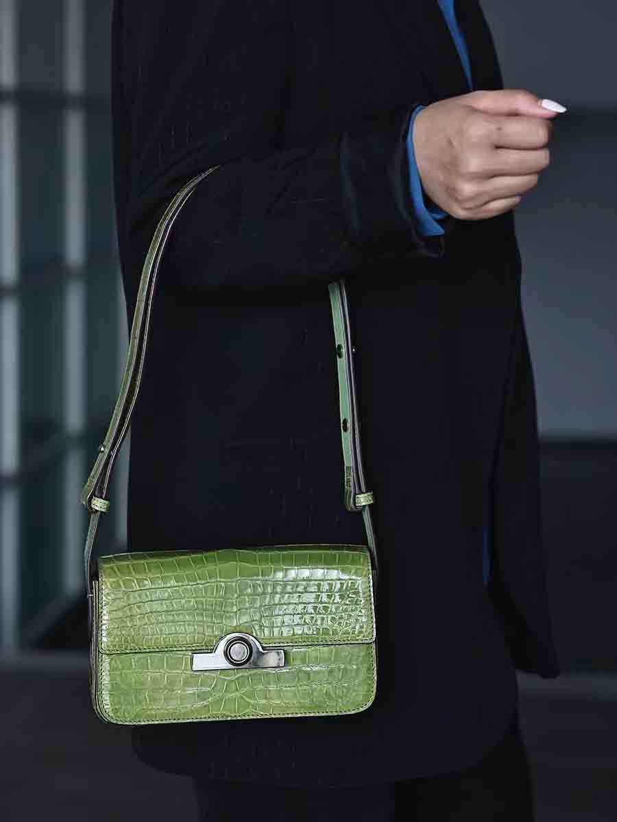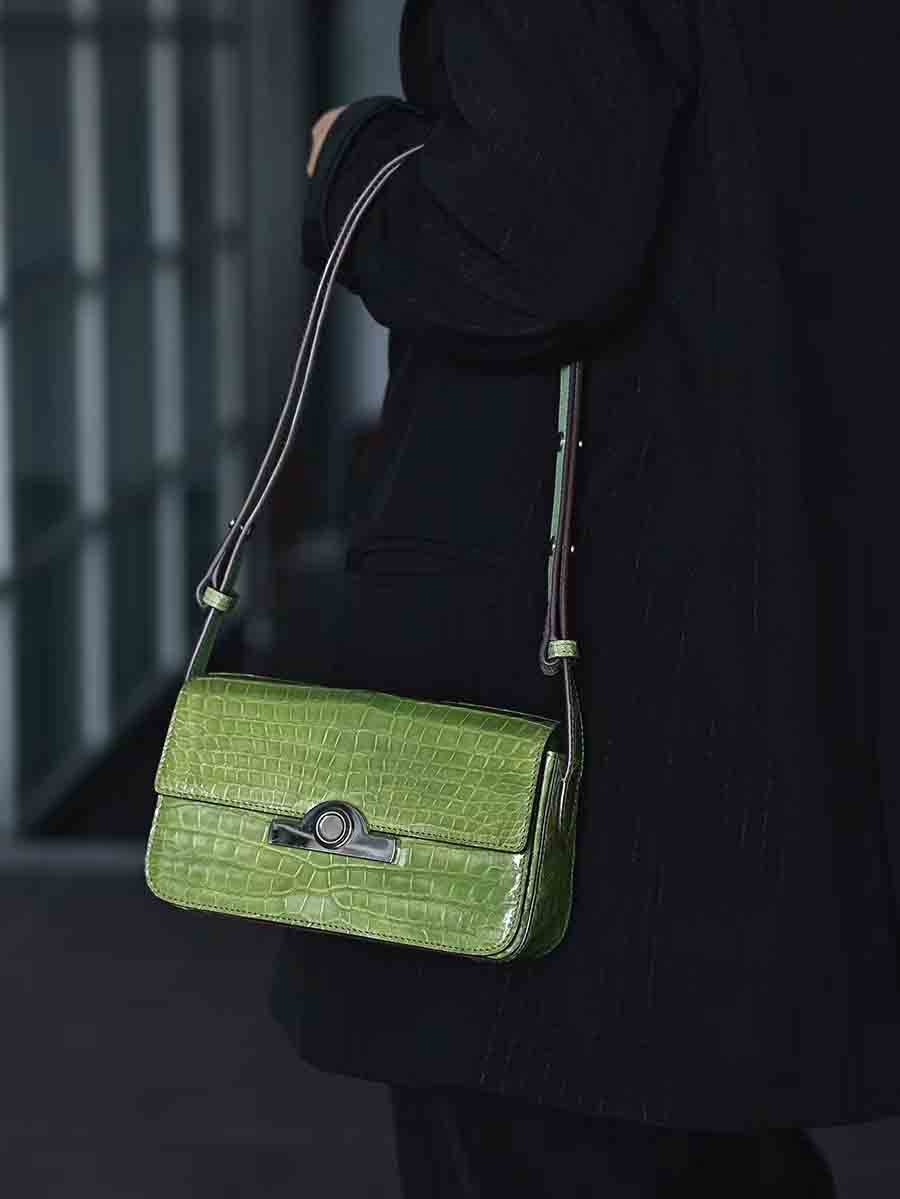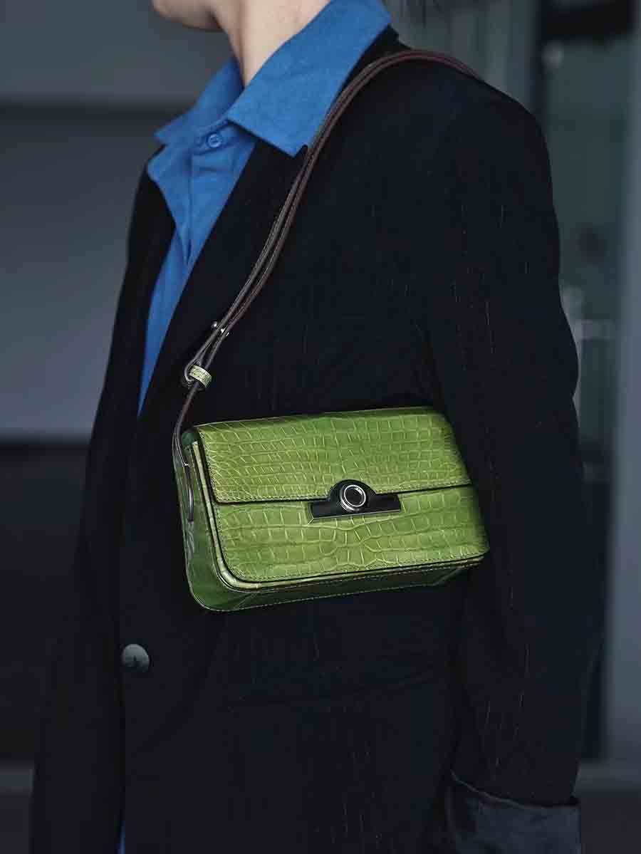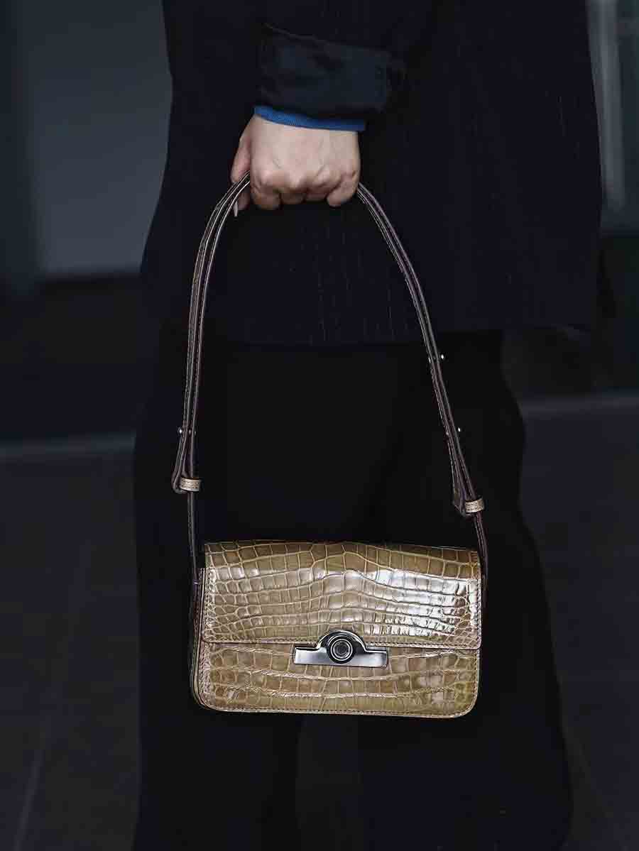 女士腋下包 以精湛的车线工艺融入设计,以车线打造出包包细节,精选鳄鱼皮材质散发着高级的光泽,奢侈高端鳄鱼皮,复古精致。