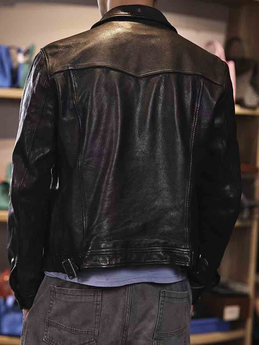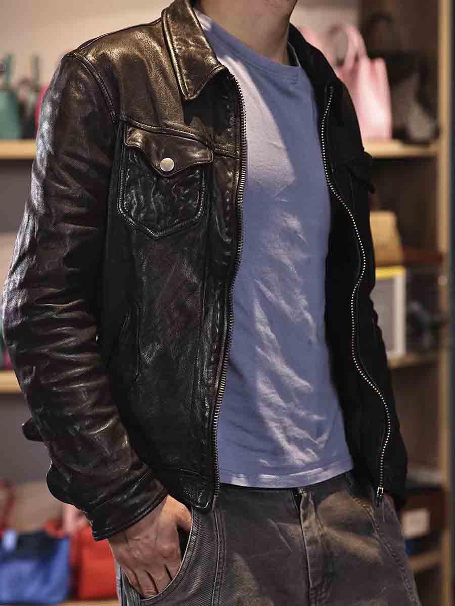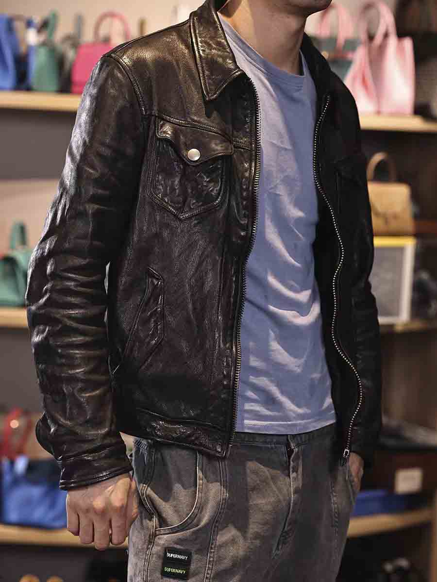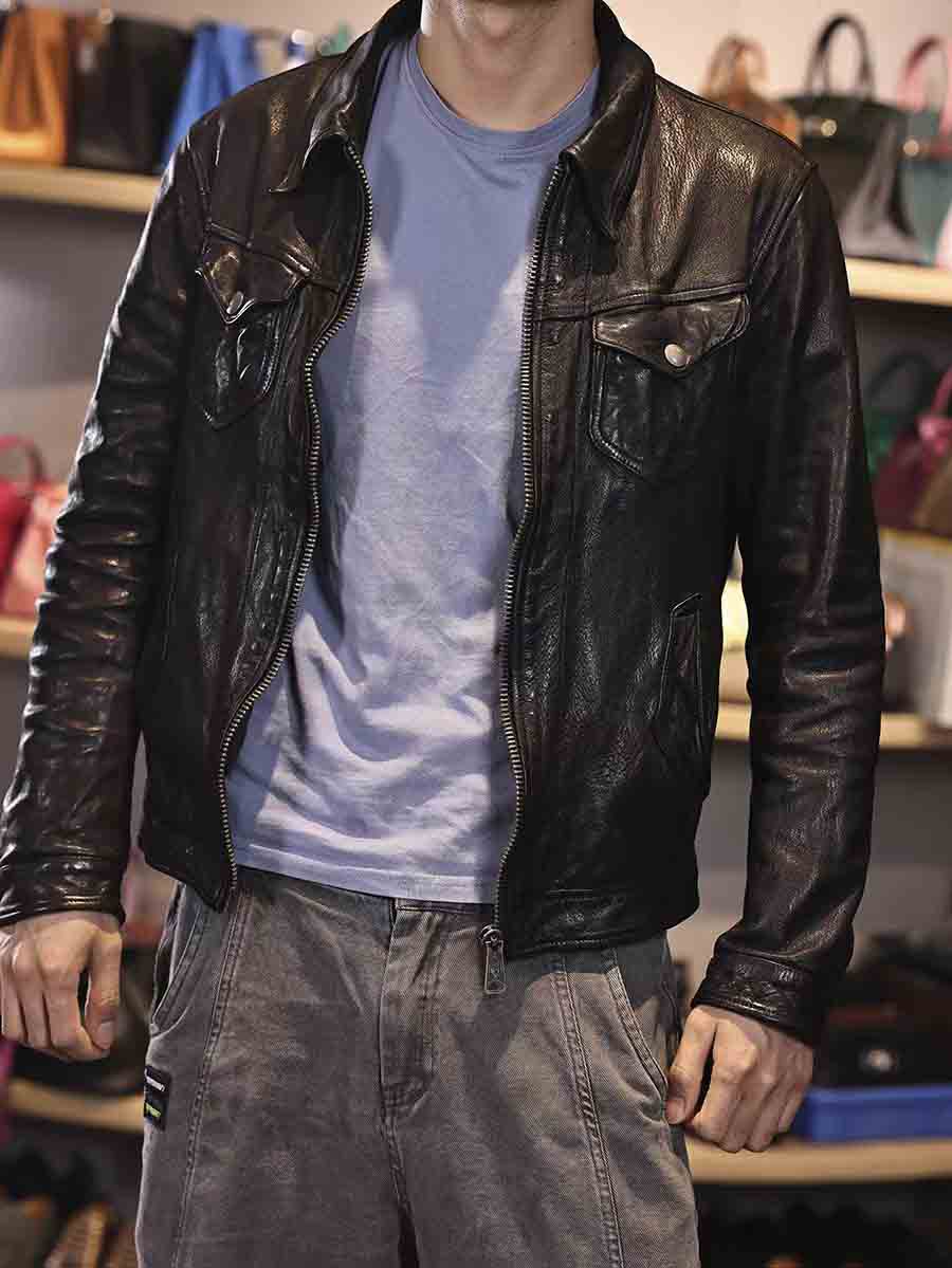 华仔在《天地对决》剧中始终穿着的那件夹克,黑色植鞣水洗风格,华仔同款机车服 水洗风格 现衣48码。