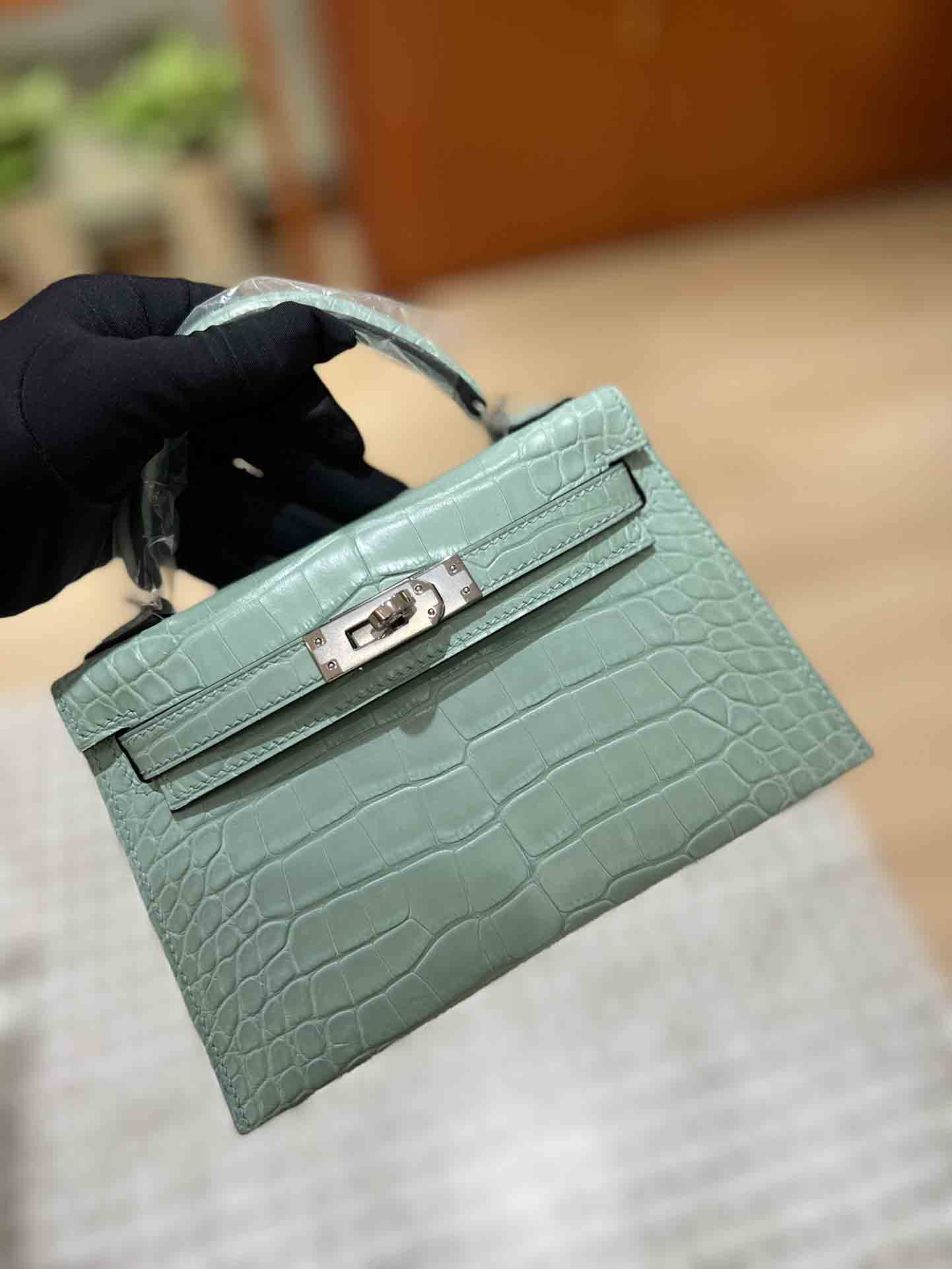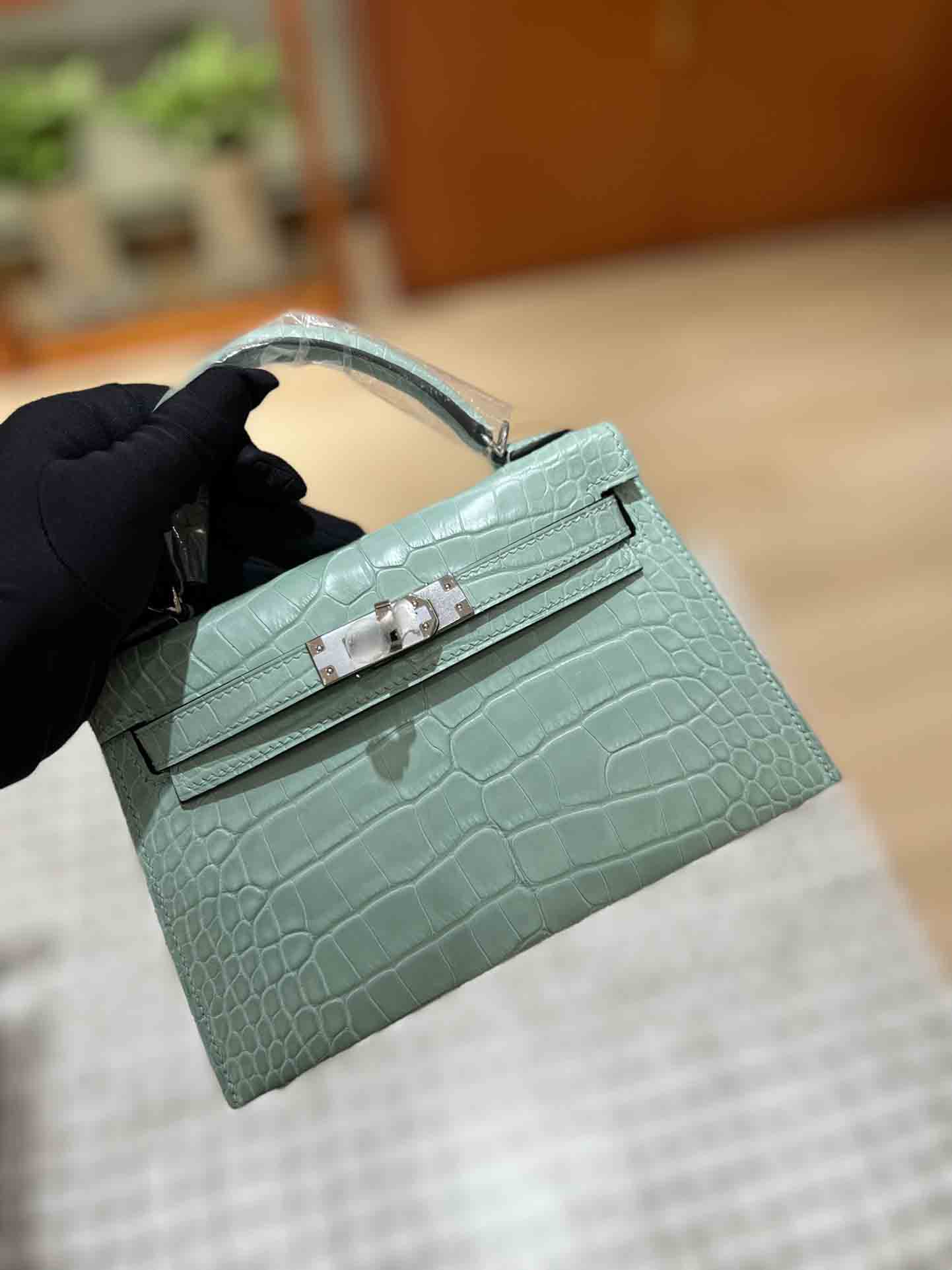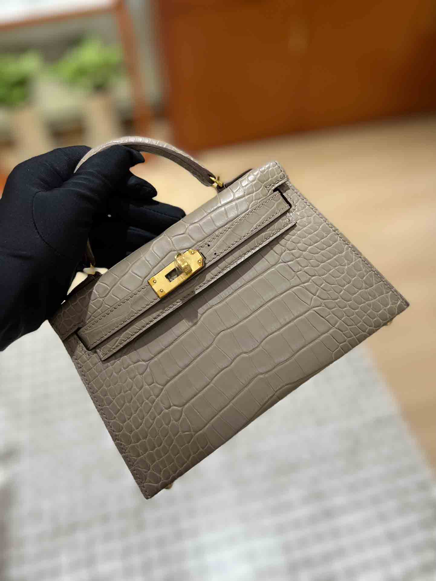 Mini 凯莉二代石墨灰法国hcp进口雾面美洲鳄鱼皮手工包定制凯莉包 。