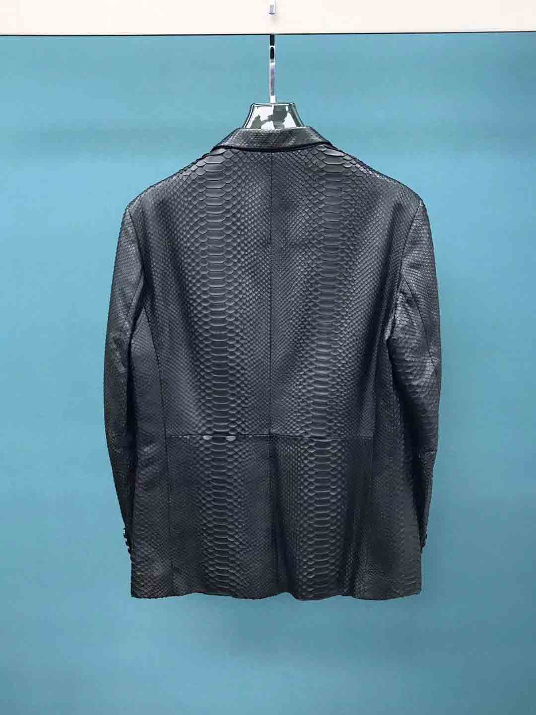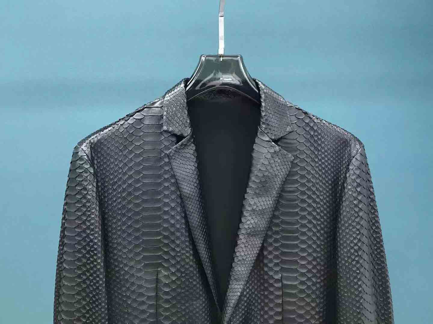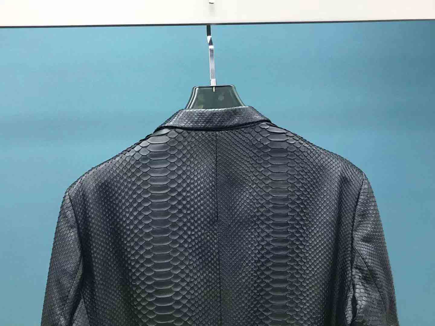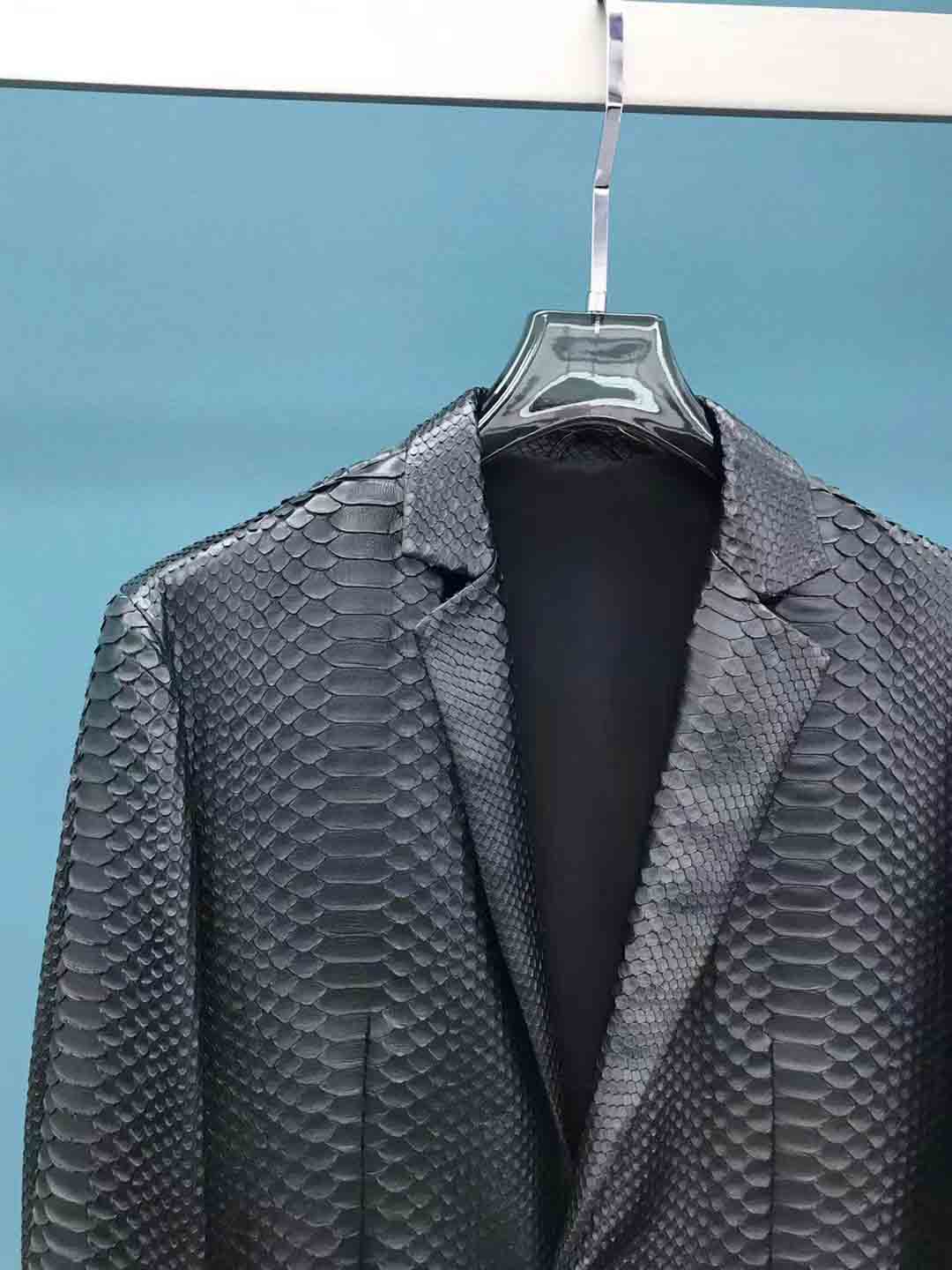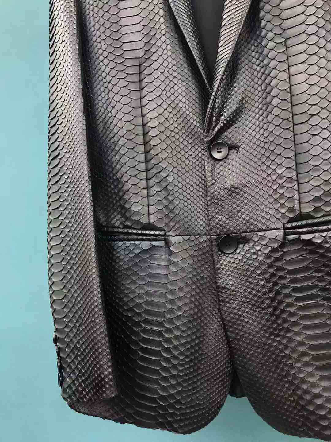 黑色蟒蛇皮男士西装款现货50码,可以提供自己喜欢的款式衣服订做蟒蛇皮风衣西装等联系微信 95506803