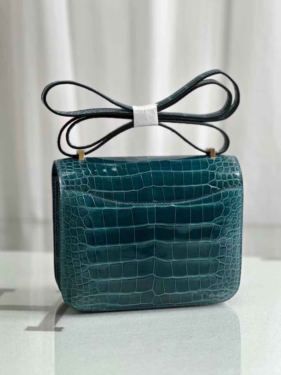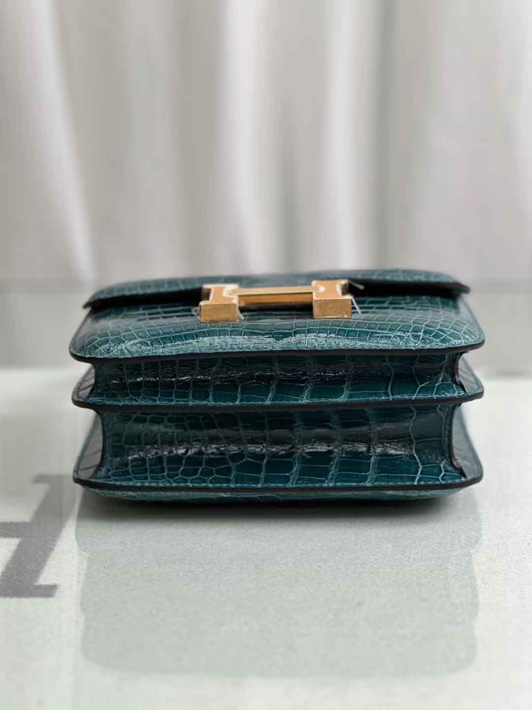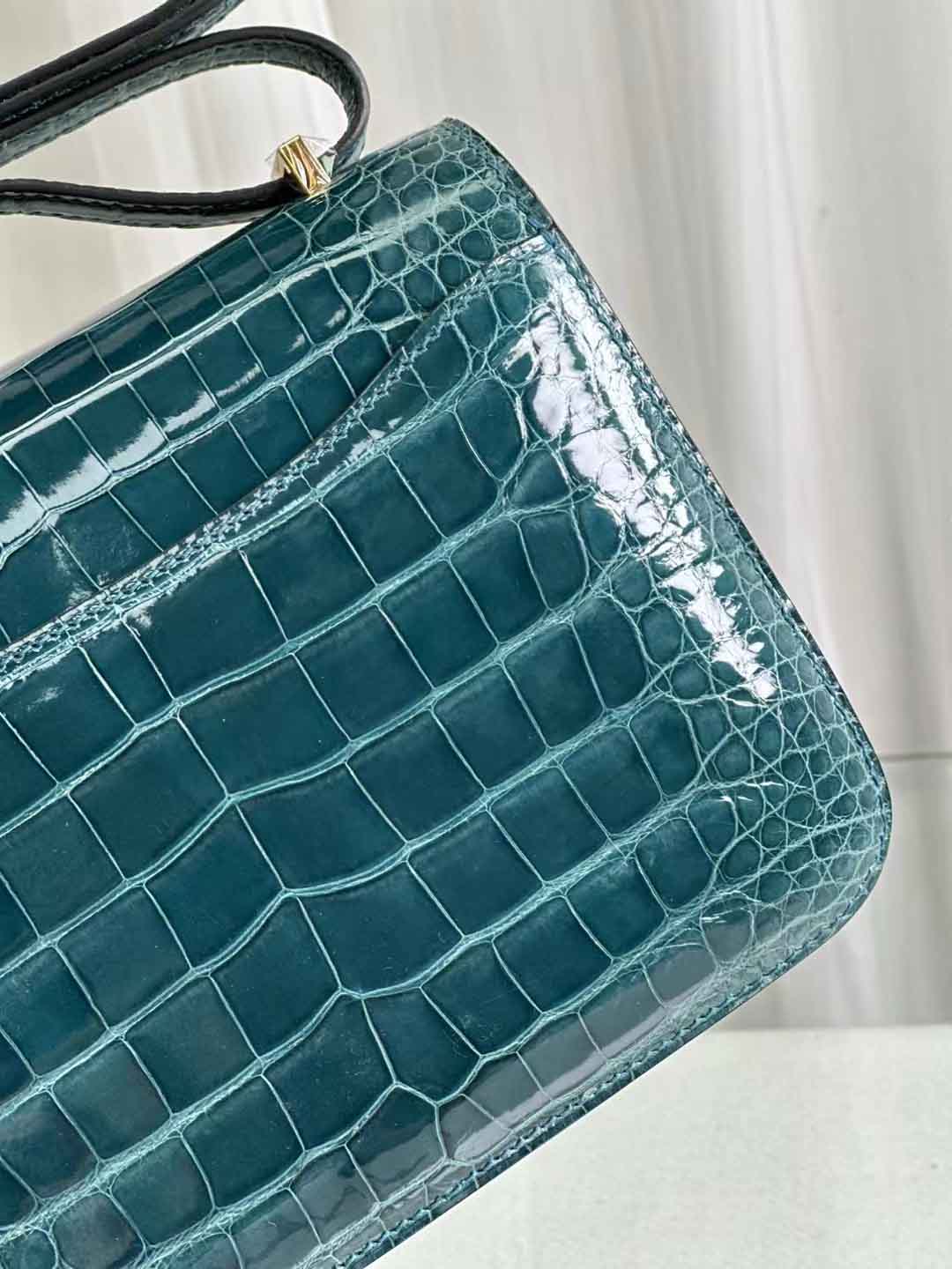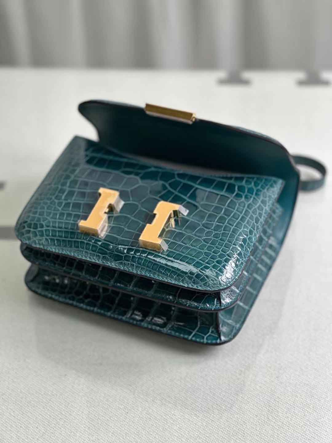 constance 18cm 亮面美洲鳄鱼 鸭子蓝。美洲鳄鱼皮女斜跨包定做工厂。