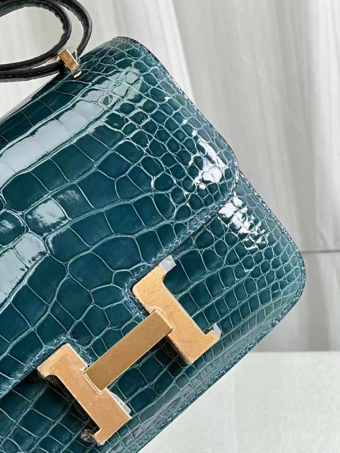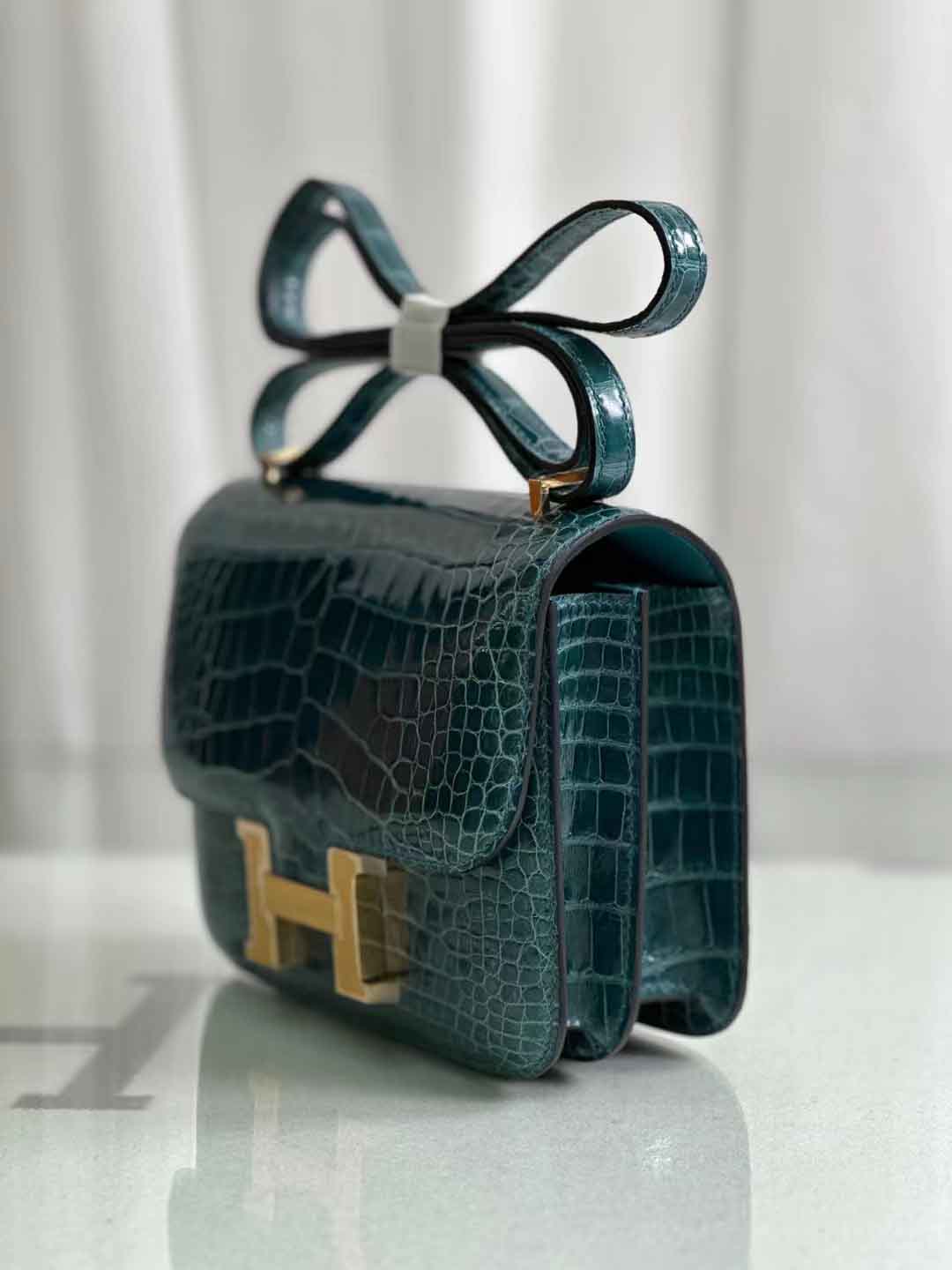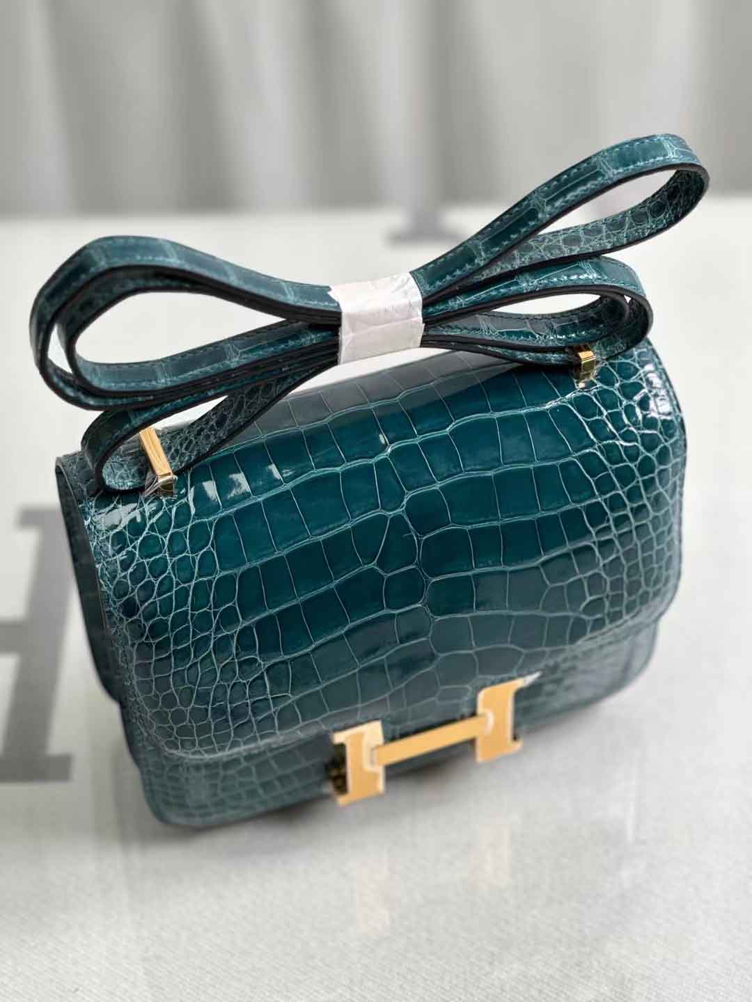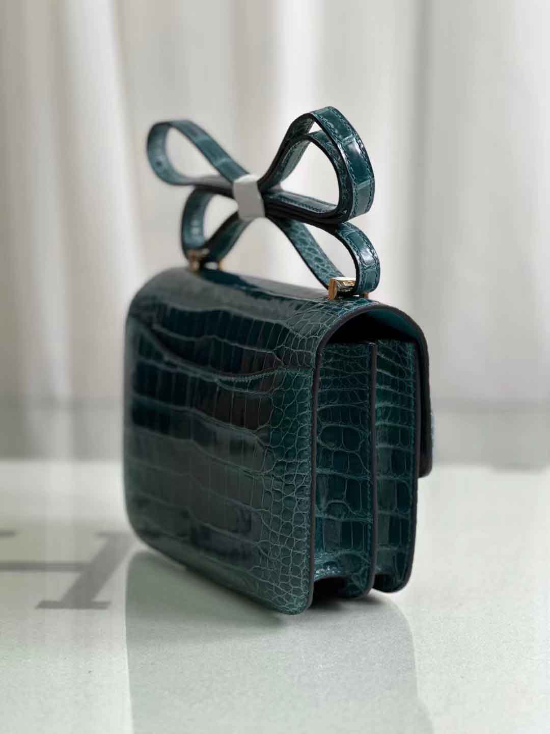 constance 18cm 亮面美洲鳄鱼 鸭子蓝。美洲鳄鱼皮女斜跨包定做工厂。