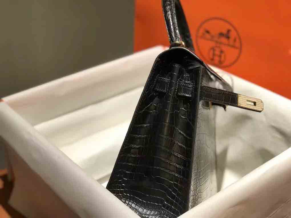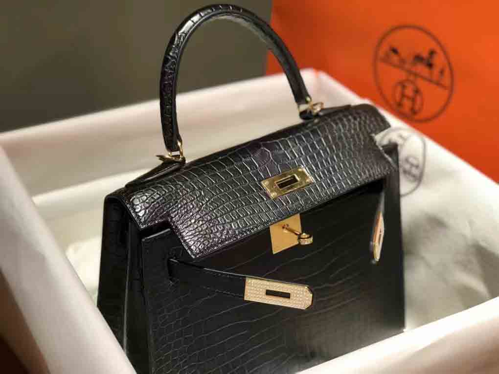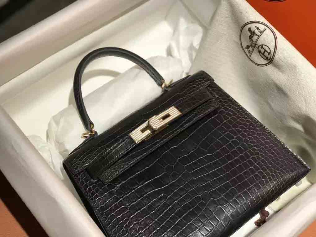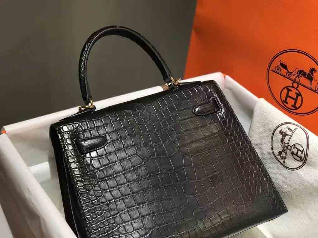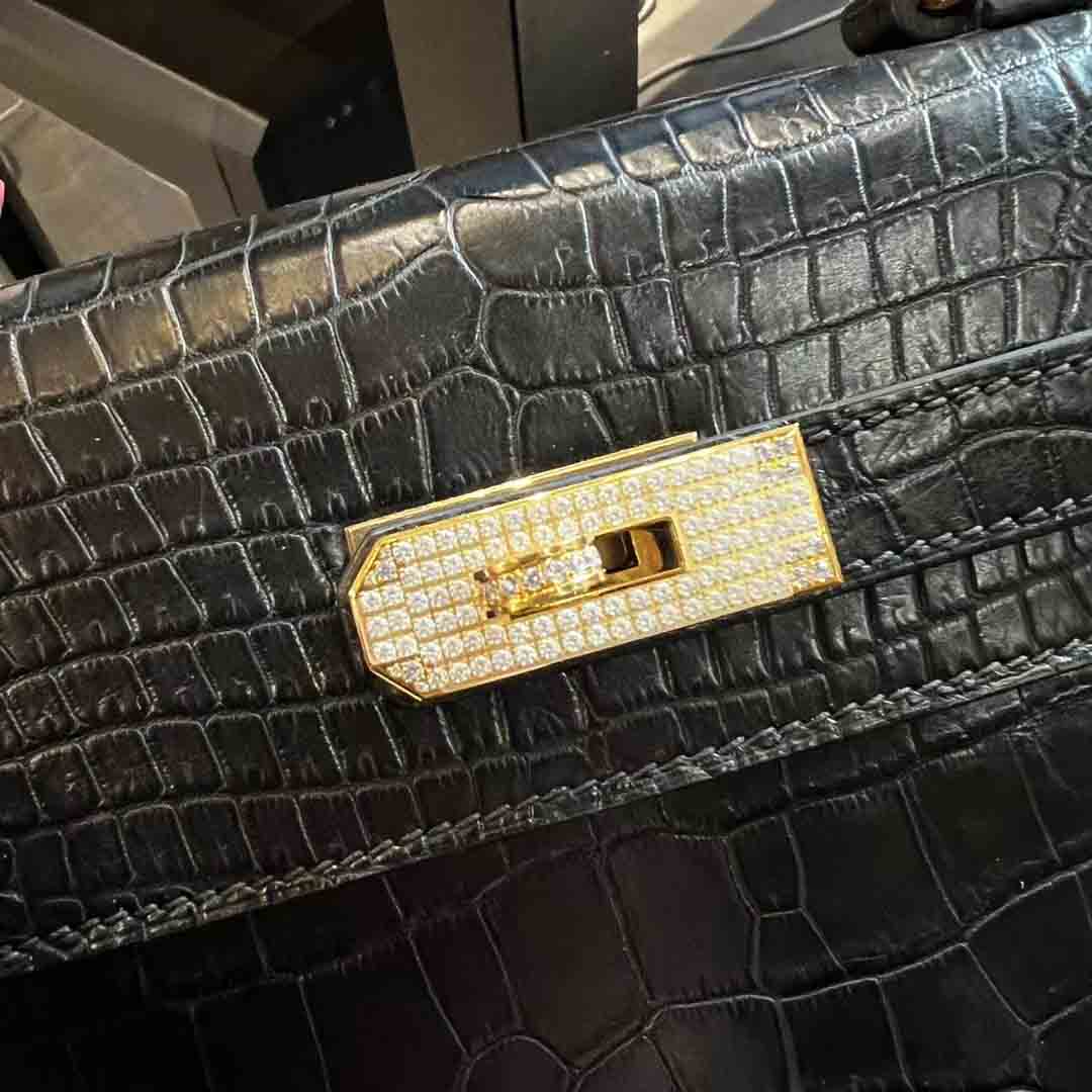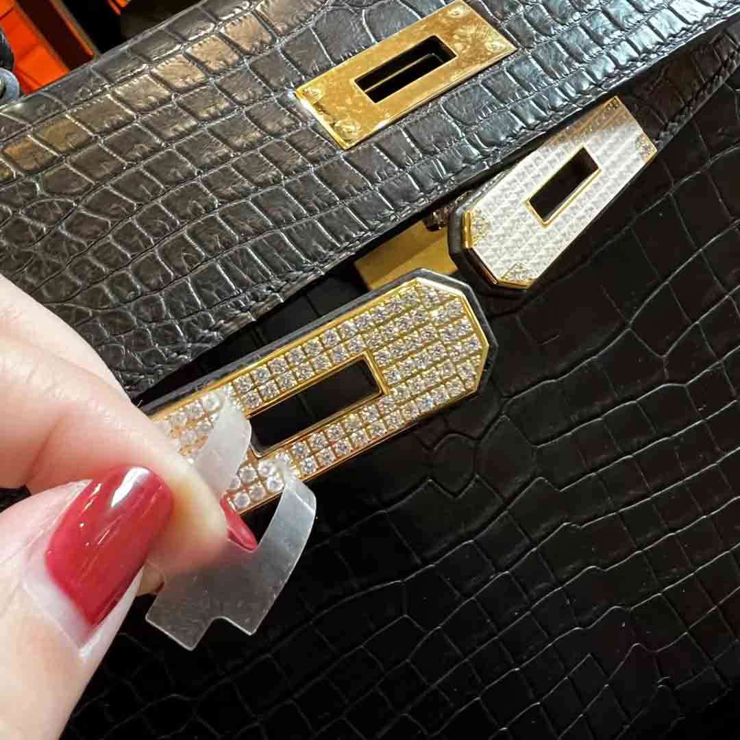 哑光倒v湾鳄 Kelly28 金色/钻扣,雾面湾鳄女包订制预约微信 95506803。