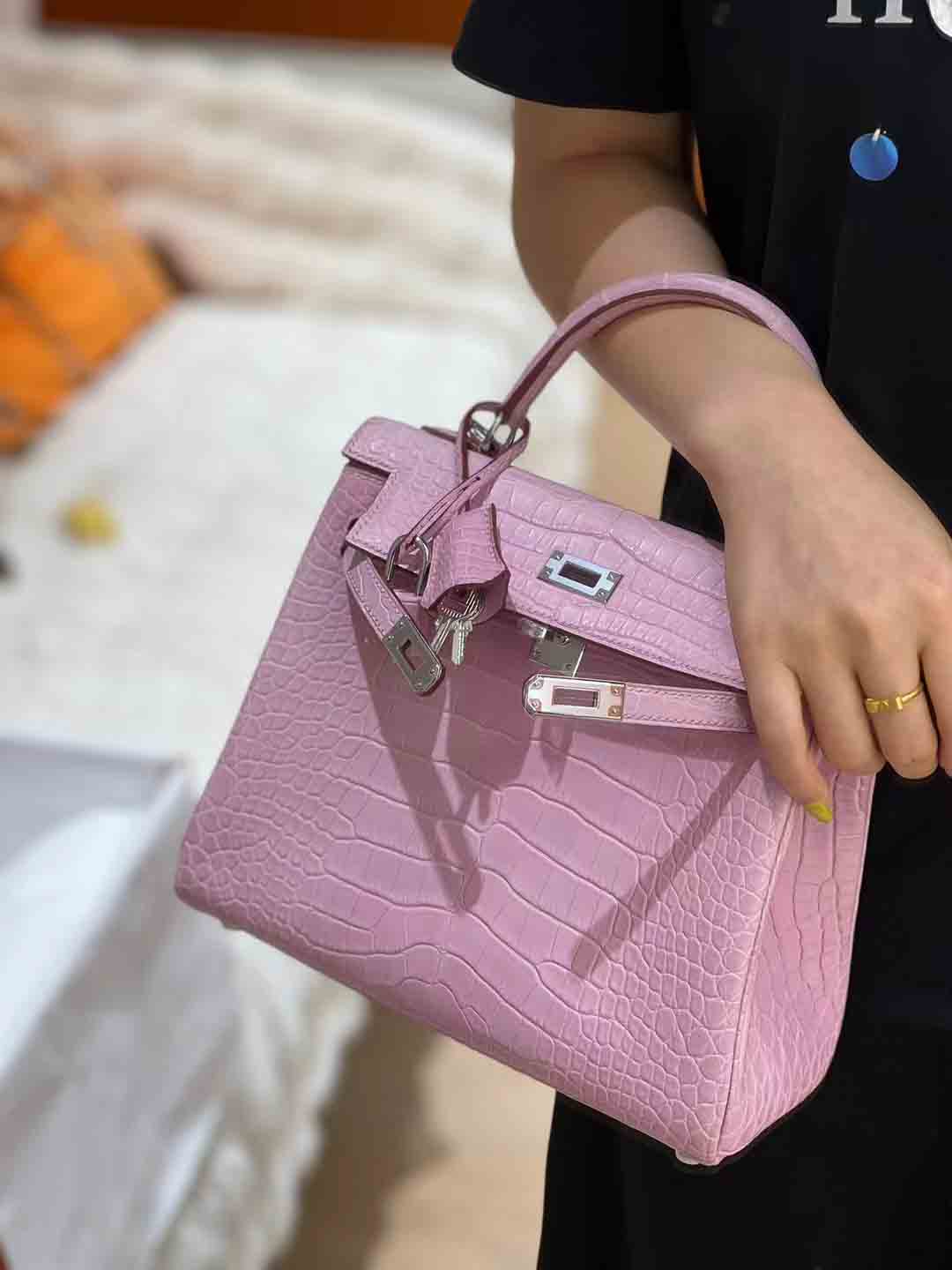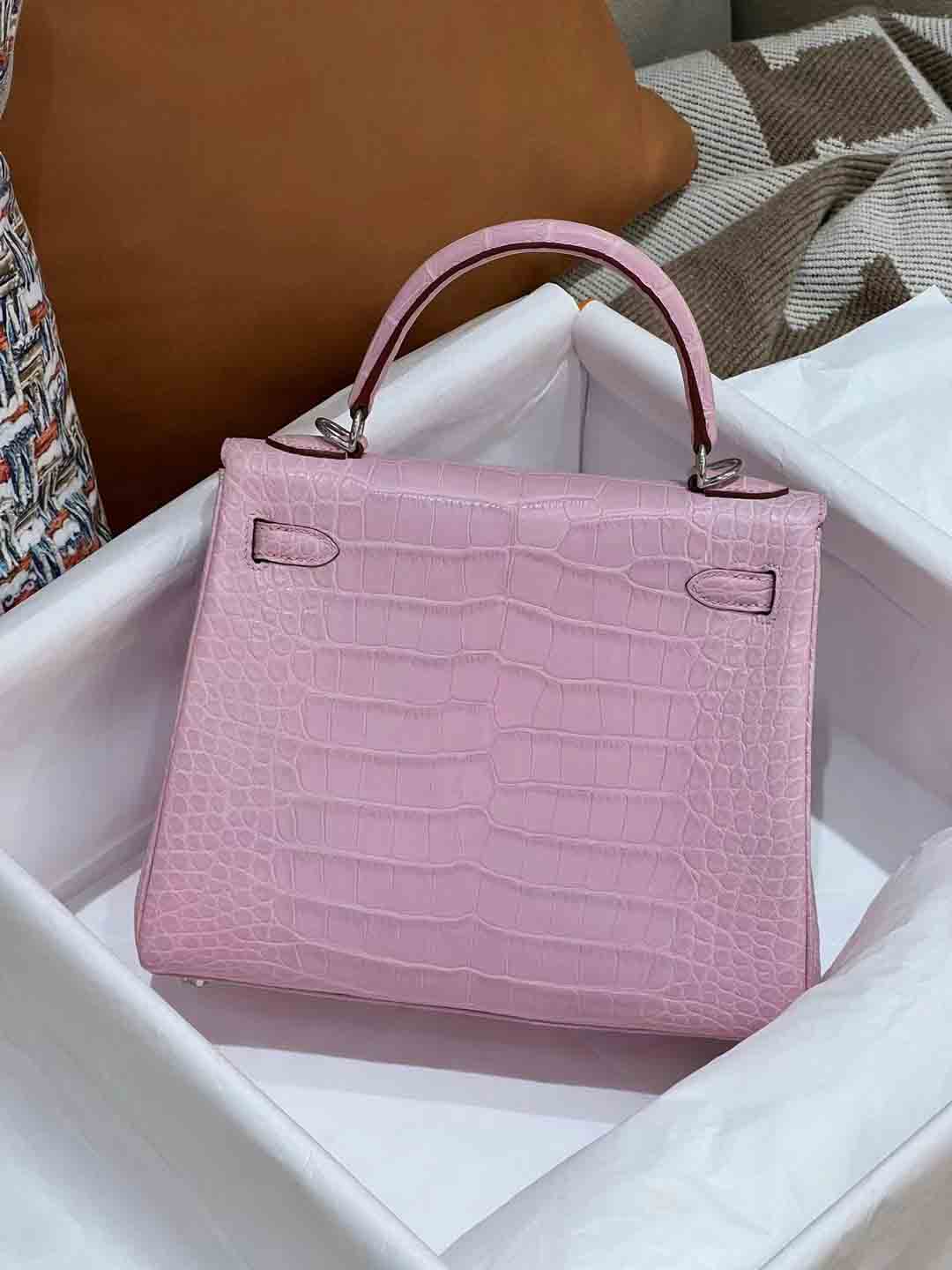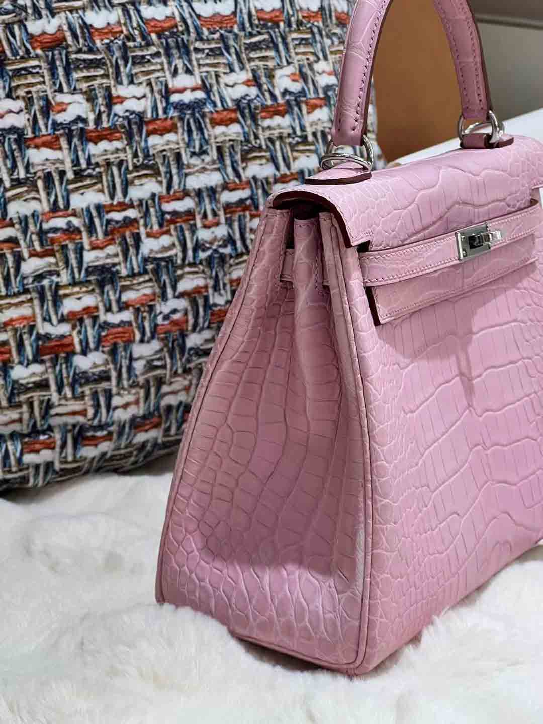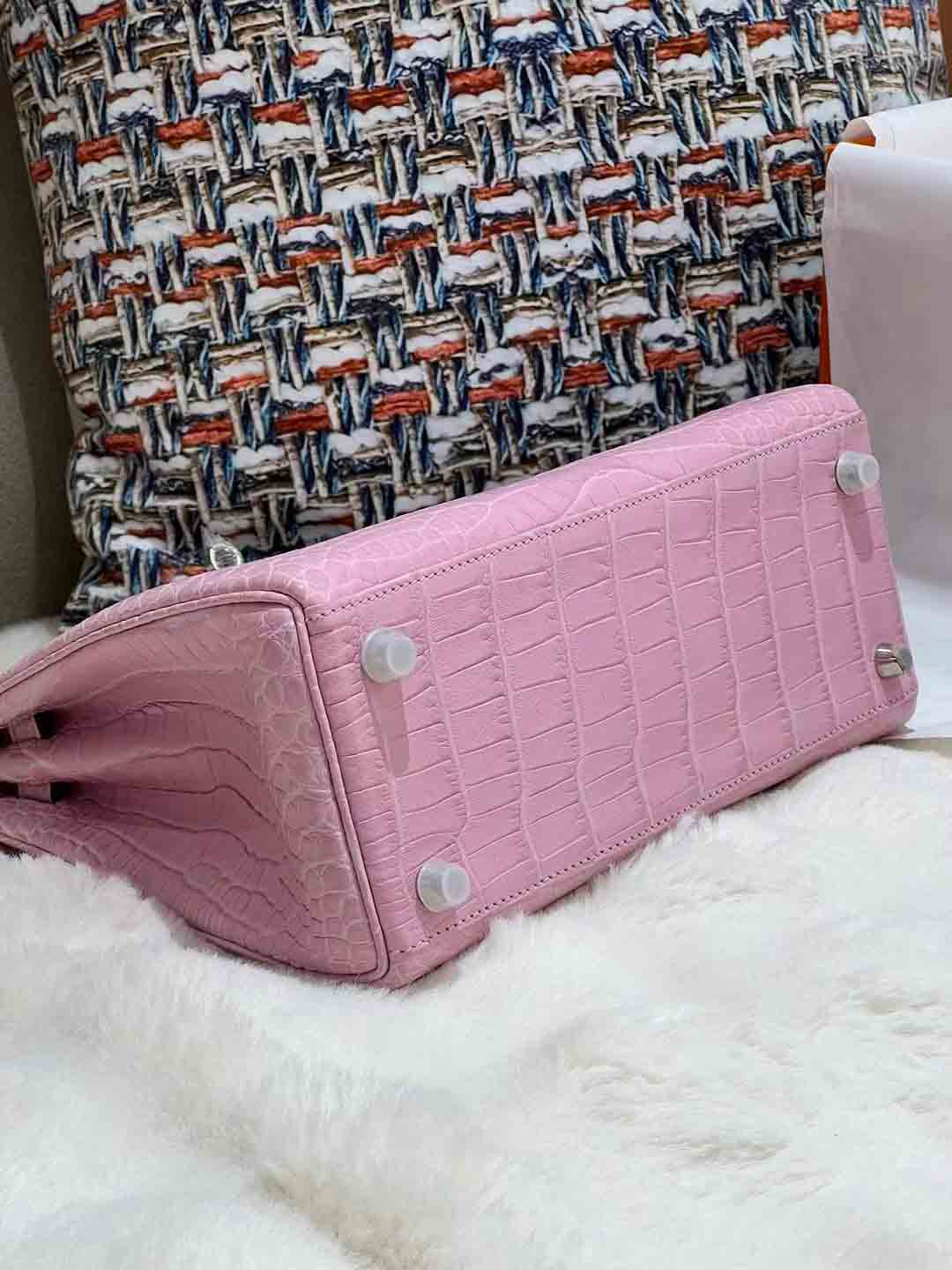 5p 樱花粉只产鳄鱼皮 美洲鳄纹路更合适做25尺寸的包包 美不美大家看看。外皮采用的是进口的美洲鳄,柔美的哑光樱花粉。内部是法国山羊皮。