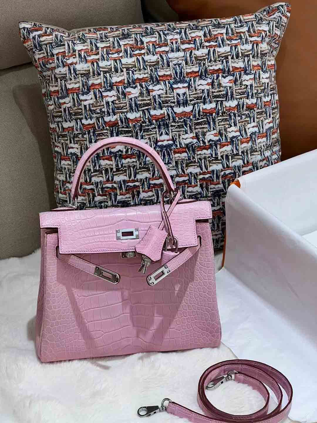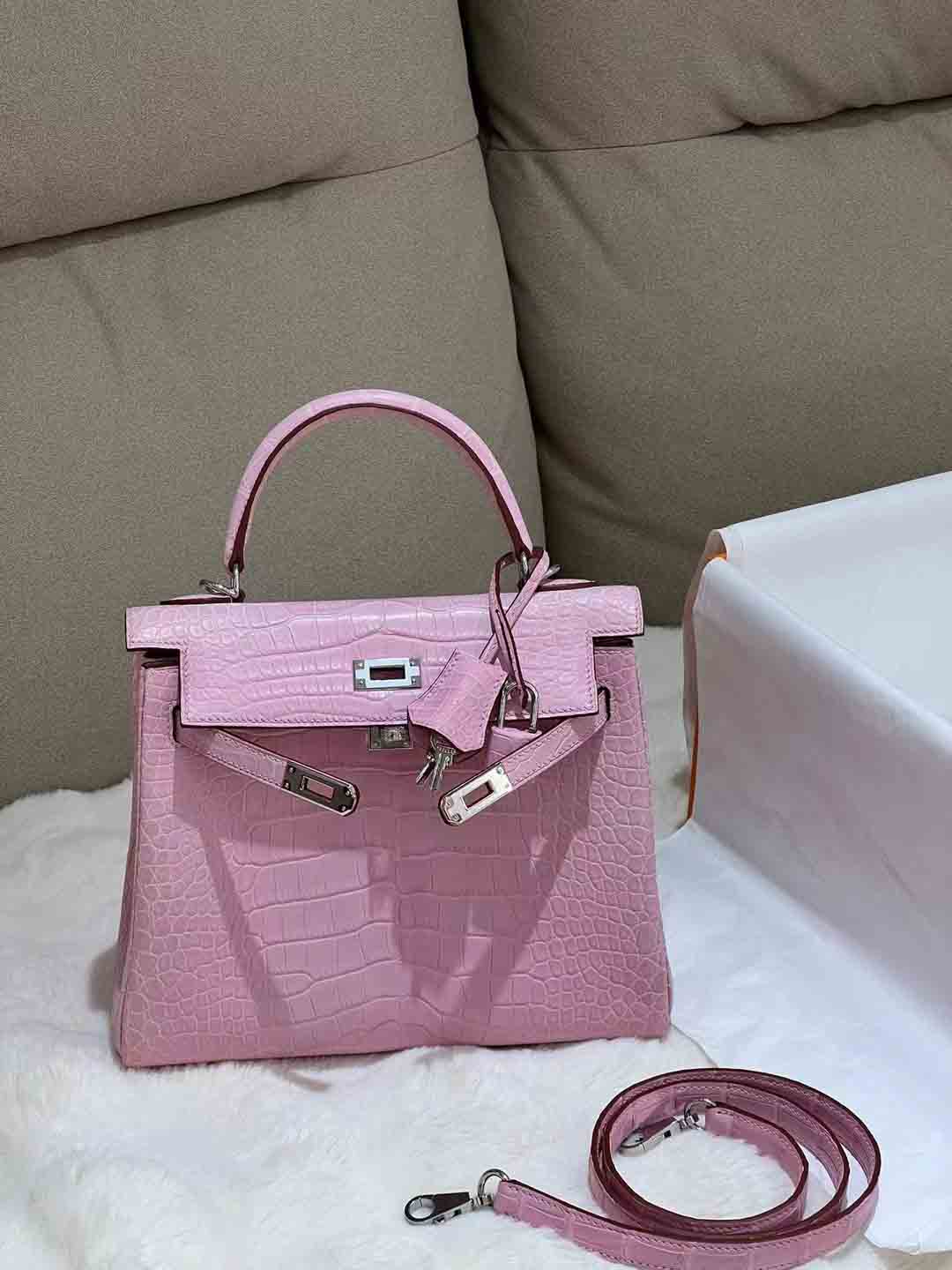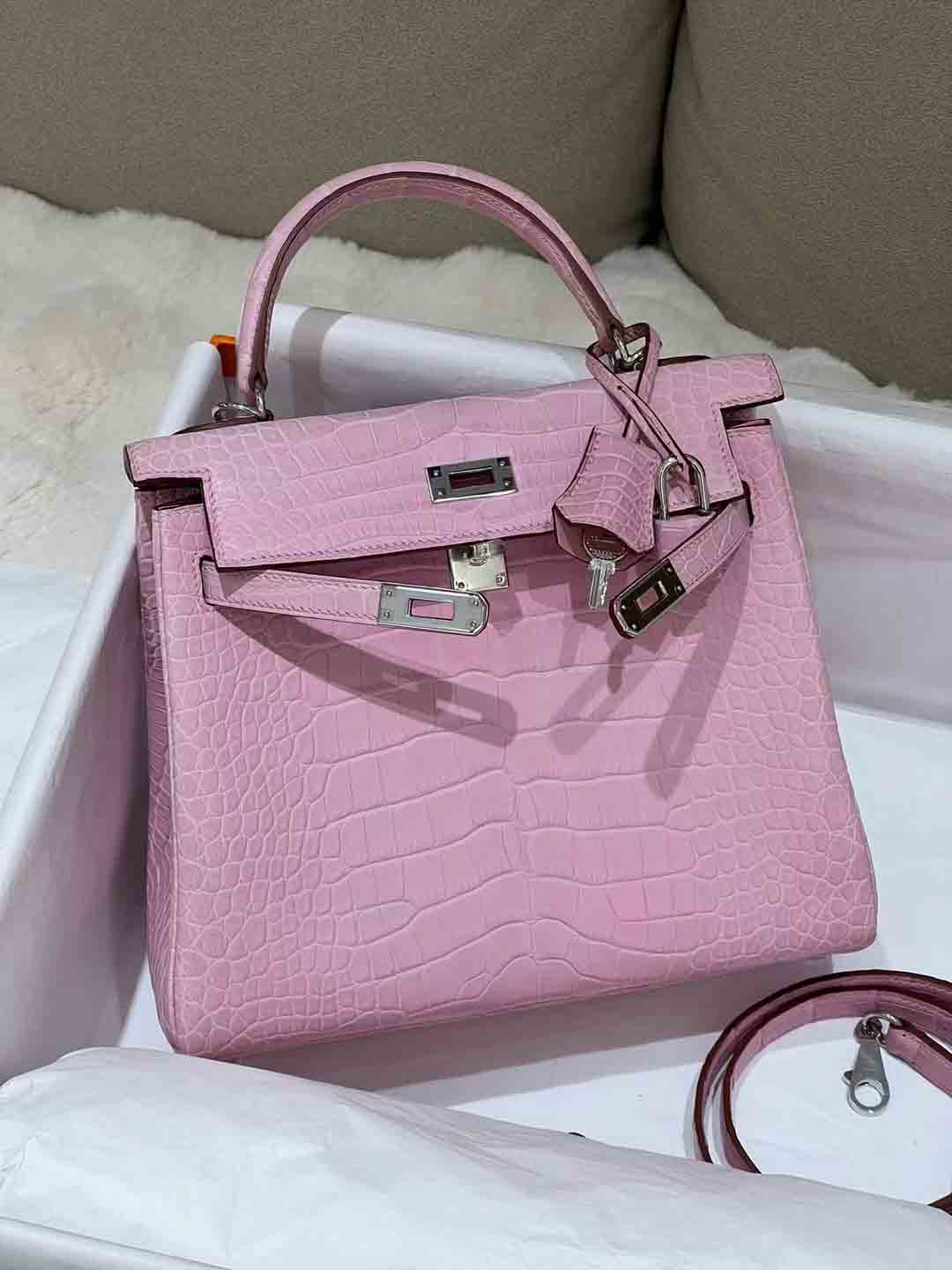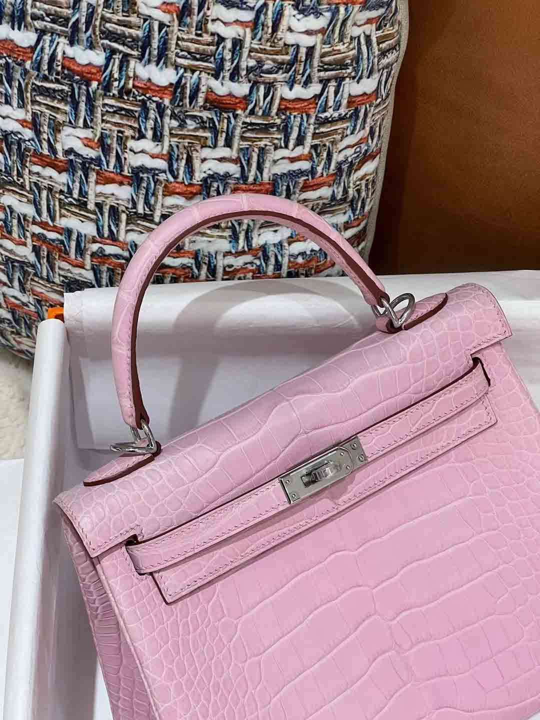 5p 樱花粉只产鳄鱼皮 美洲鳄纹路更合适做25尺寸的包包 美不美大家看看。外皮采用的是进口的美洲鳄,柔美的哑光樱花粉。内部是法国山羊皮。