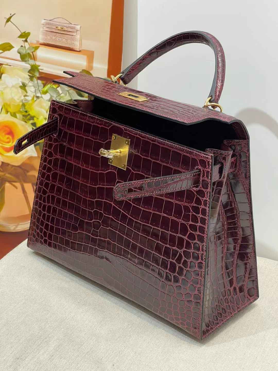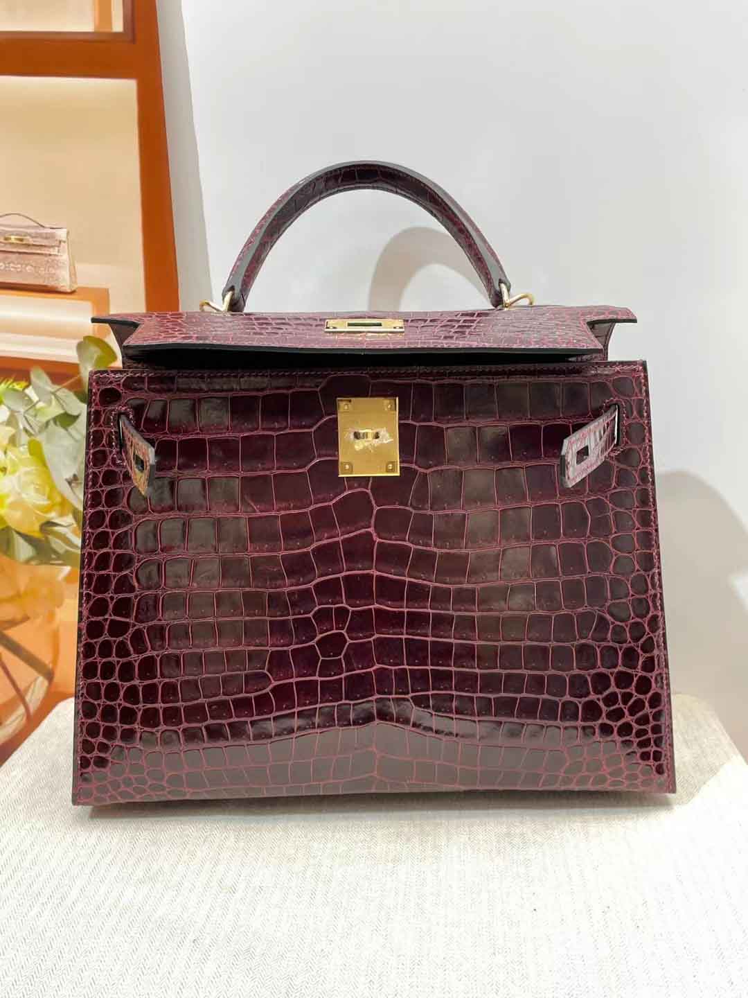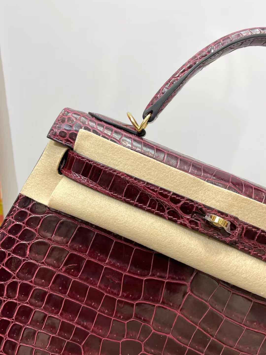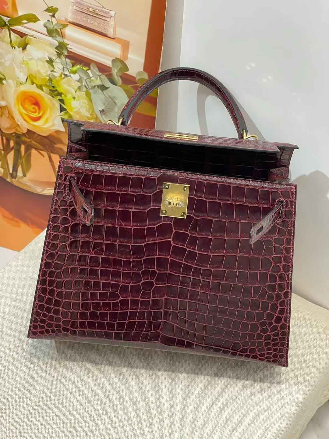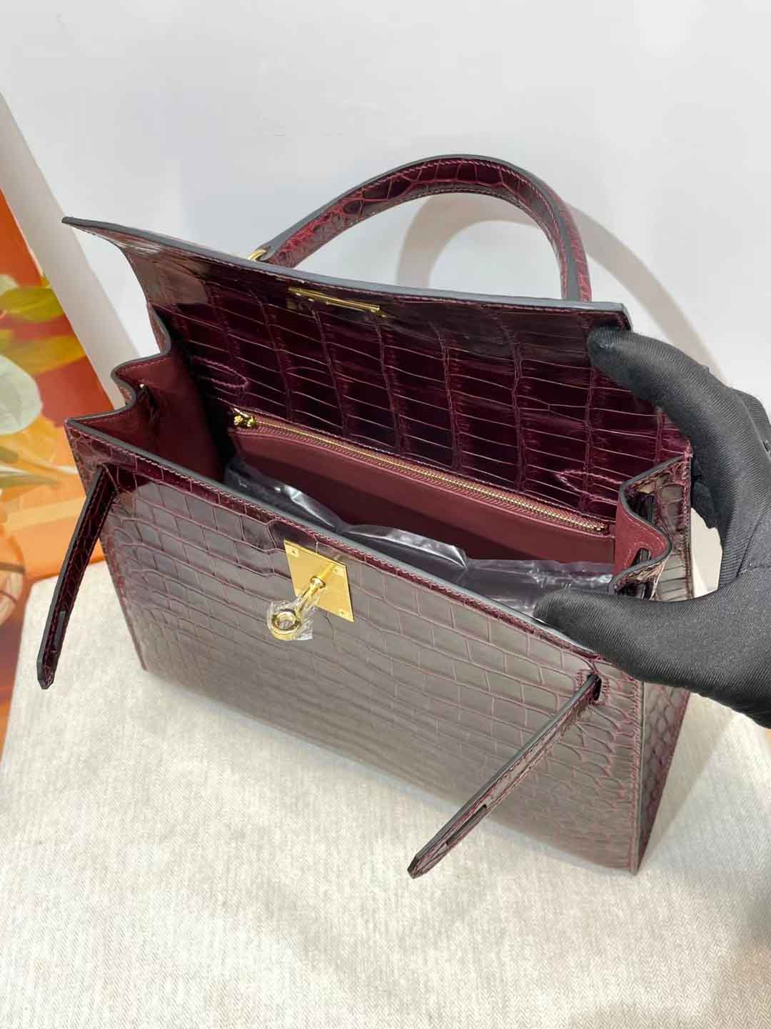 凯莉28CM. 倒V 波尔多 酒红色 hcp进口湾鳄 实拍
