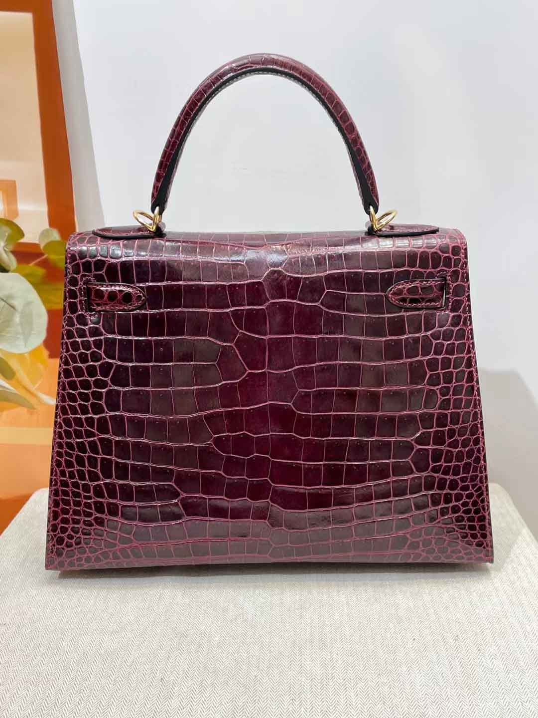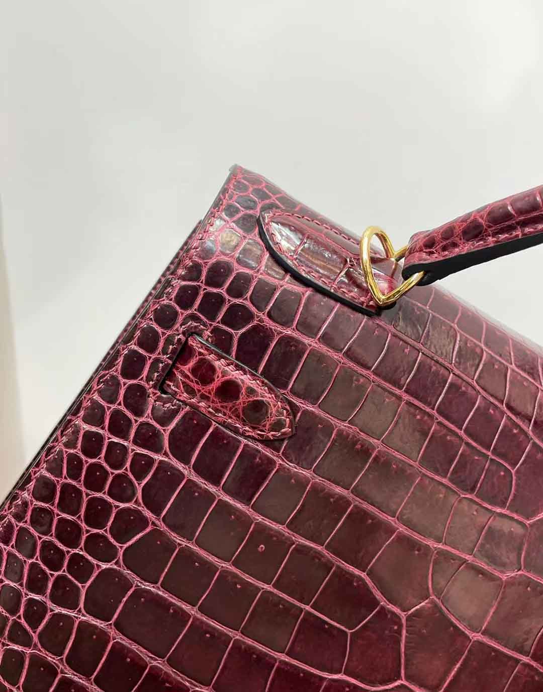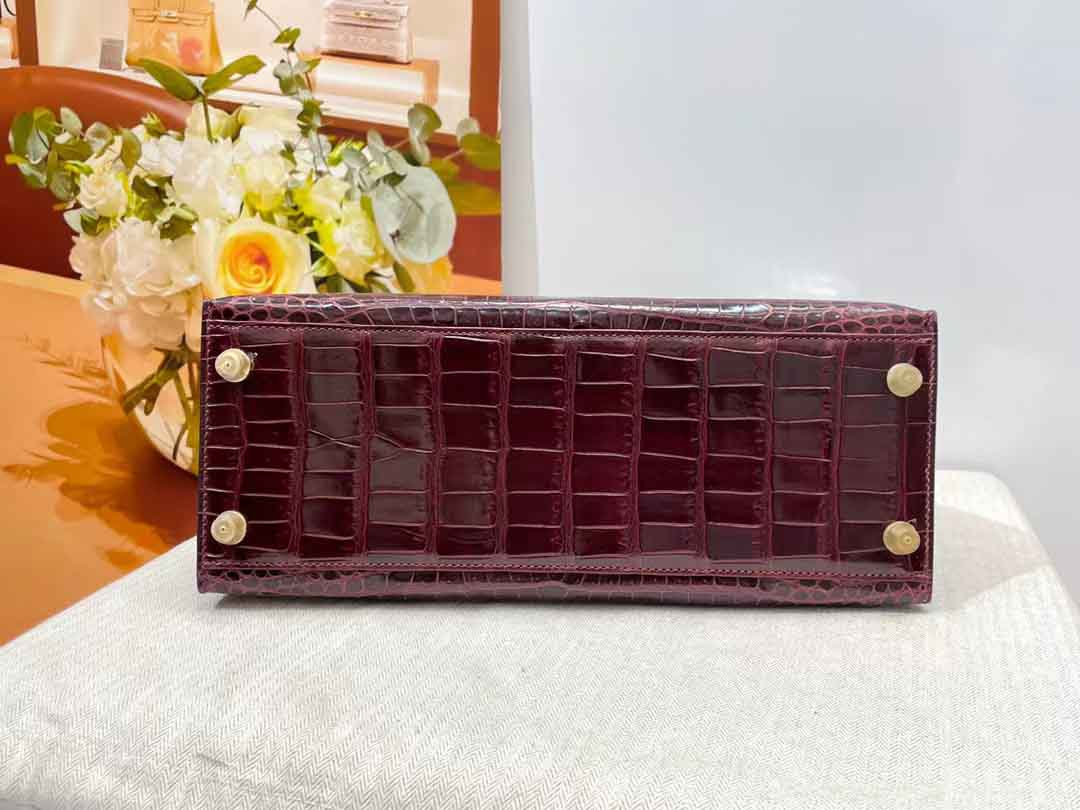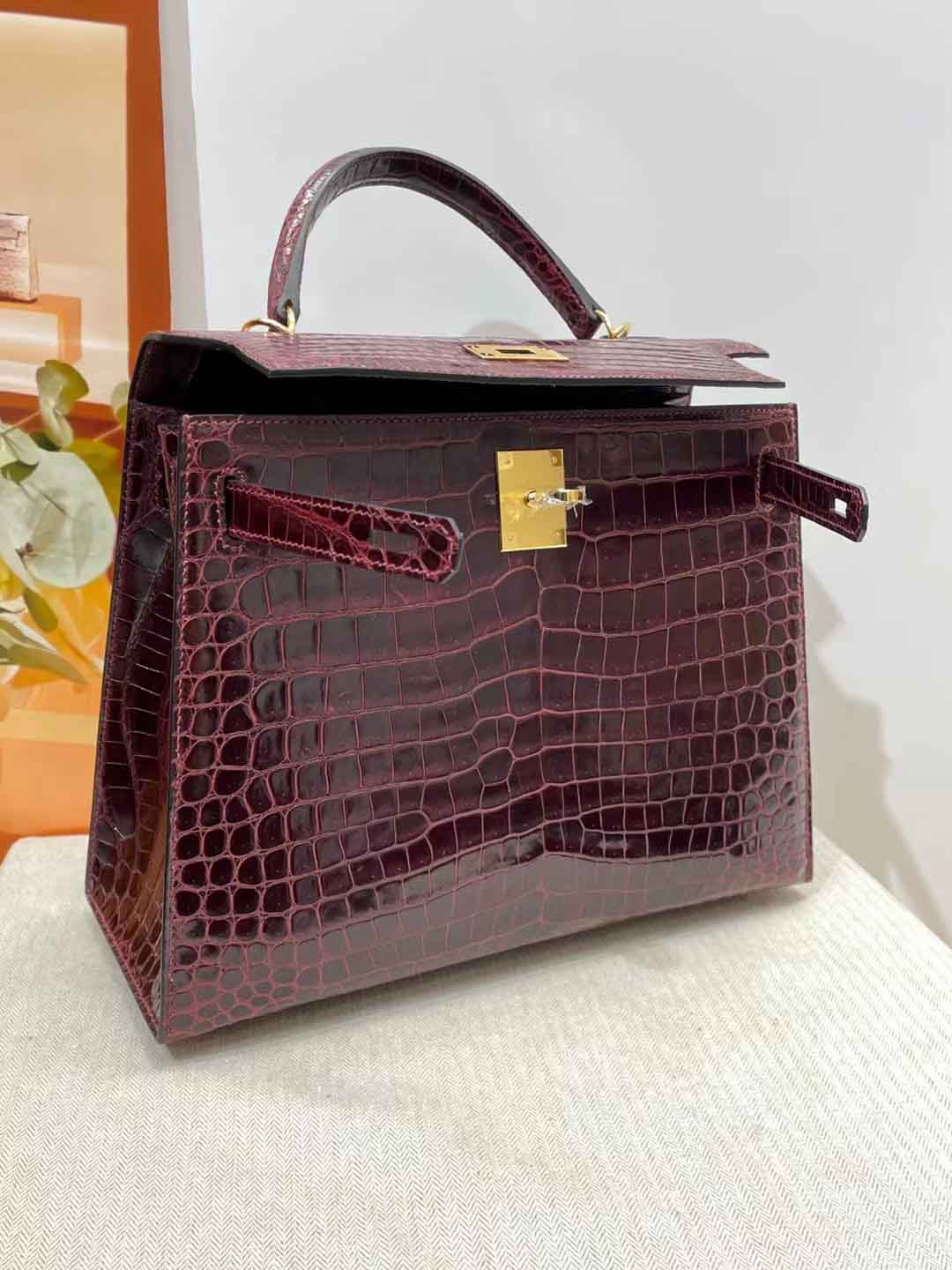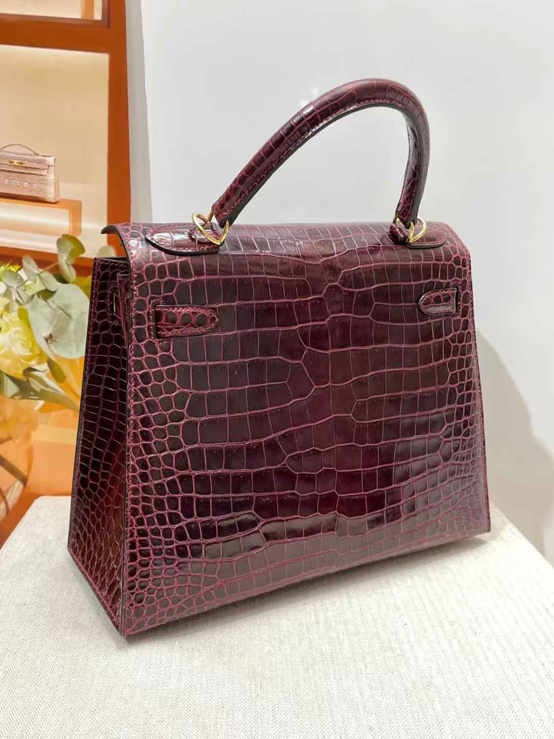 凯莉28CM. 倒V 波尔多 酒红色 hcp进口湾鳄 实拍