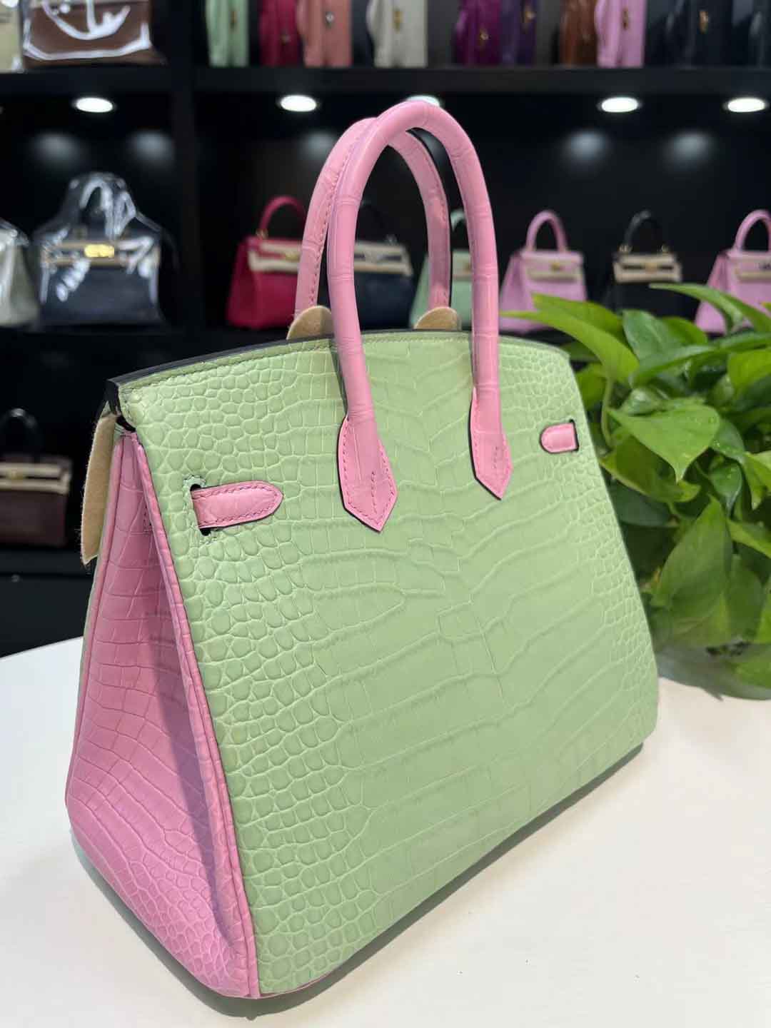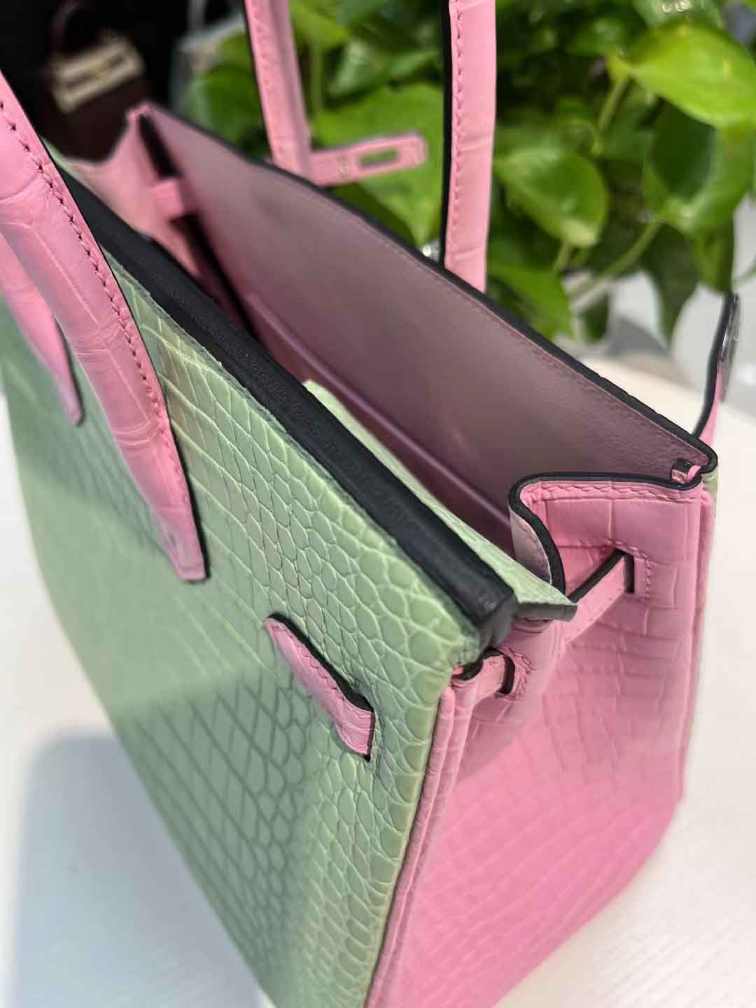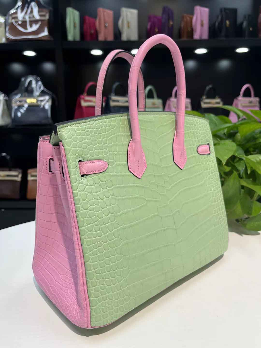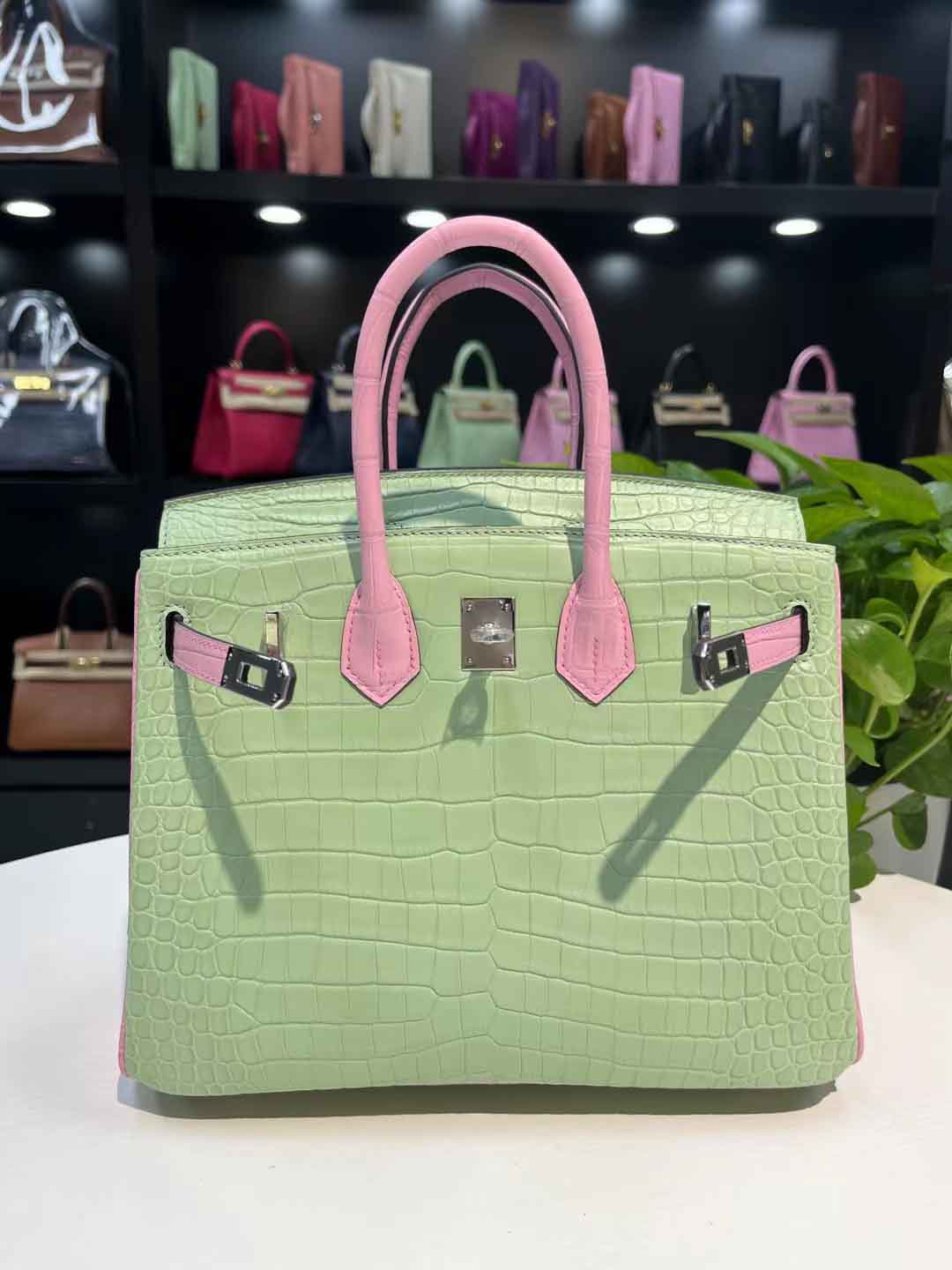雾面外缝鳄鱼皮 铂金手提包 女款薄荷绿拼樱花粉银扣。