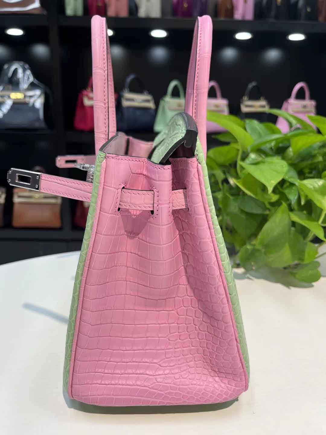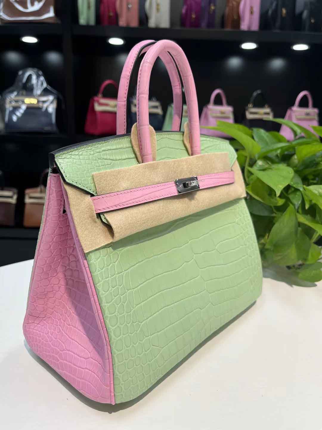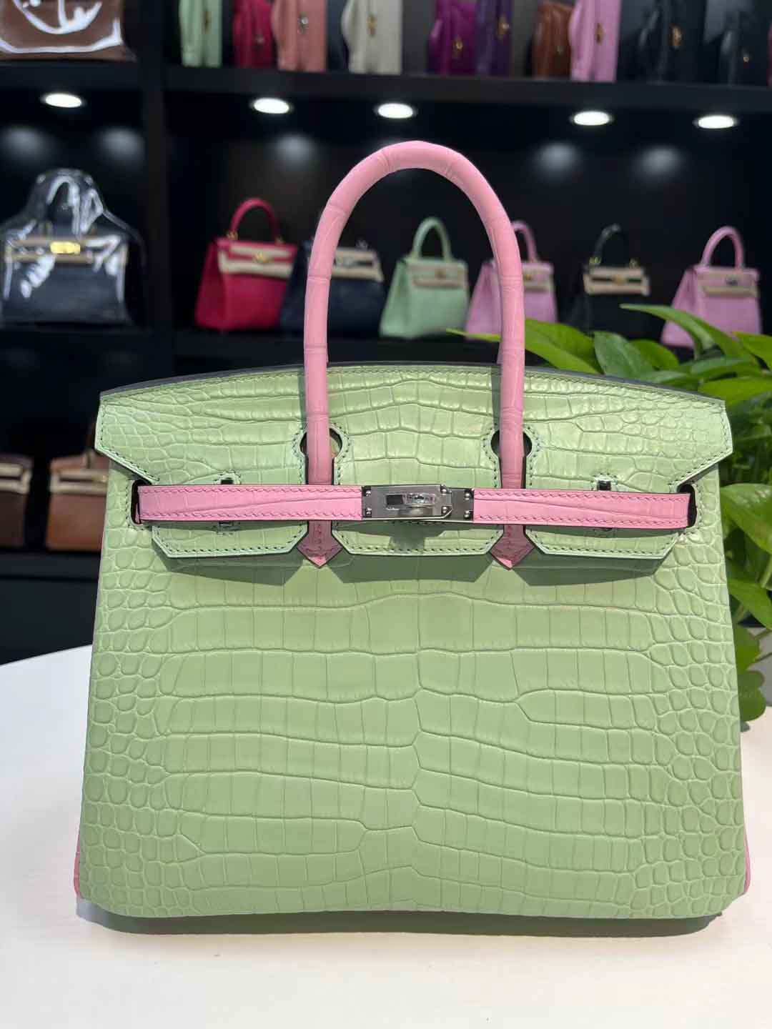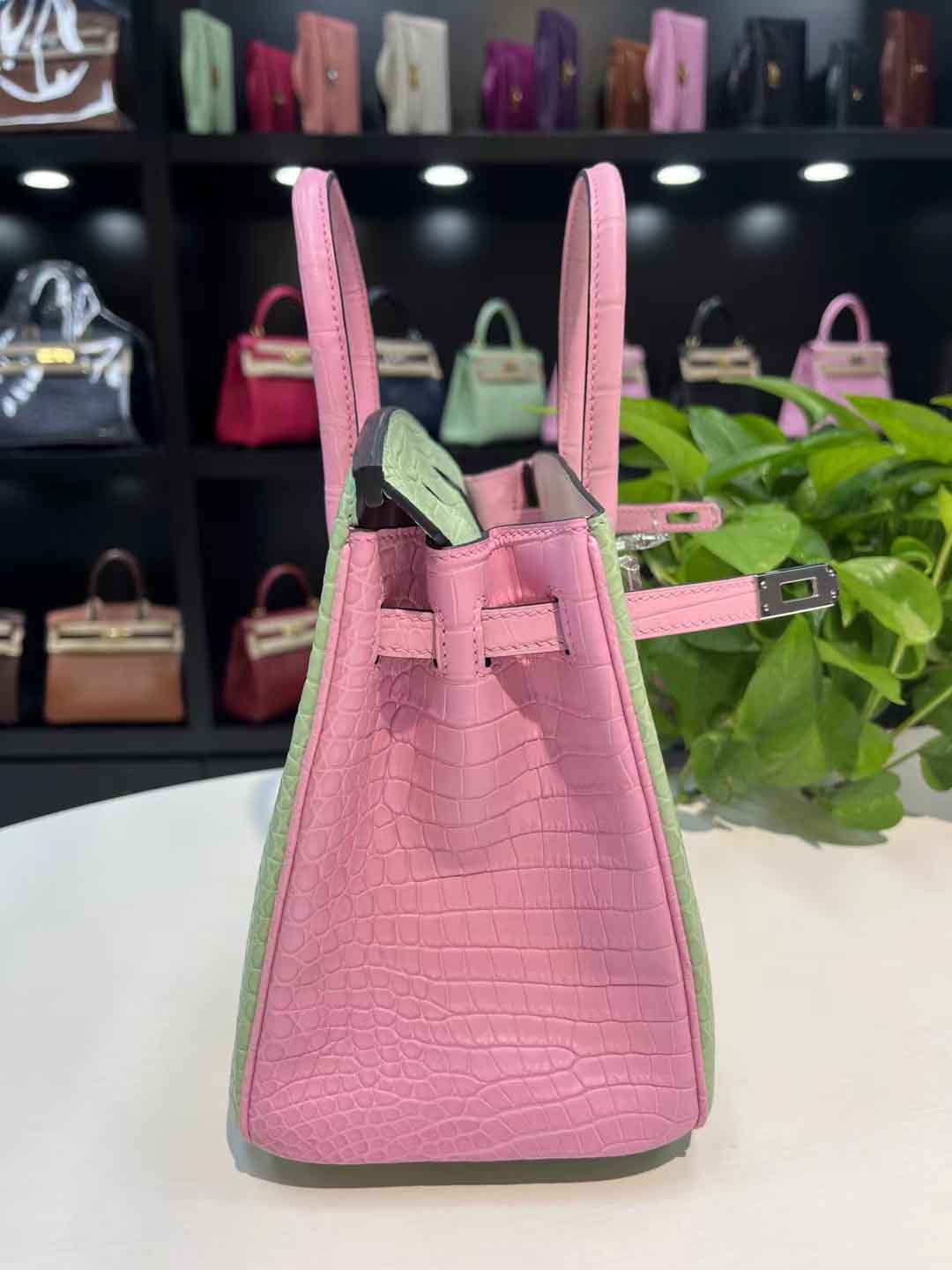 雾面外缝鳄鱼皮 铂金手提包 女款薄荷绿拼樱花粉银扣。