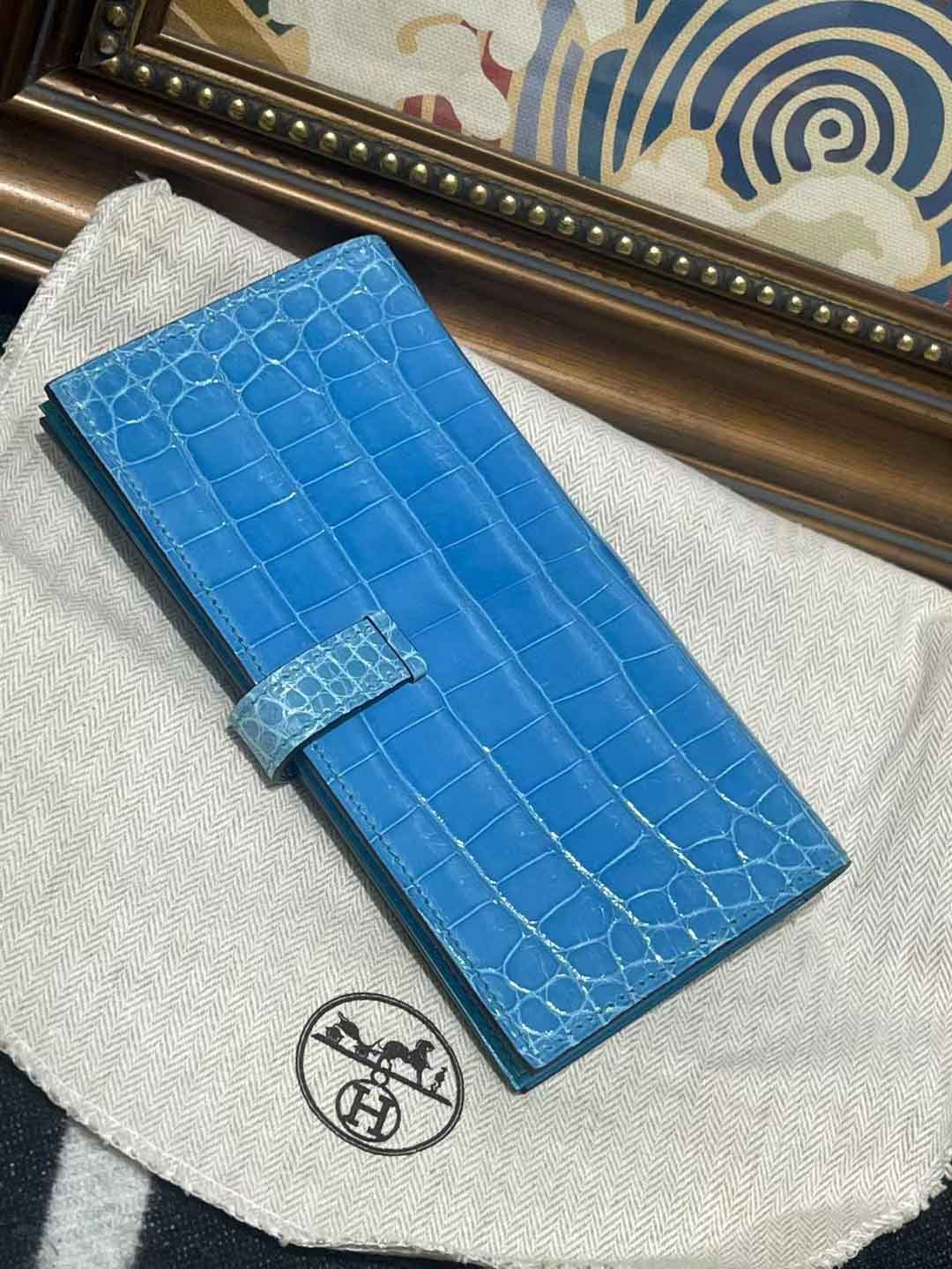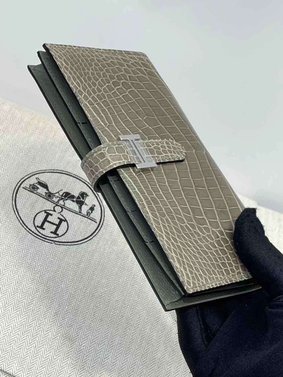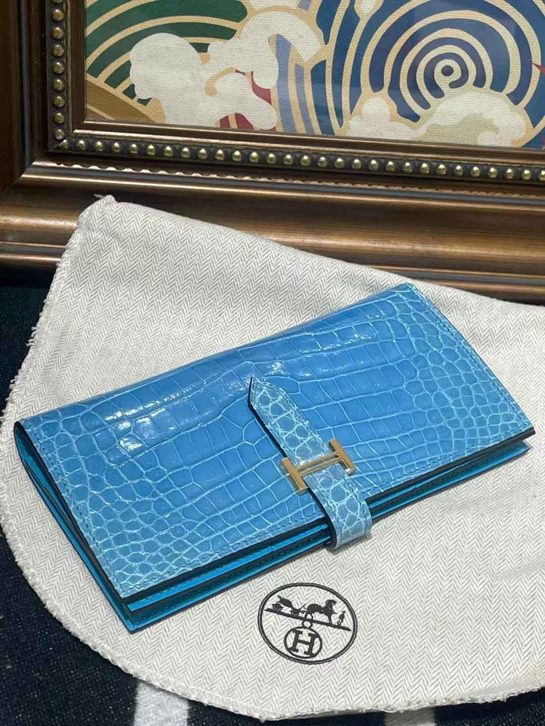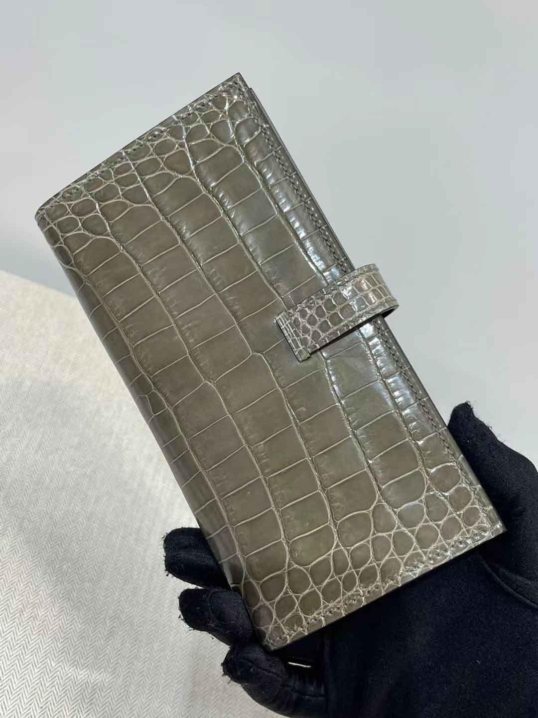 H扣Bean钱夹,进口高光鳄鱼皮!蜜蜡线手工缝制!尺寸17.5,9,2 现货供应,微信联系礼品订制 95506803