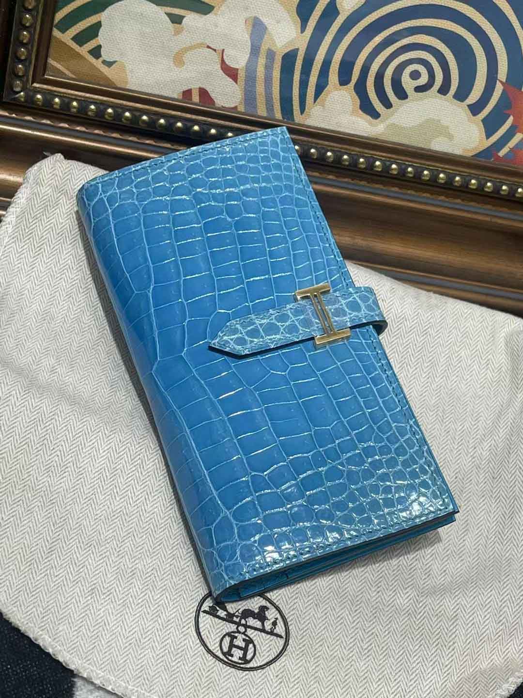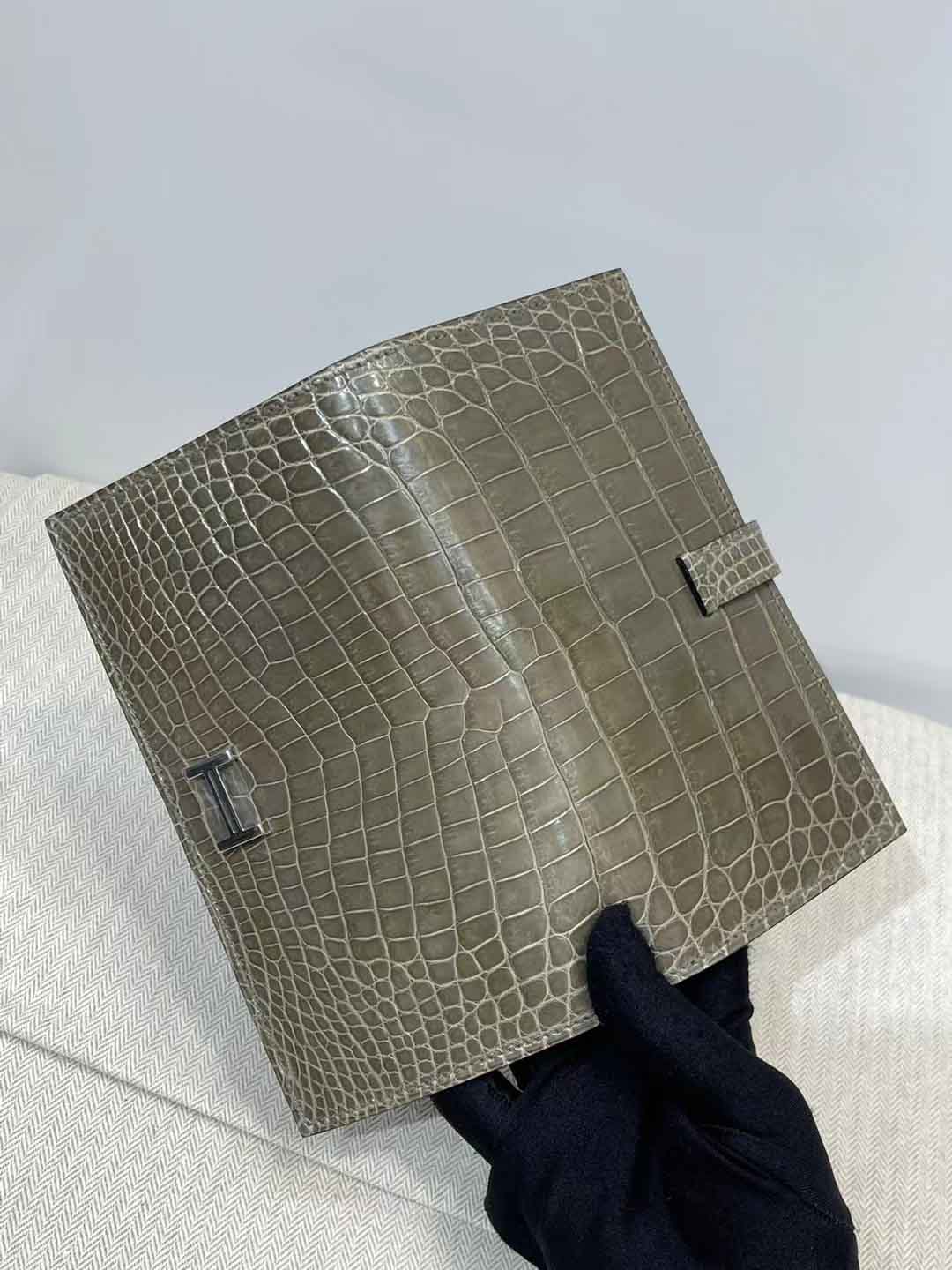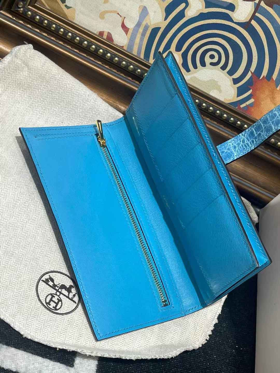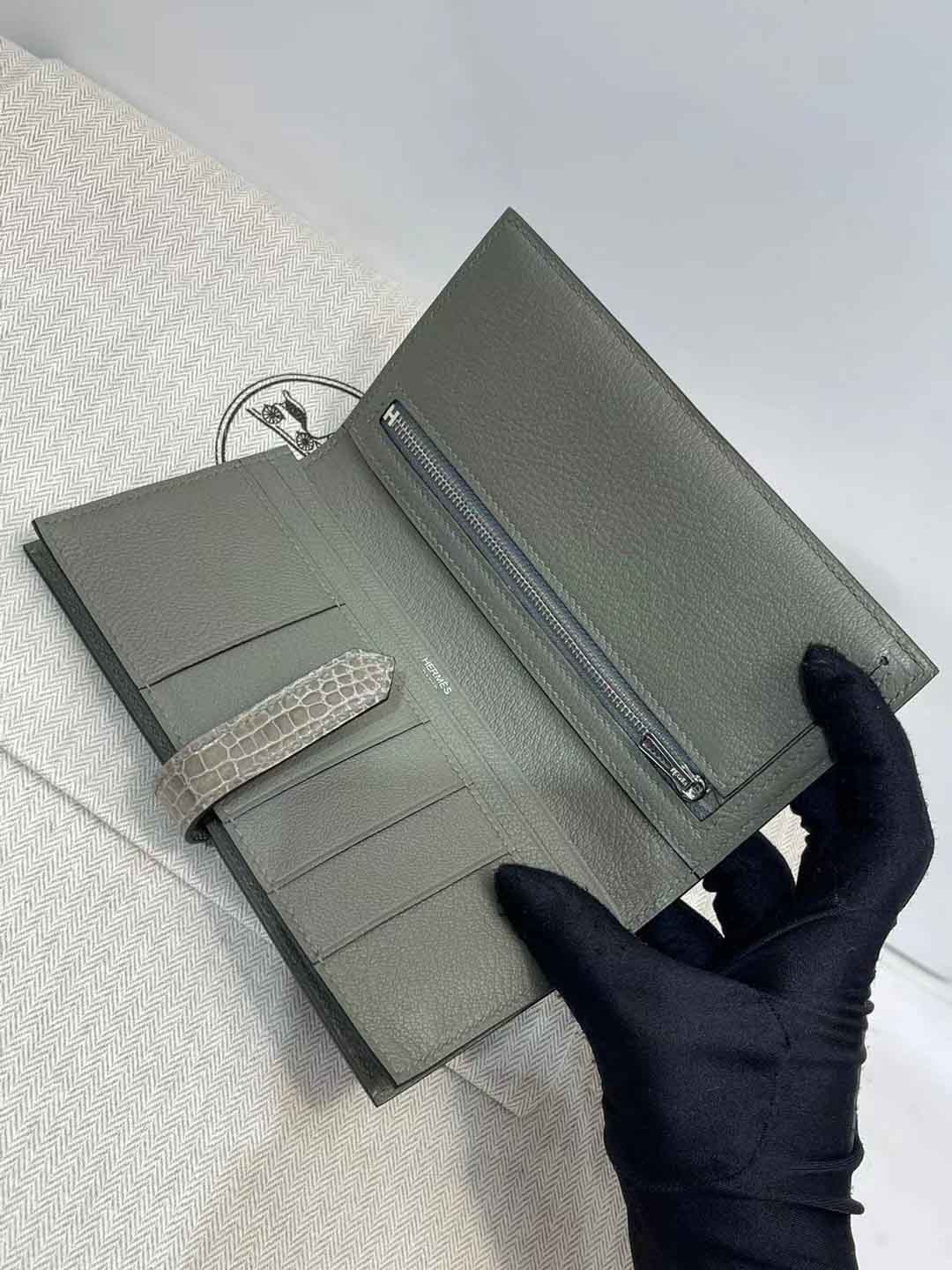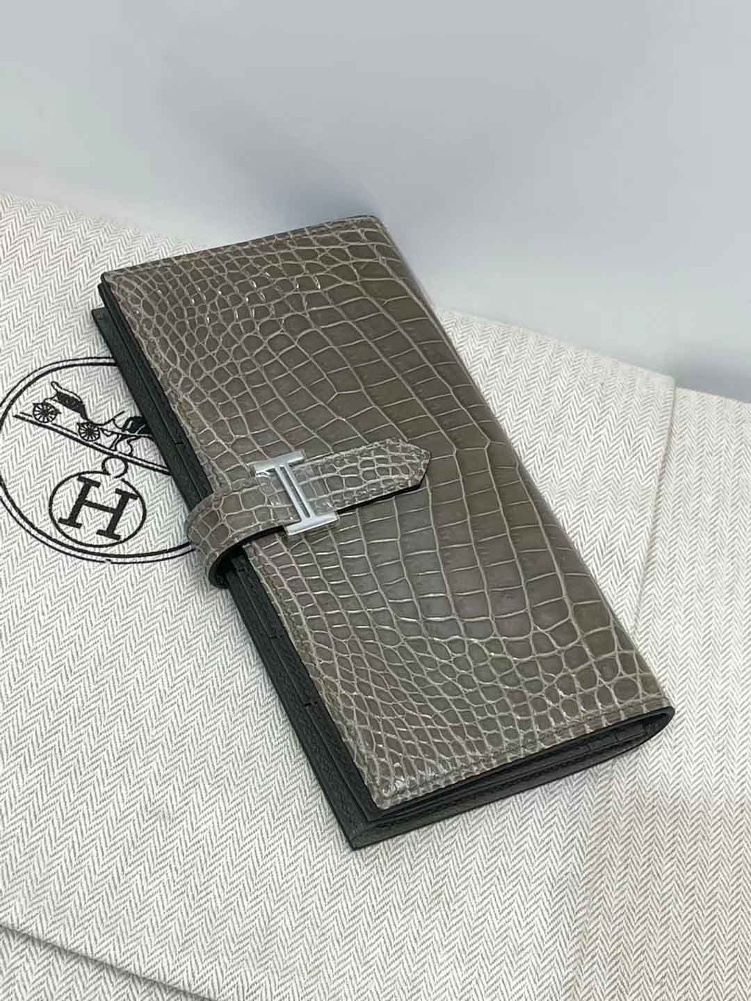 H扣Bean钱夹,进口高光鳄鱼皮!蜜蜡线手工缝制!尺寸17.5,9,2 现货供应,微信联系礼品订制 95506803