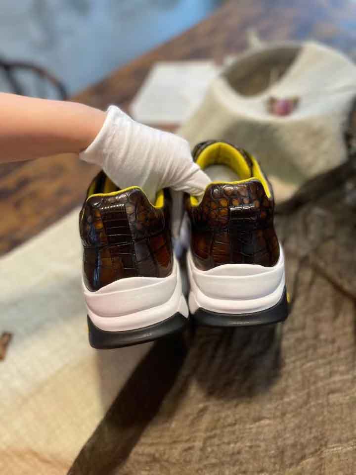 尼罗鳄鱼皮休闲运动鞋,采用羊皮内里,意大利vibram大底,patina擦色工艺,琥珀黄色鞋我是这条街上最潮的人。