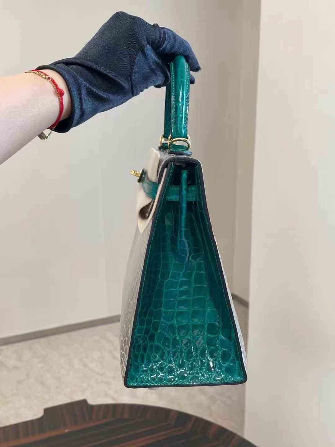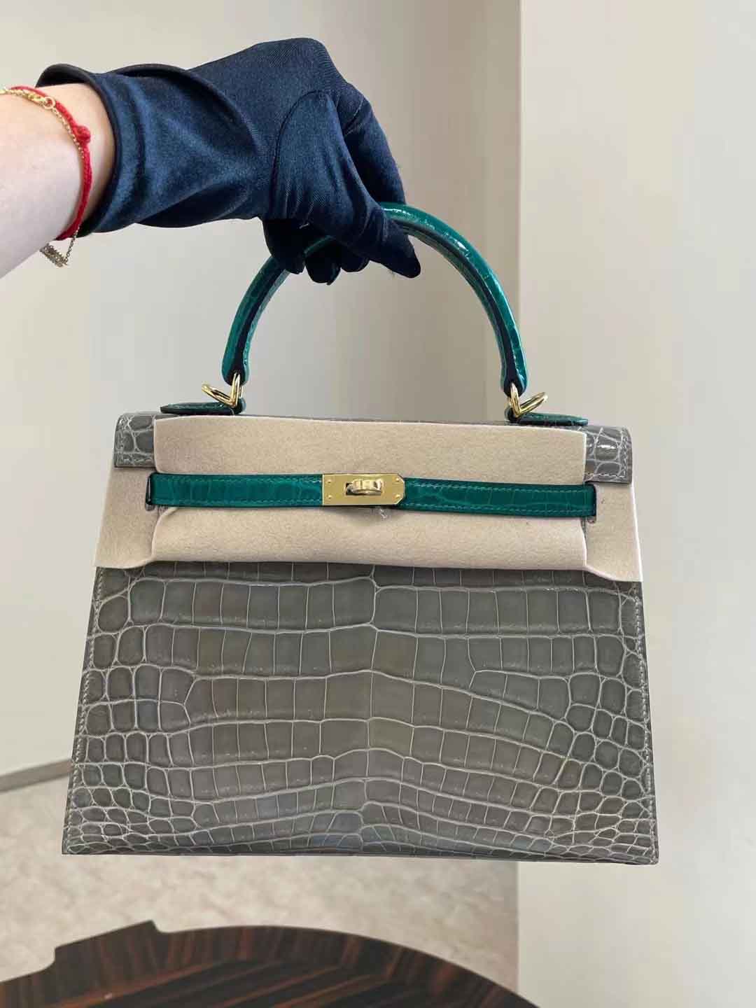 Kelly25 Cro 鳄鱼皮 手工蜡线缝制 斑鸠灰配翡翠绿 金扣 客订 ️ ️