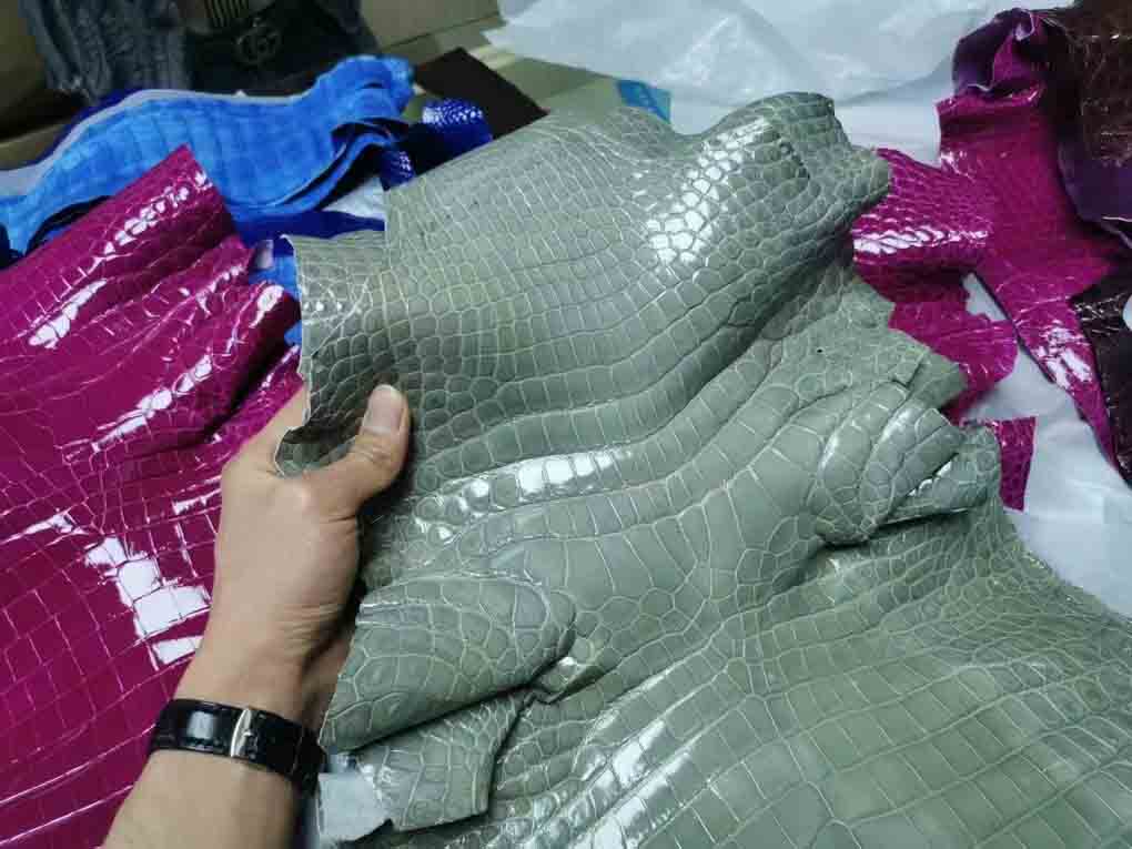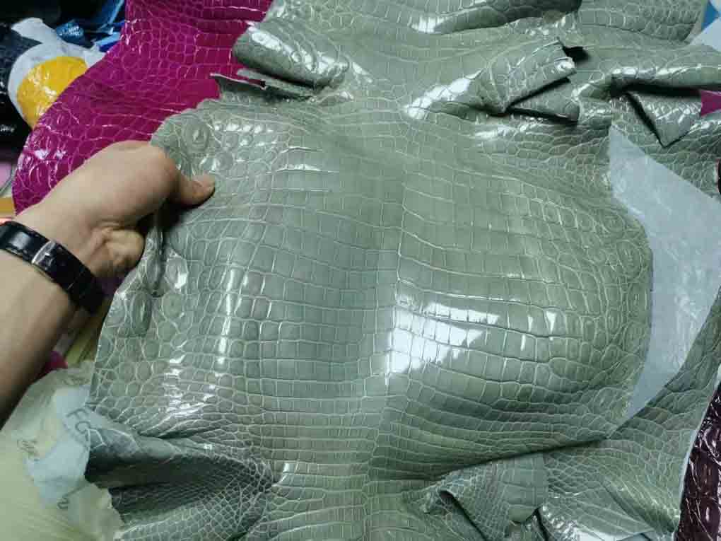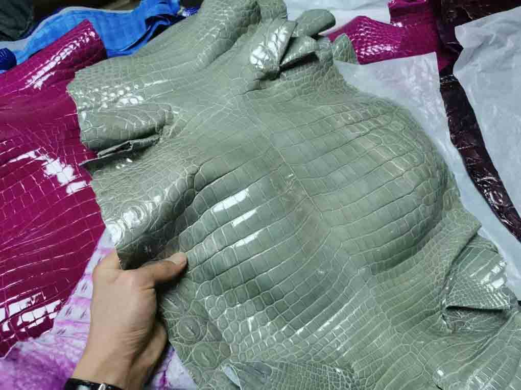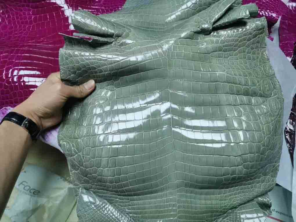 高光尼罗灰绿色鳄鱼皮料订做厂家,定做自己喜欢颜色的鳄鱼皮。也可以订制自己喜欢款式的鳄鱼皮皮具。