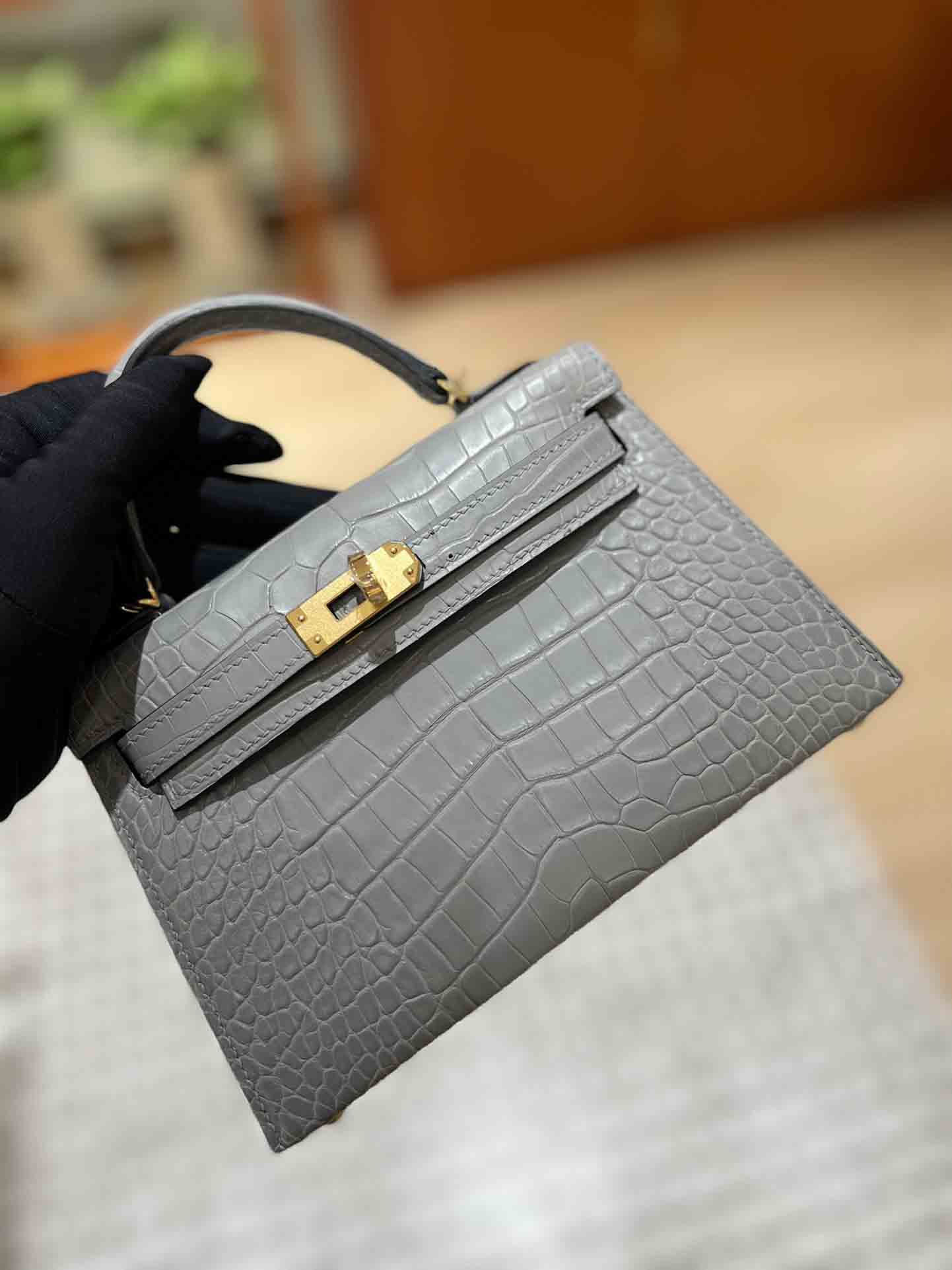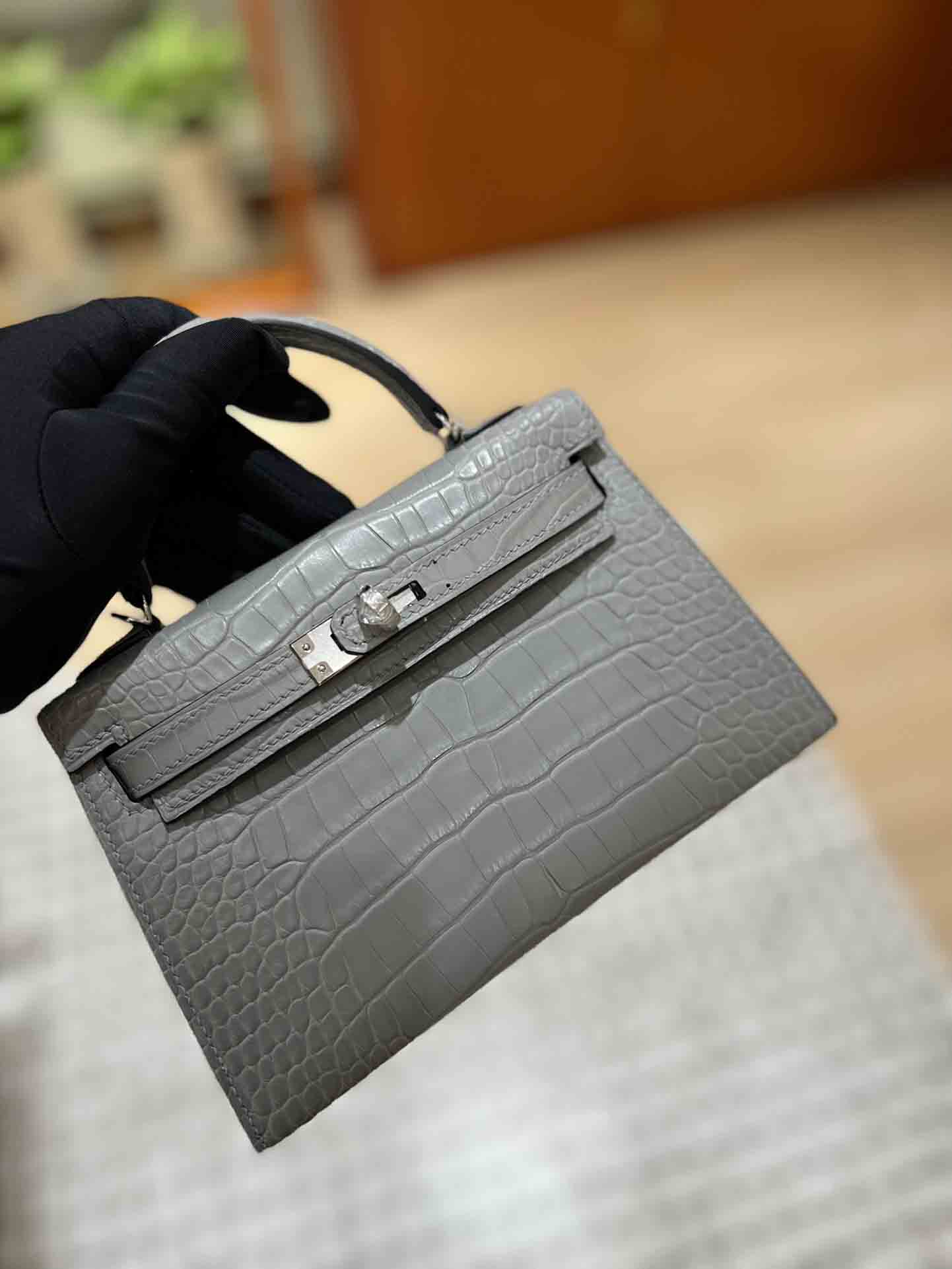 Mini 凯莉二代石墨灰法国hcp进口雾面美洲鳄鱼皮手工包定制凯莉包 。
