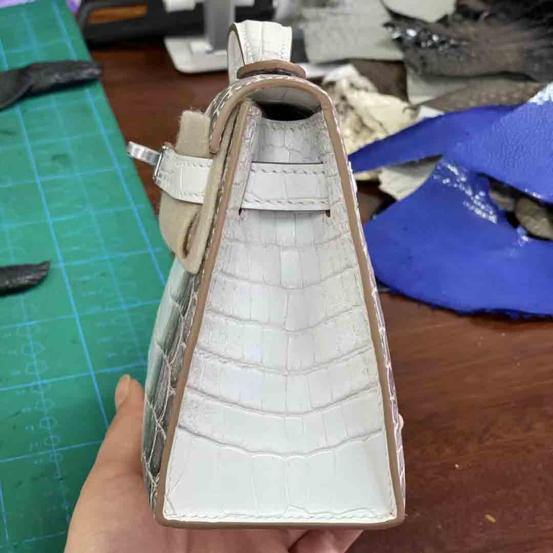 喜马拉雅白色凯丽包 爱马仕经典女包中的凯莉包(Kelly)也一包难求,这个系列是爱马仕的招牌,由于做工繁杂,数量稀有。