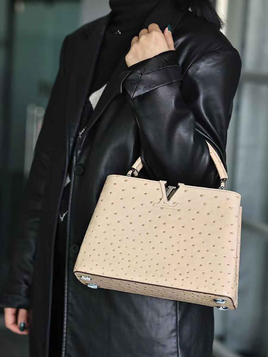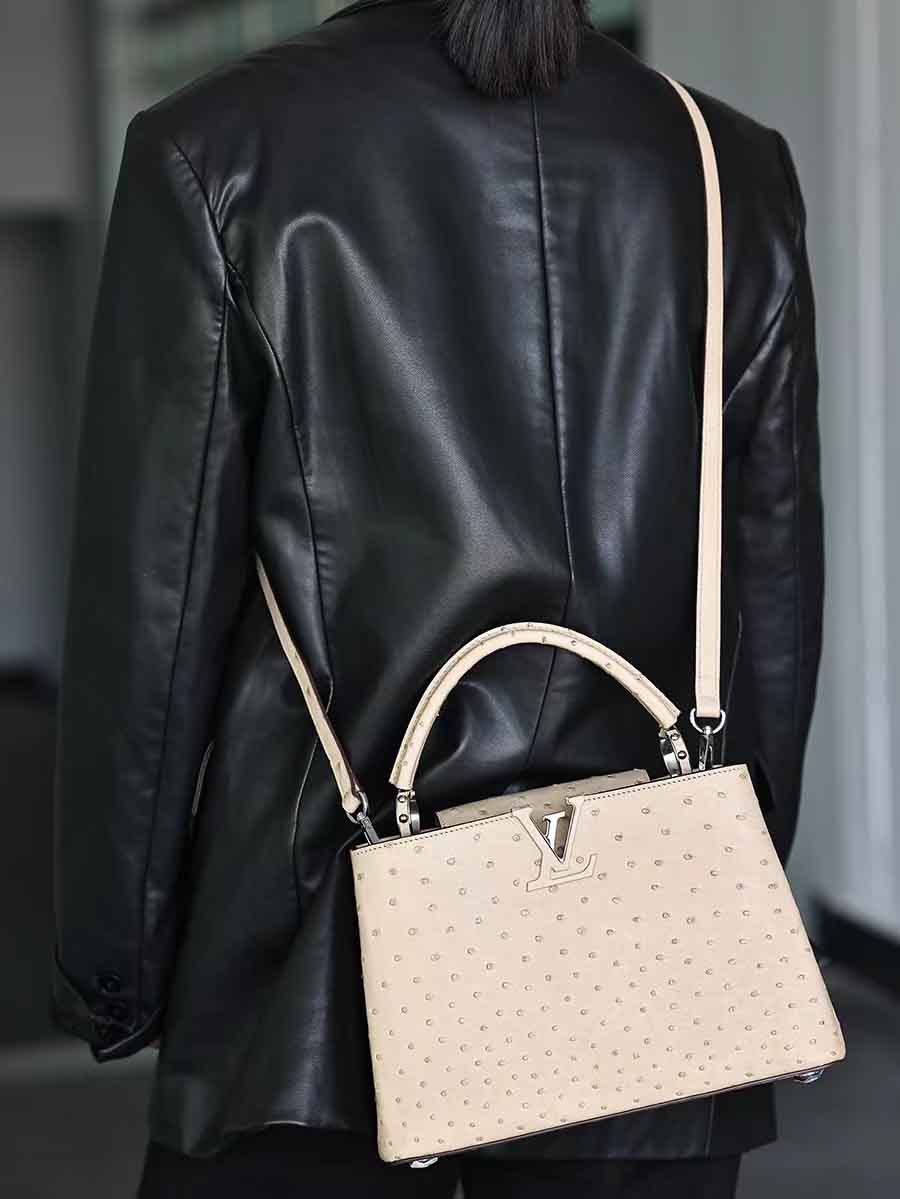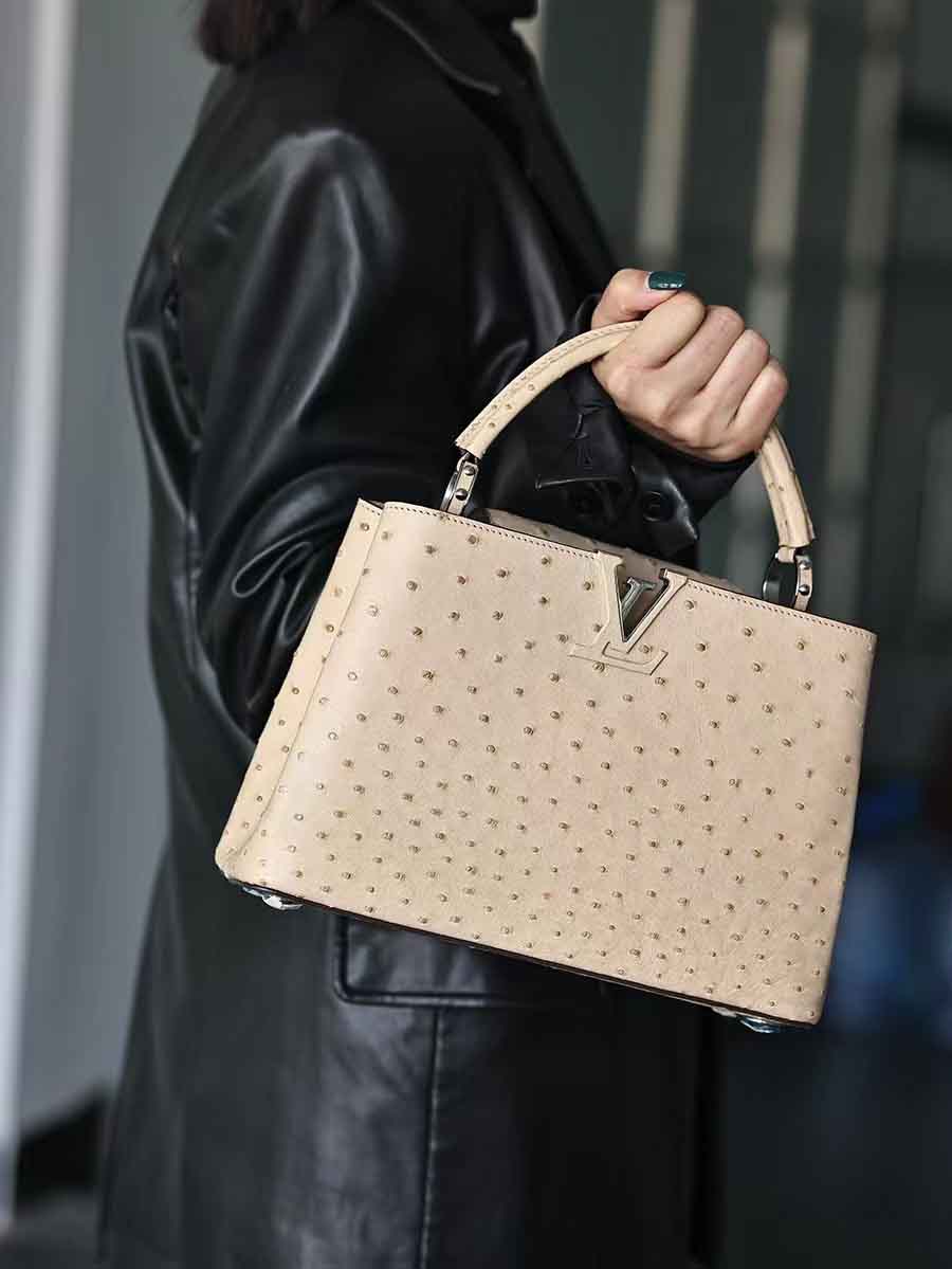 Capucines 27,羊毛白鸵鸟皮,实拍现货。羊毛白鸵鸟皮女手提包,羊毛白鸵鸟皮单肩包定做工厂