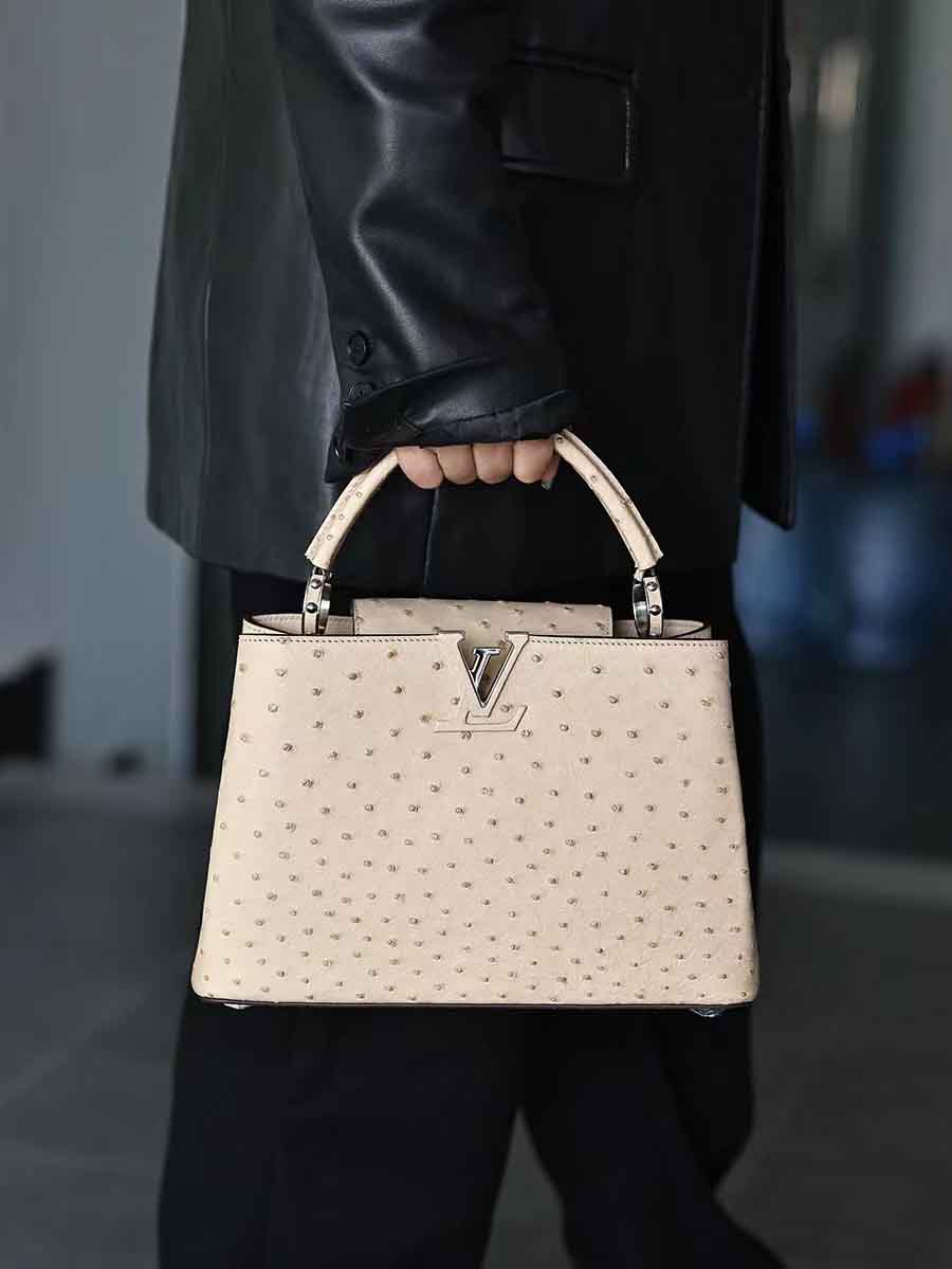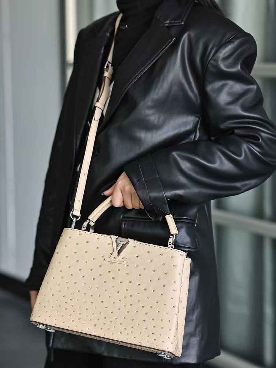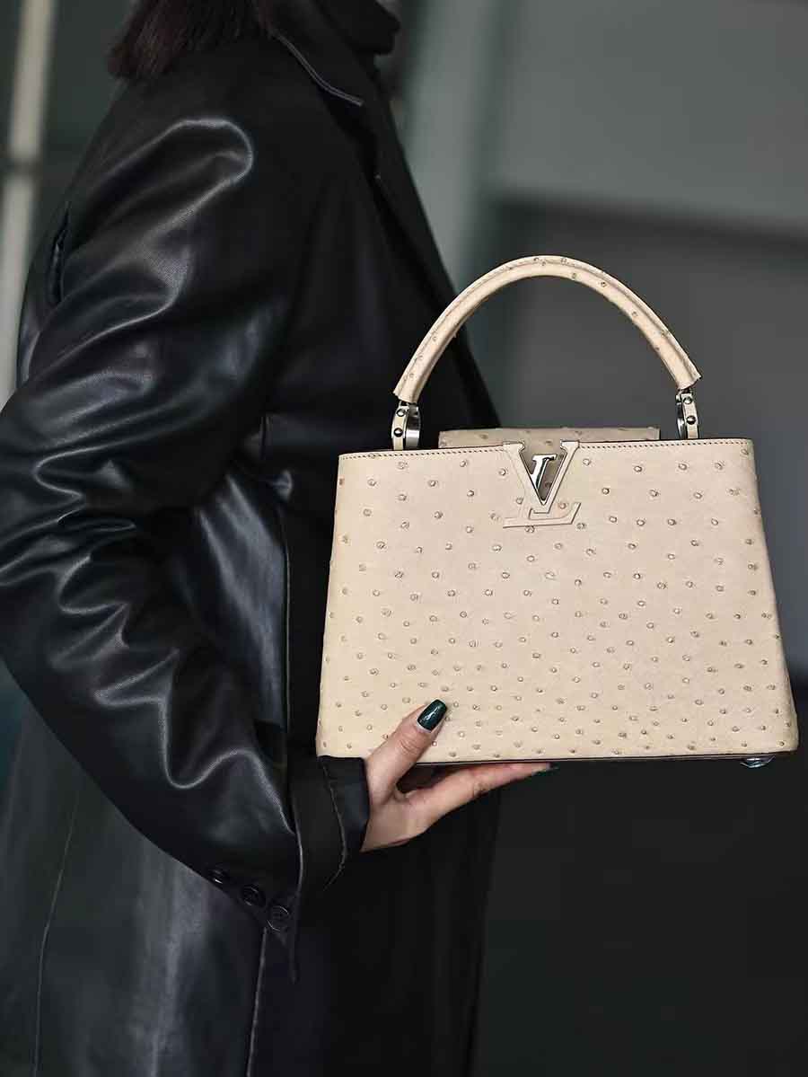 Capucines 27,羊毛白鸵鸟皮,实拍现货。羊毛白鸵鸟皮女手提包,羊毛白鸵鸟皮单肩包定做工厂