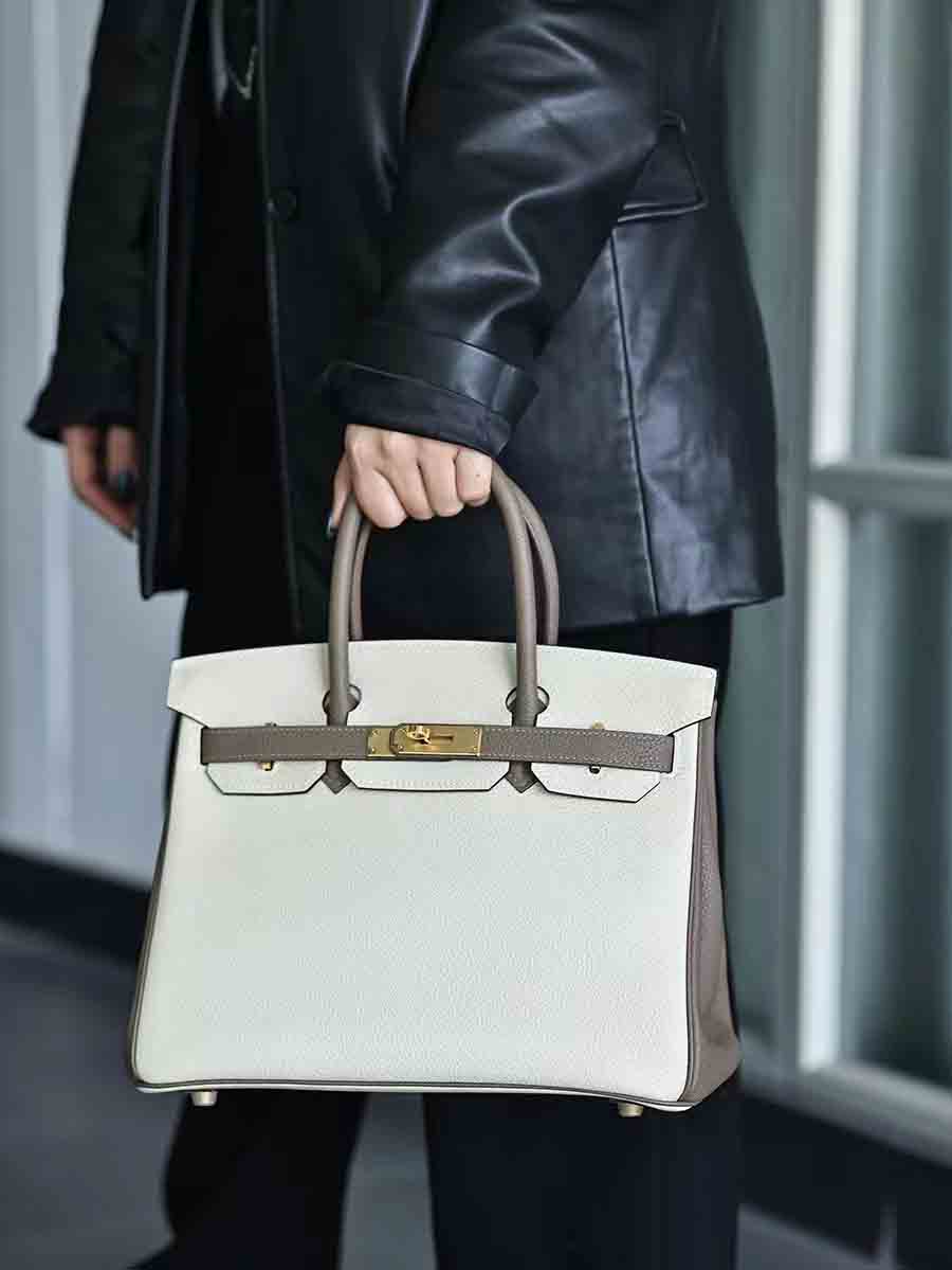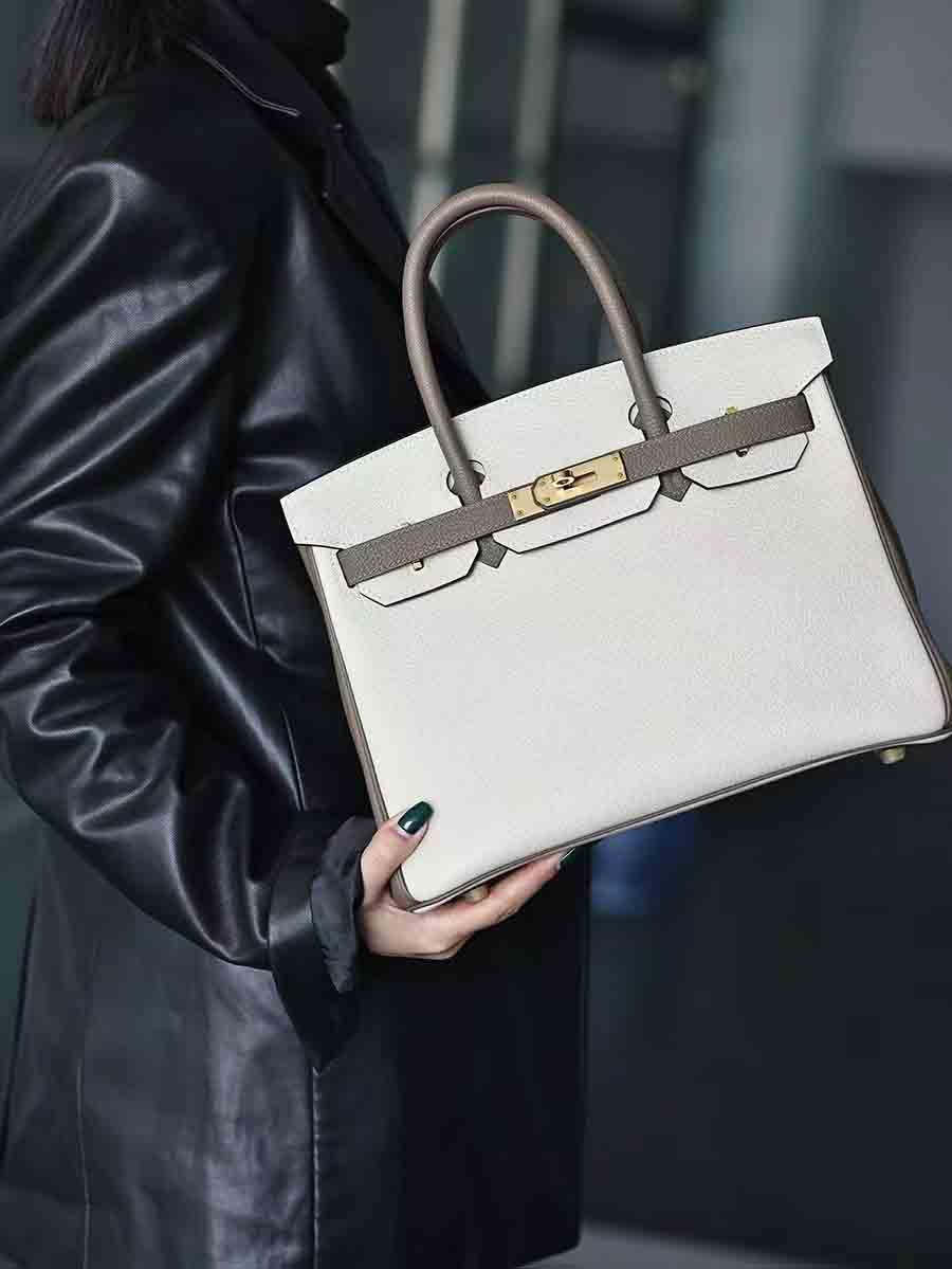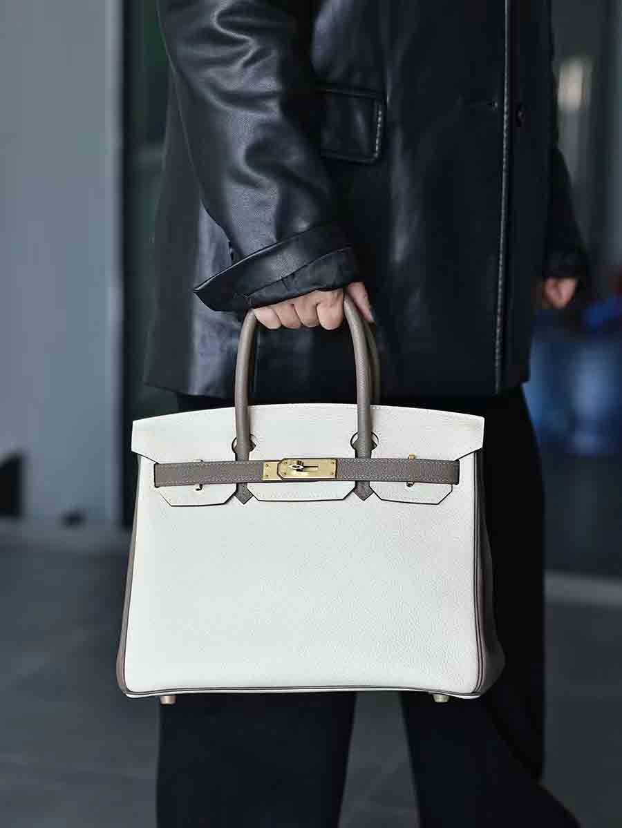 Togo拼色birkin30 奶昔白拼大象灰金扣 手缝女手提包定制