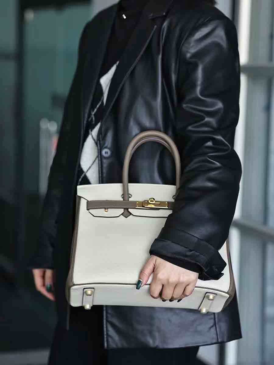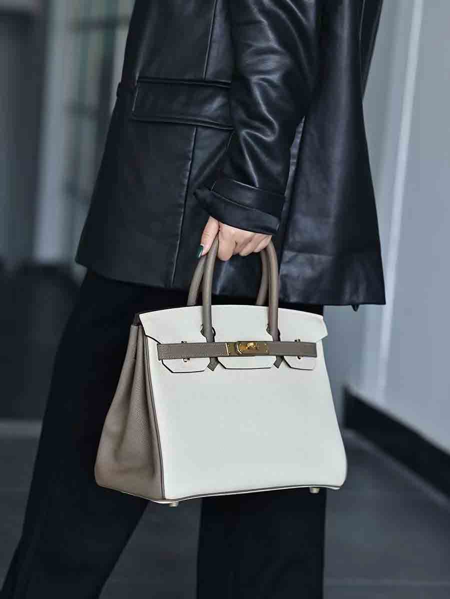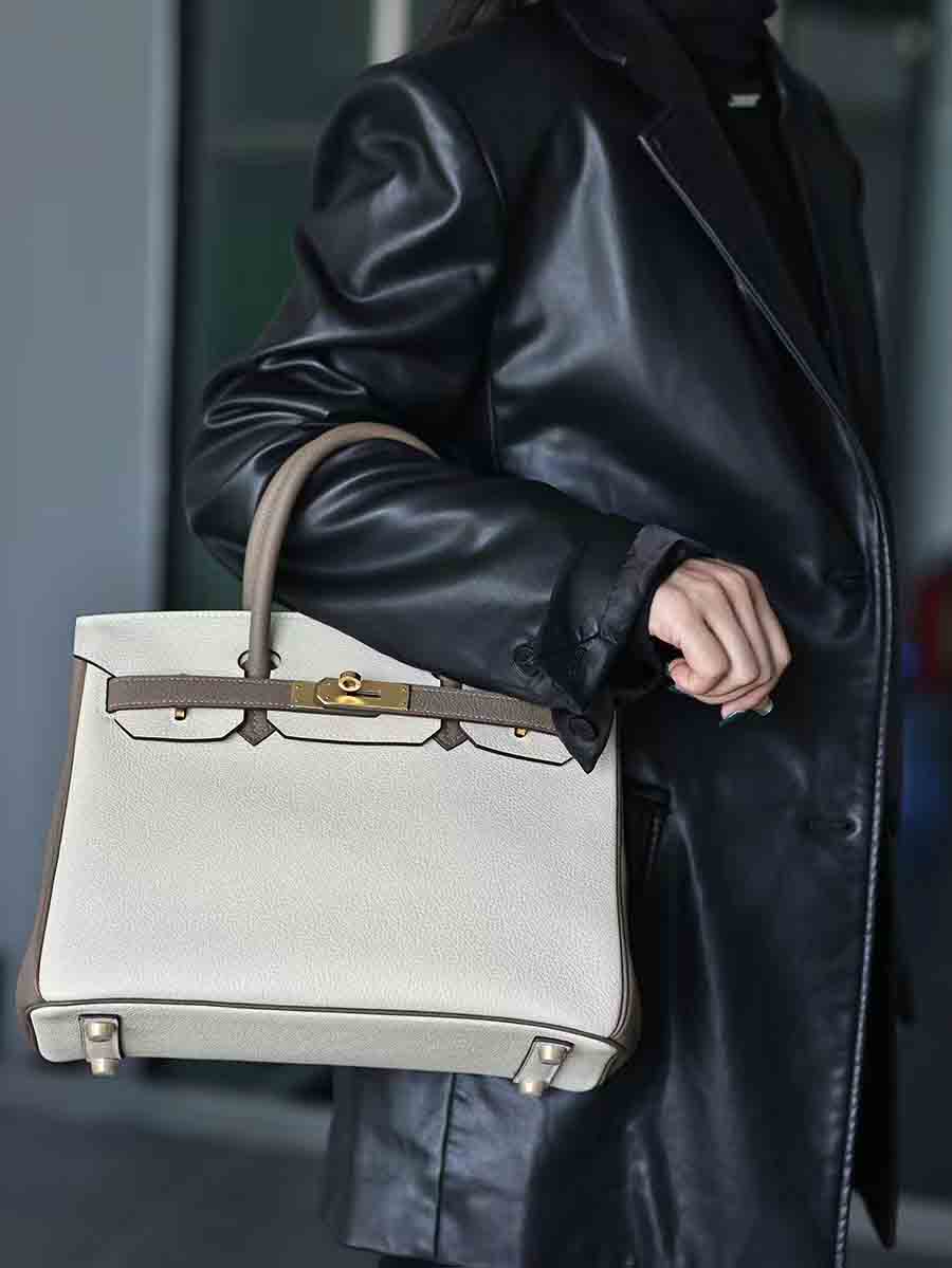 Togo拼色birkin30 奶昔白拼大象灰金扣 手缝女手提包定制