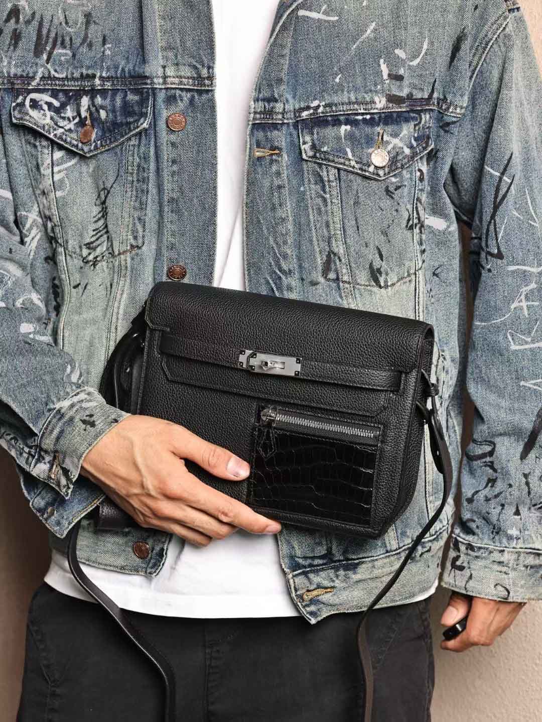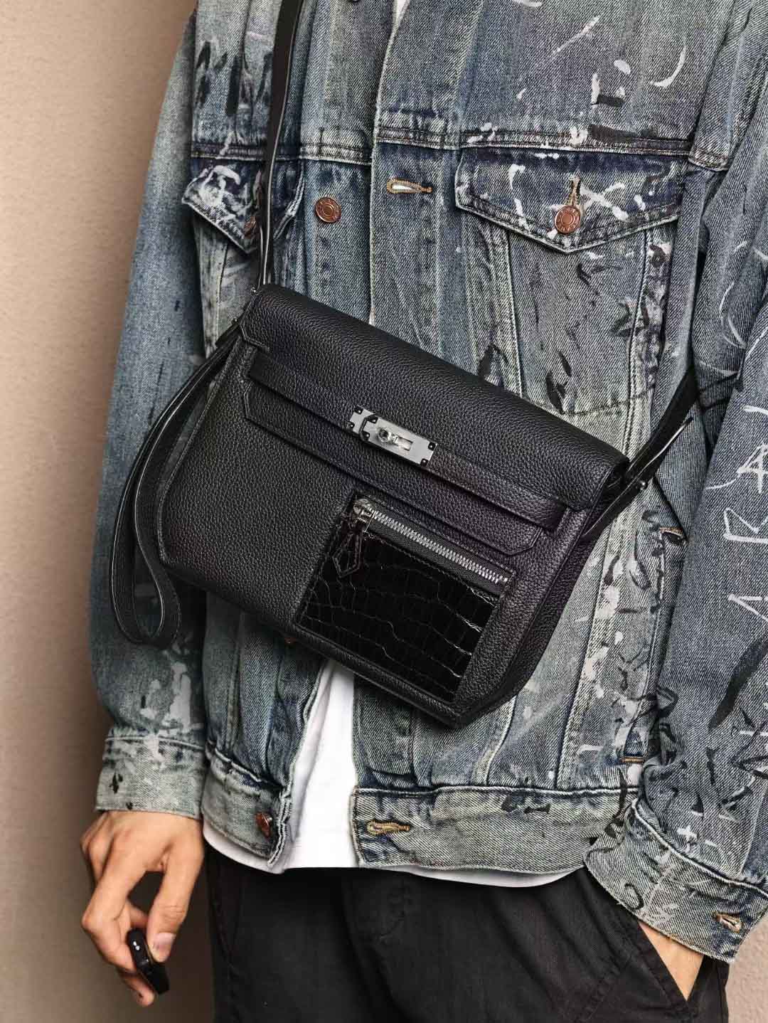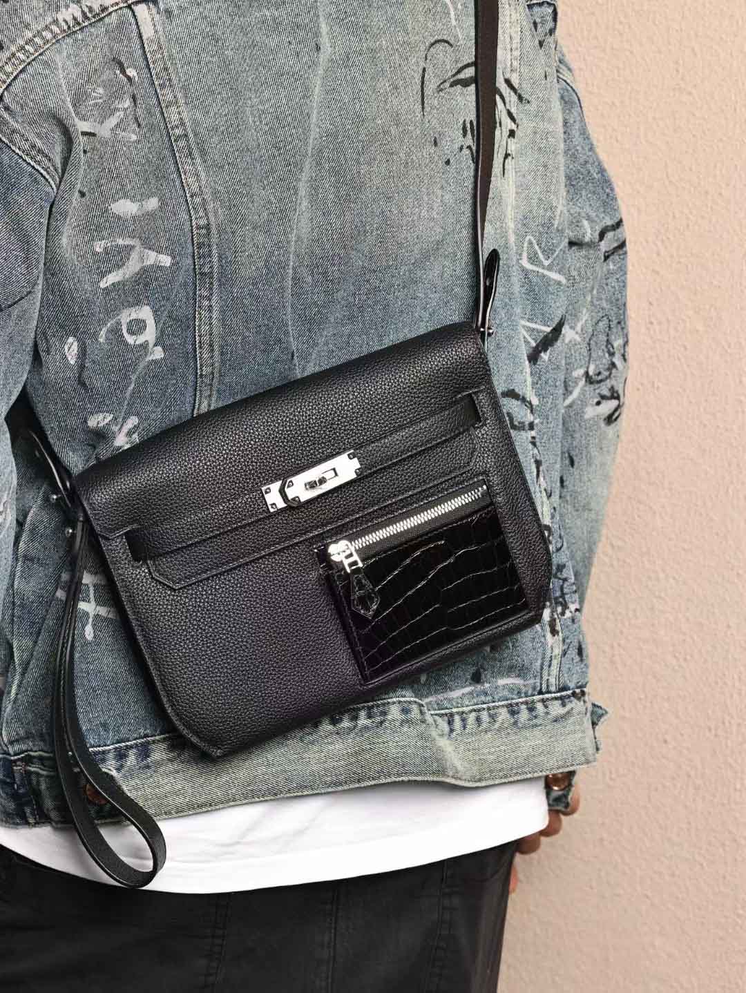 Kelly Depeches25手拿包单肩包,黑色Togo拼亮面黑色湾鳄口袋版本,实拍现货。