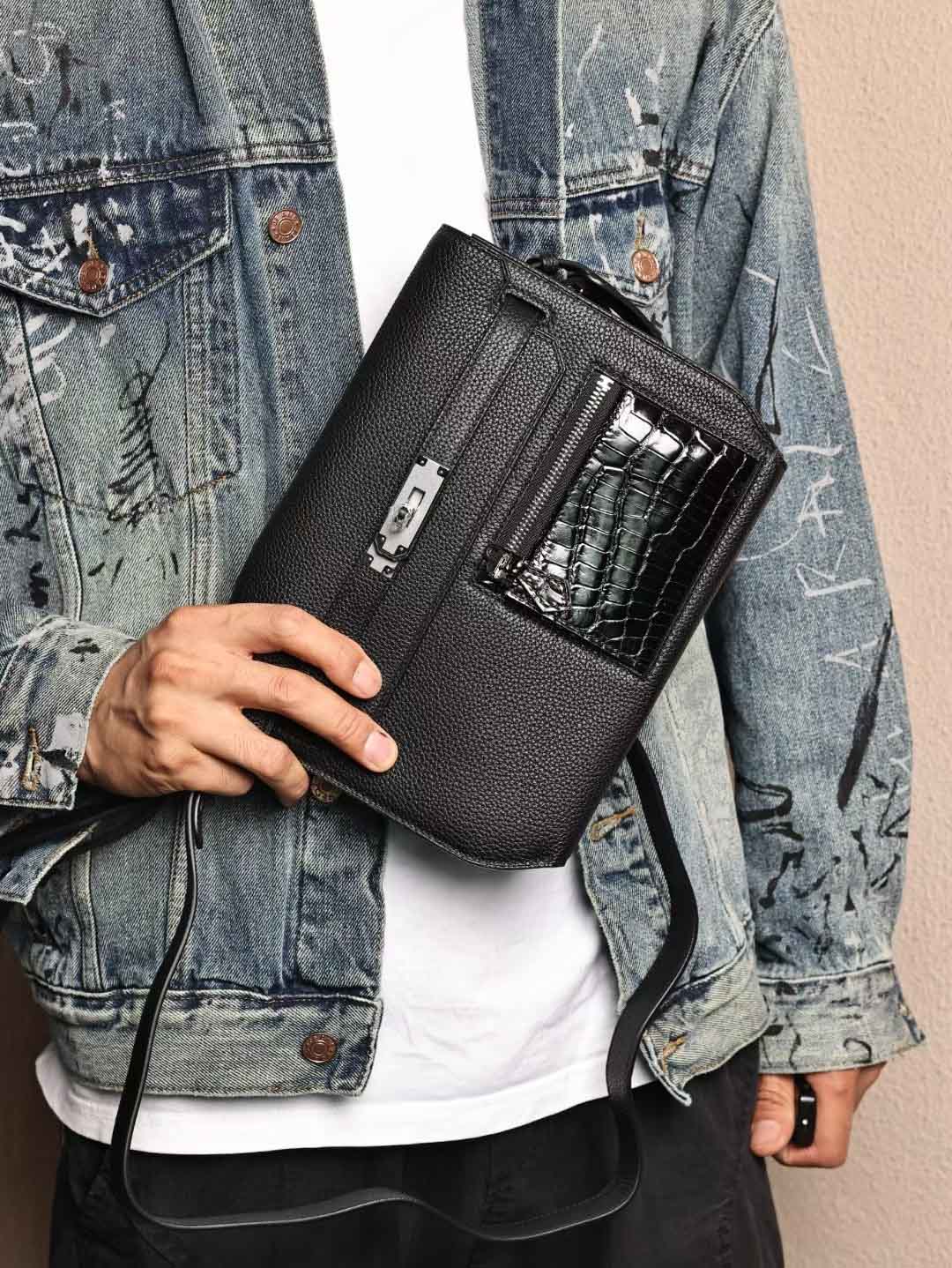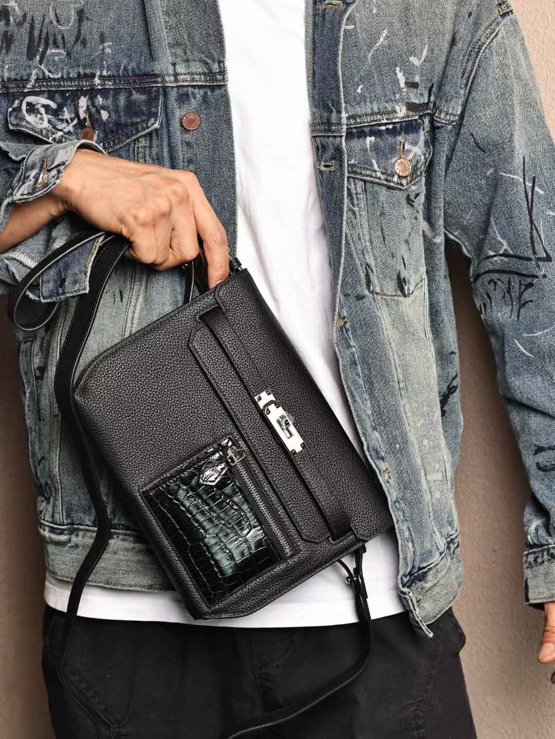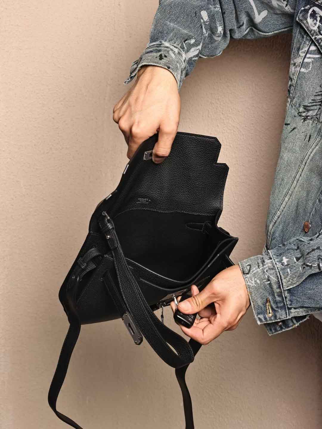 Kelly Depeches25手拿包单肩包,黑色Togo拼亮面黑色湾鳄口袋版本,实拍现货。