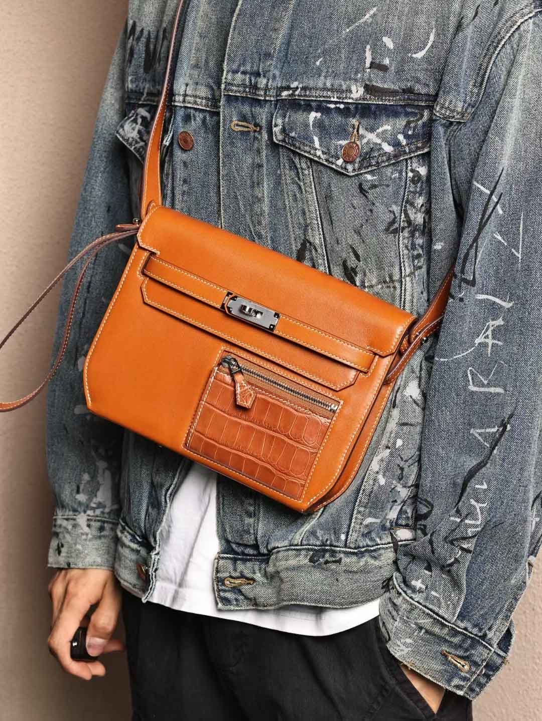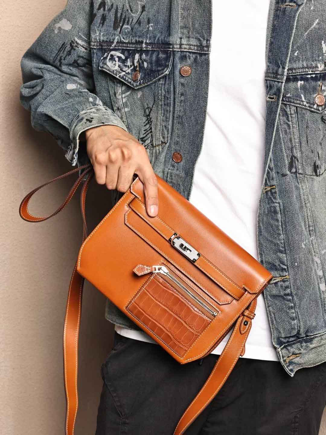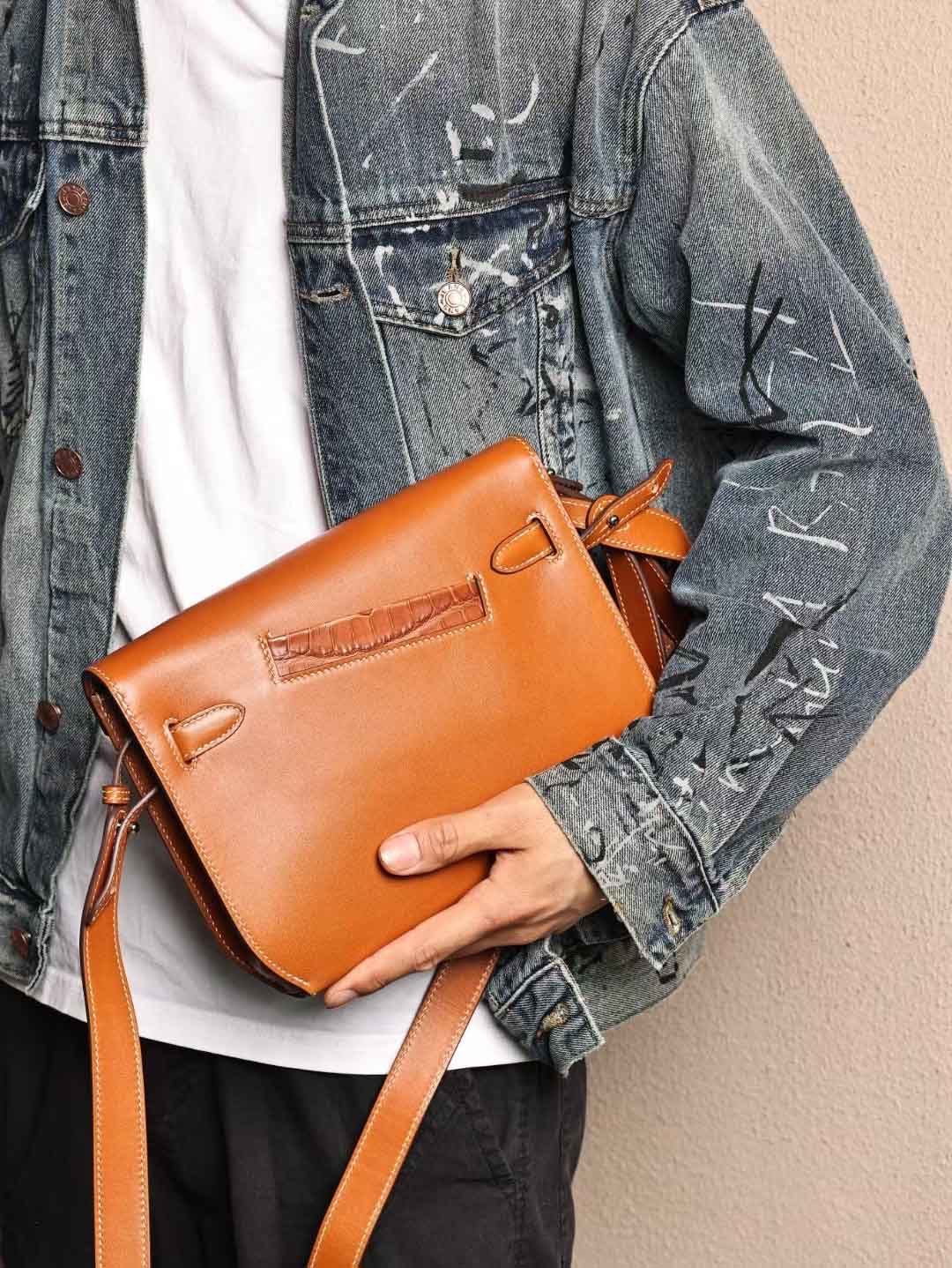 Kelly Depeches25手拿包,金棕色Box拼哑光马鞍色美洲鳄口袋,实拍现货。