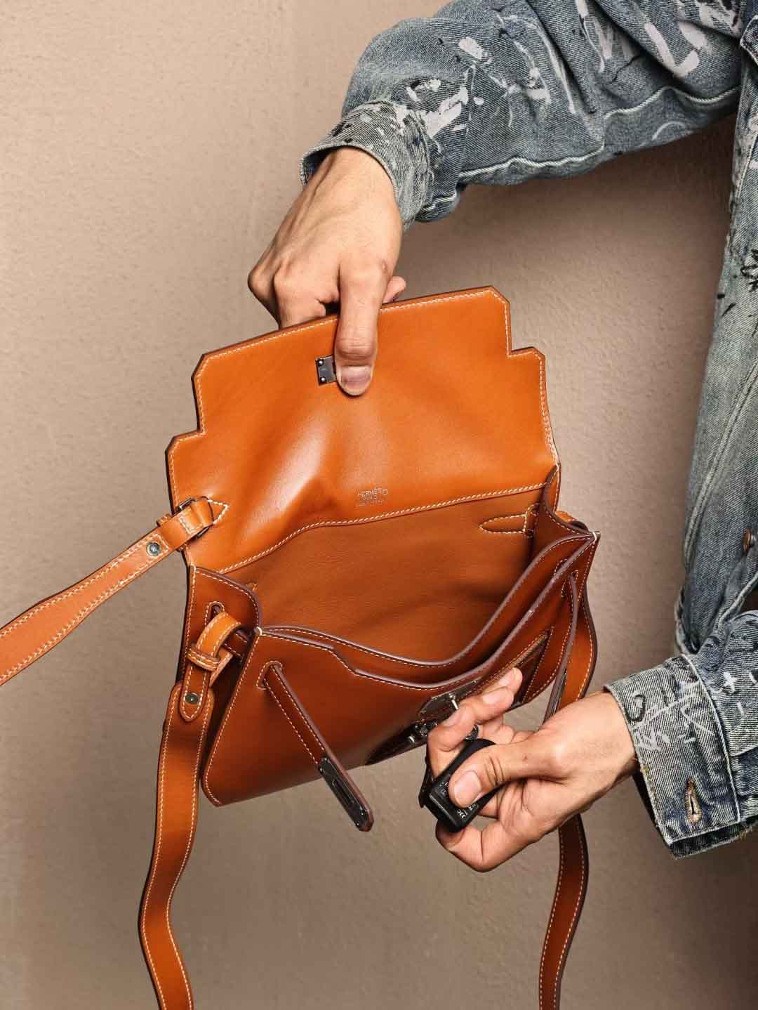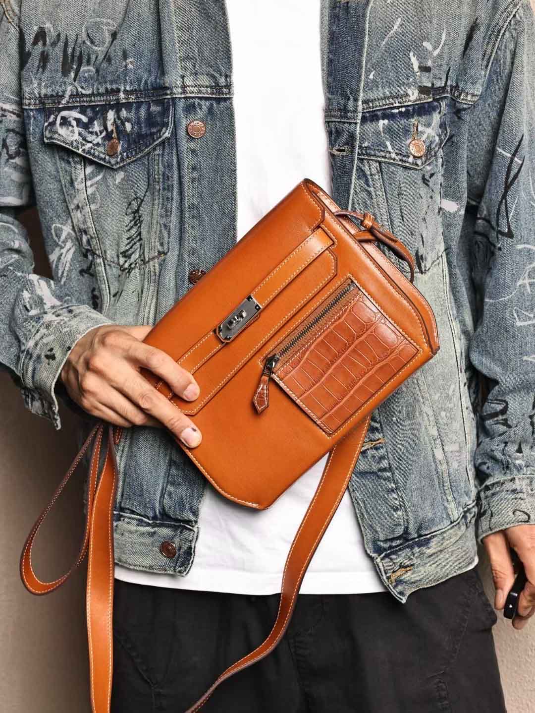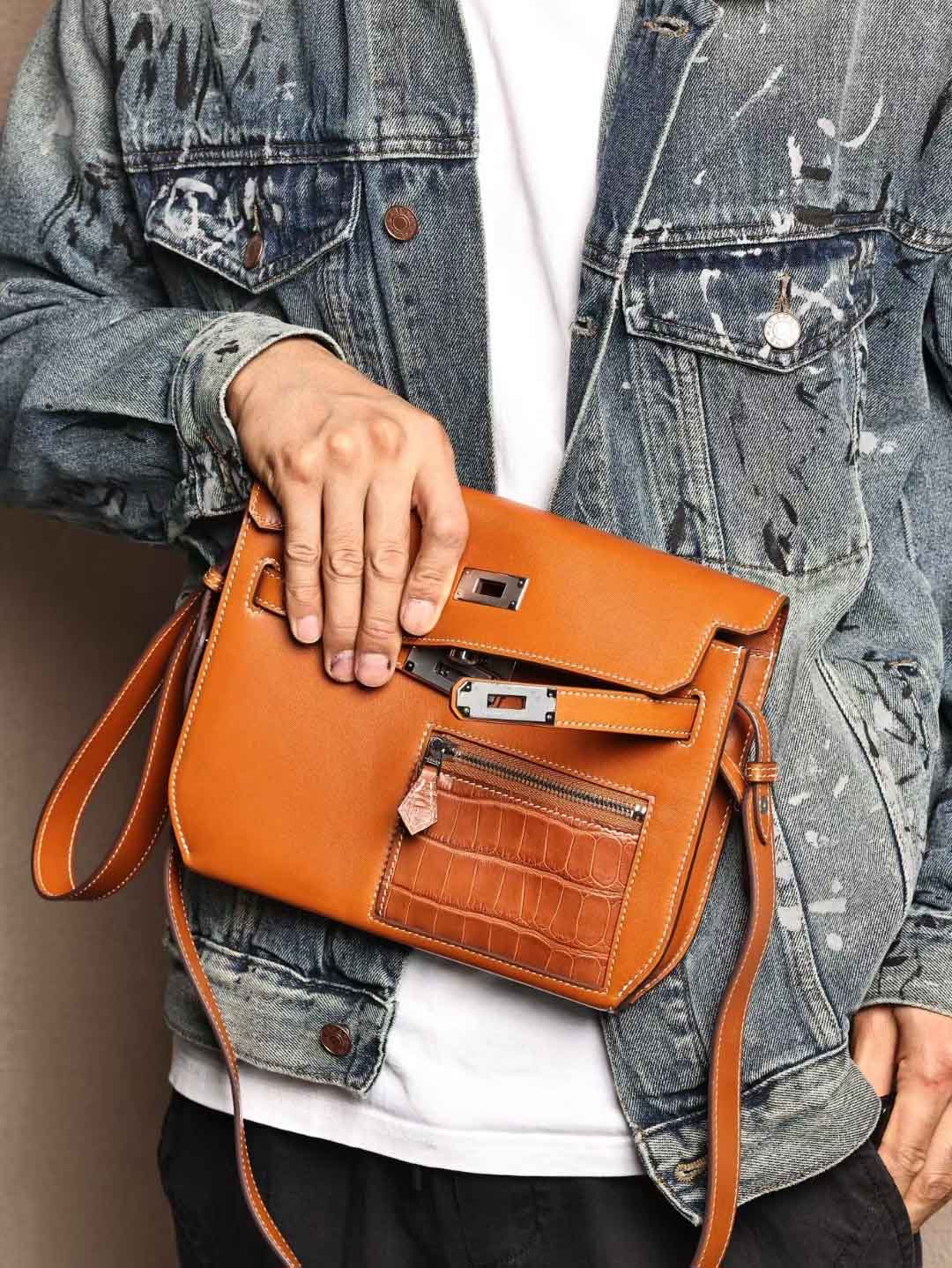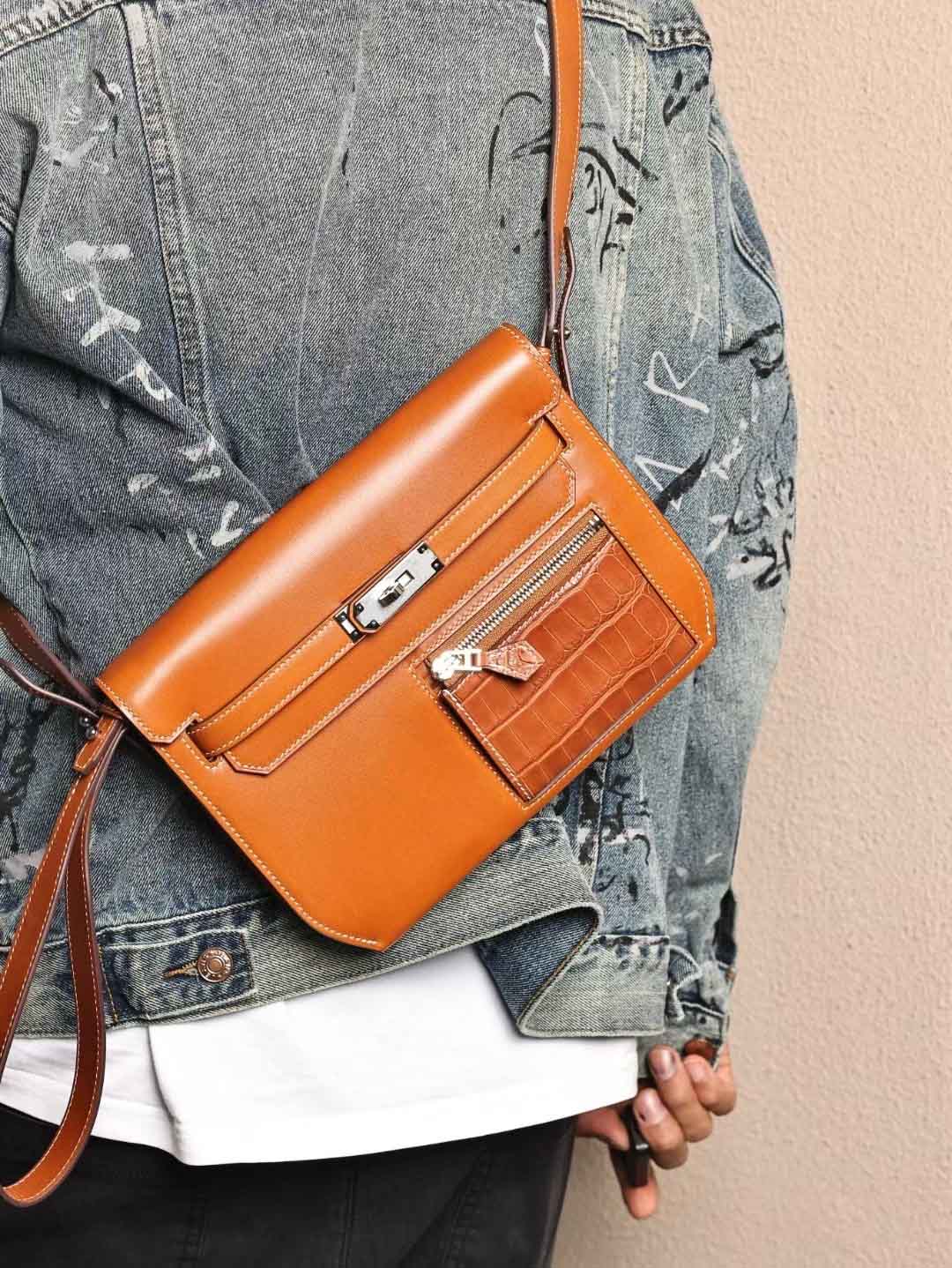 Kelly Depeches25手拿包,金棕色Box拼哑光马鞍色美洲鳄口袋,实拍现货。